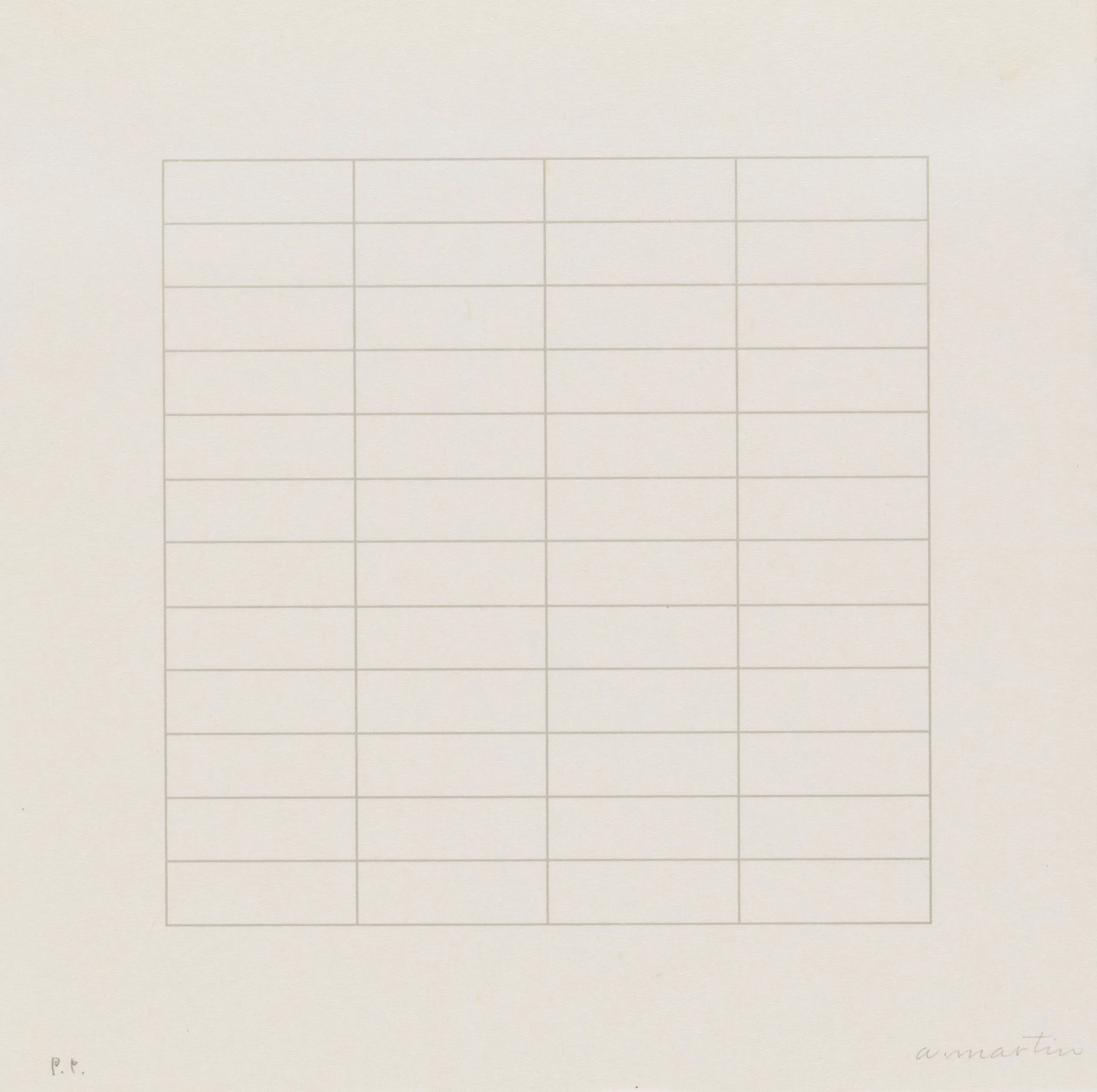 Print on off-white paper featuring a square grid of fine graphite lines forming four columns and approximately fifteen rows of horizontal rectangles, centered with wide margins on all sides.