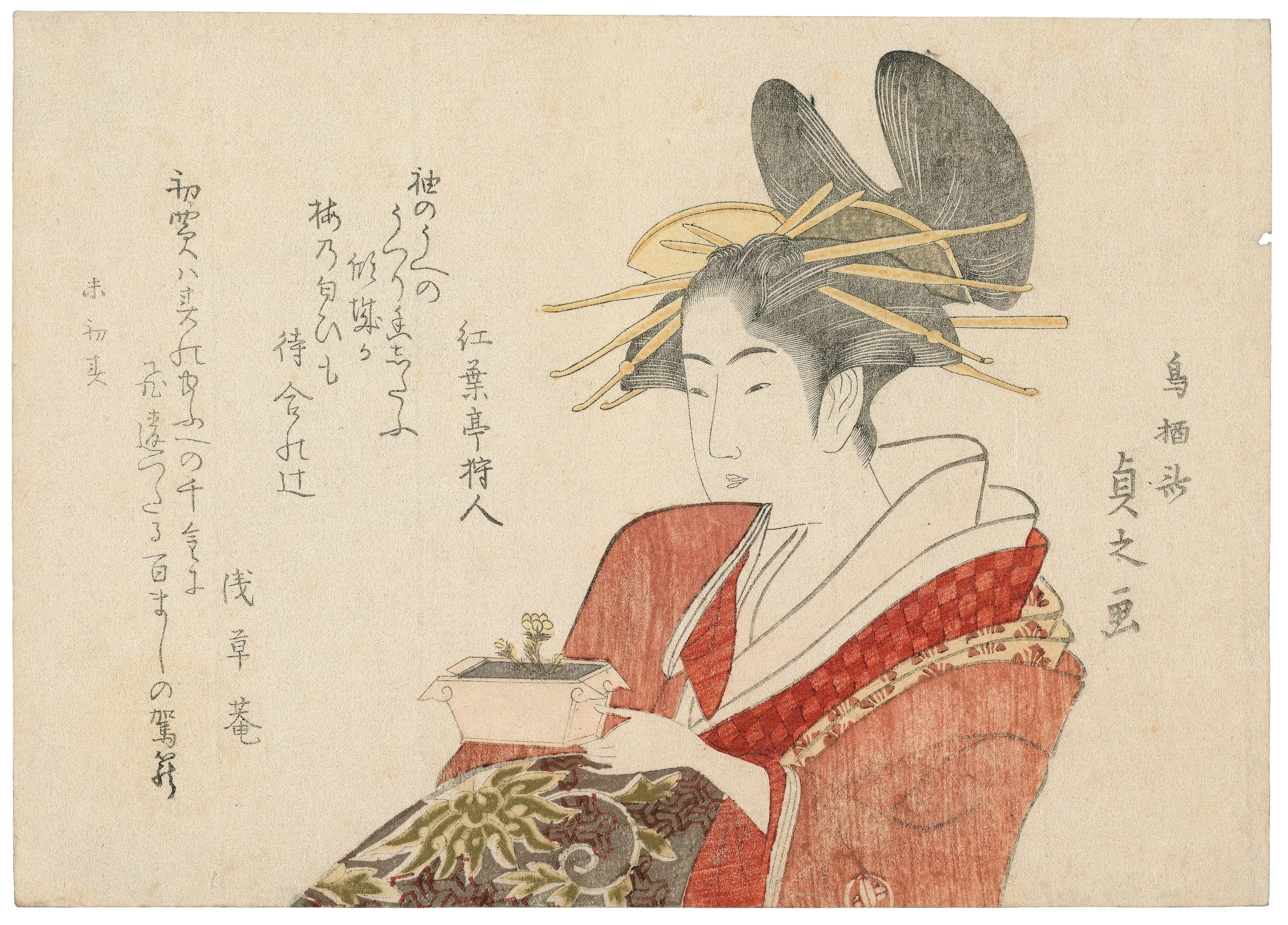 - Surimono; color woodblock print with brass and embossing