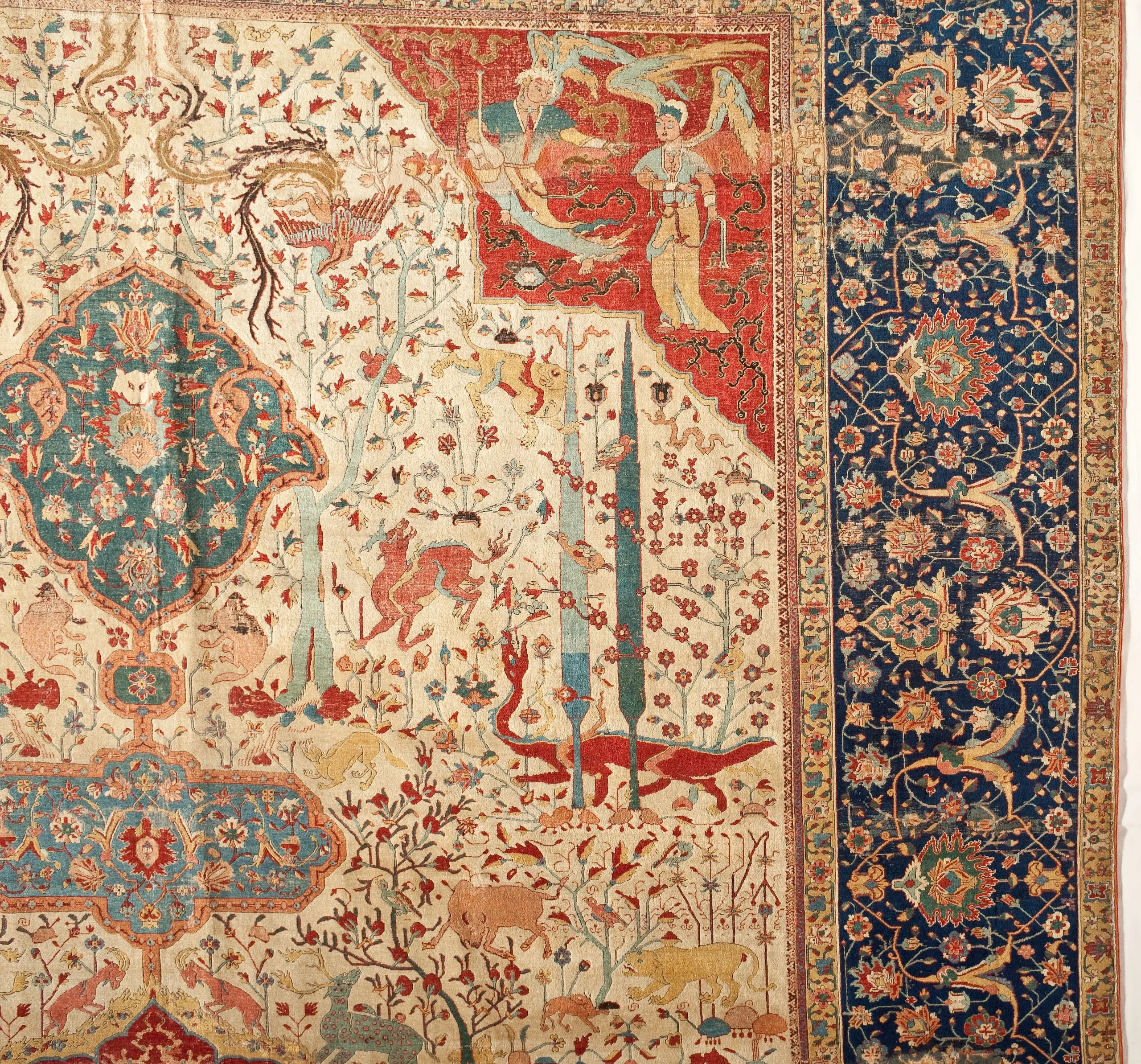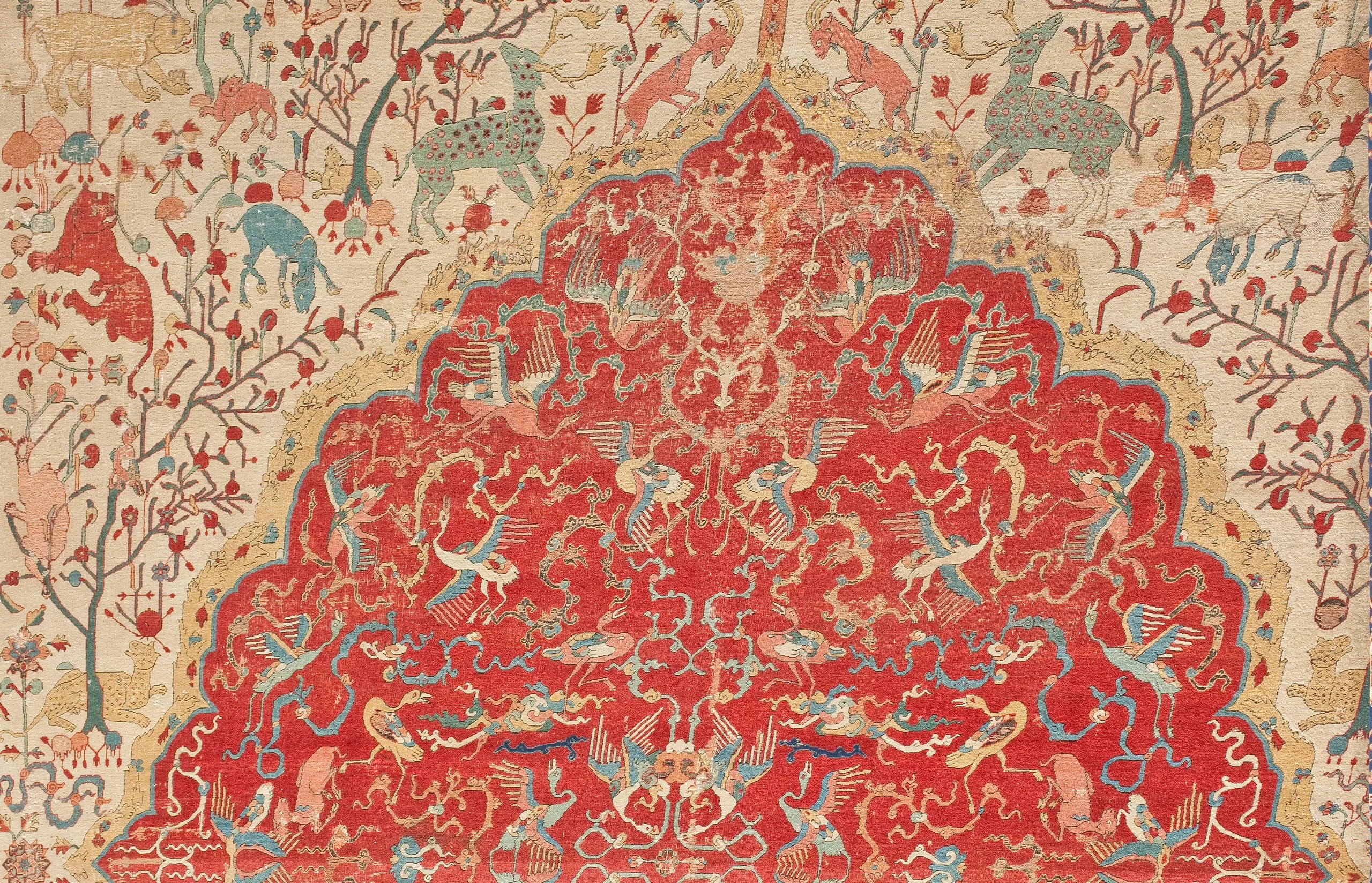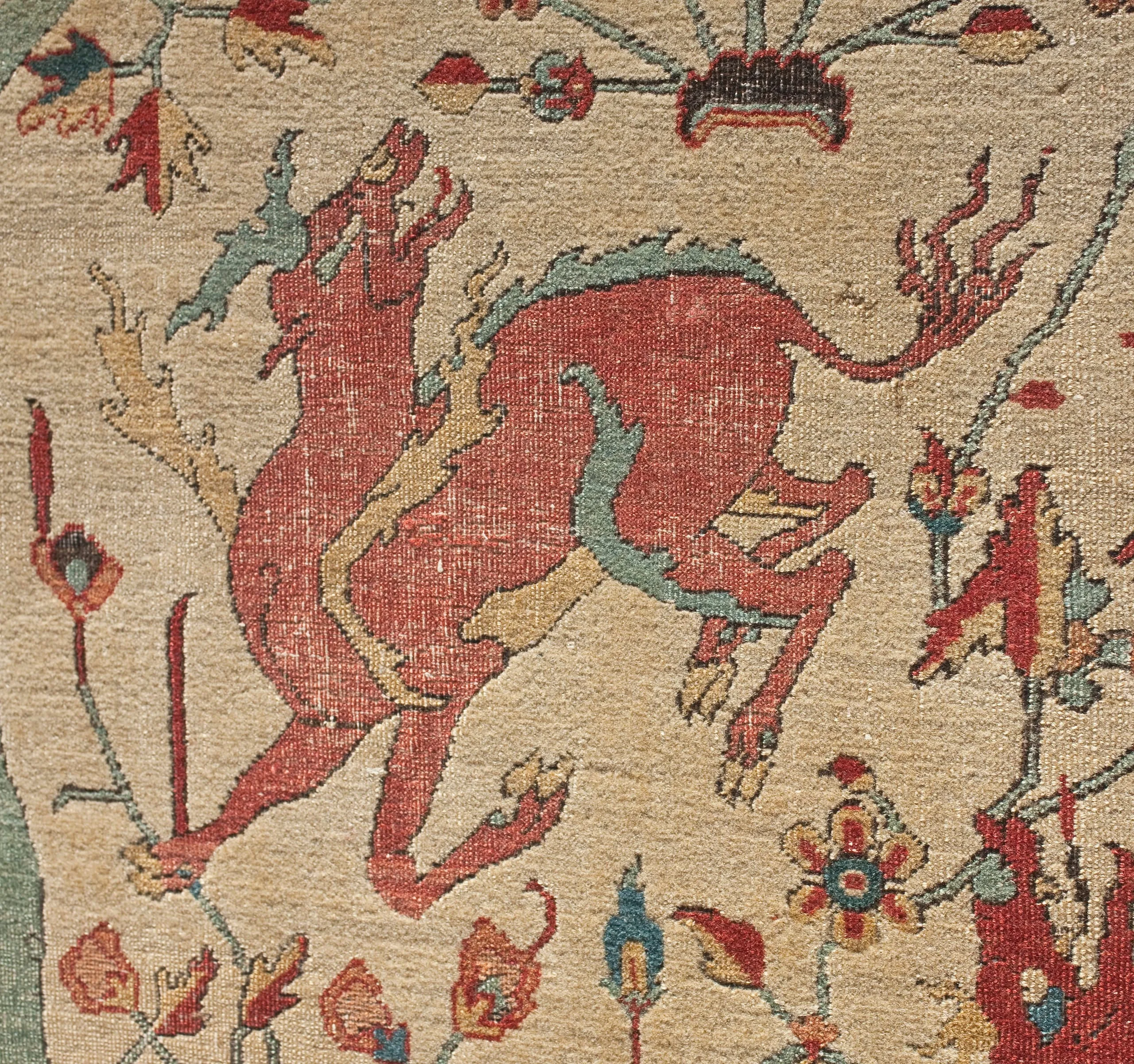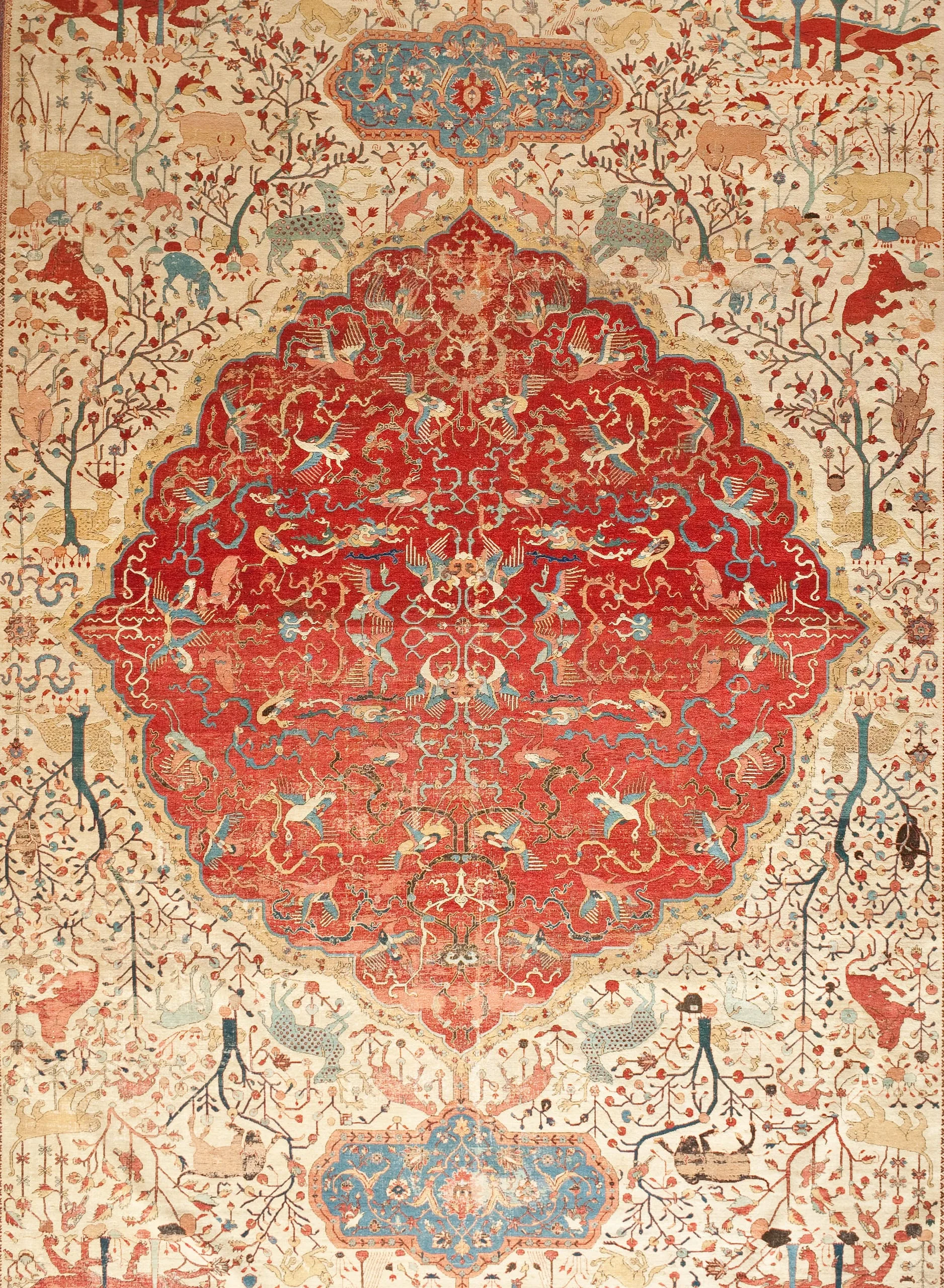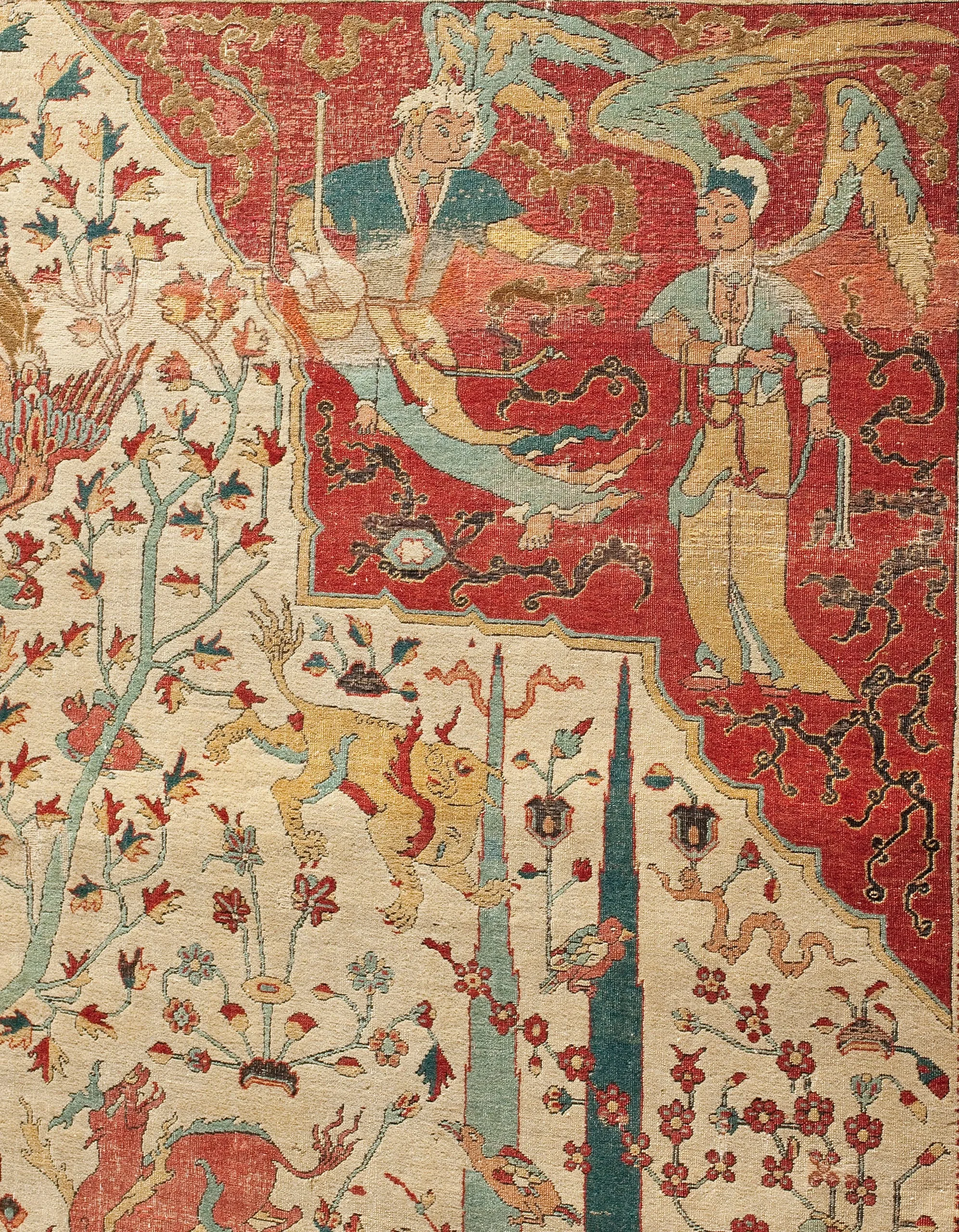 As is typical of the design structure of such sixteenth-century Persian carpets, each quarter repeats exactly. The carpet is generically classified as a medallion carpet with flora and fauna, although its decoration more specifically suggests a paradisiacal garden with an abundance of trees and animals. Flowing water is indicated by the smaller blue medallions, which are reminiscent of linked pools. What clearly makes this an unearthly setting are the dragons, phoenixes, and qilins (creatures borrowed from Chinese mythology), and especially the winged celestial beings, or houris, in each of the quarter medallions.