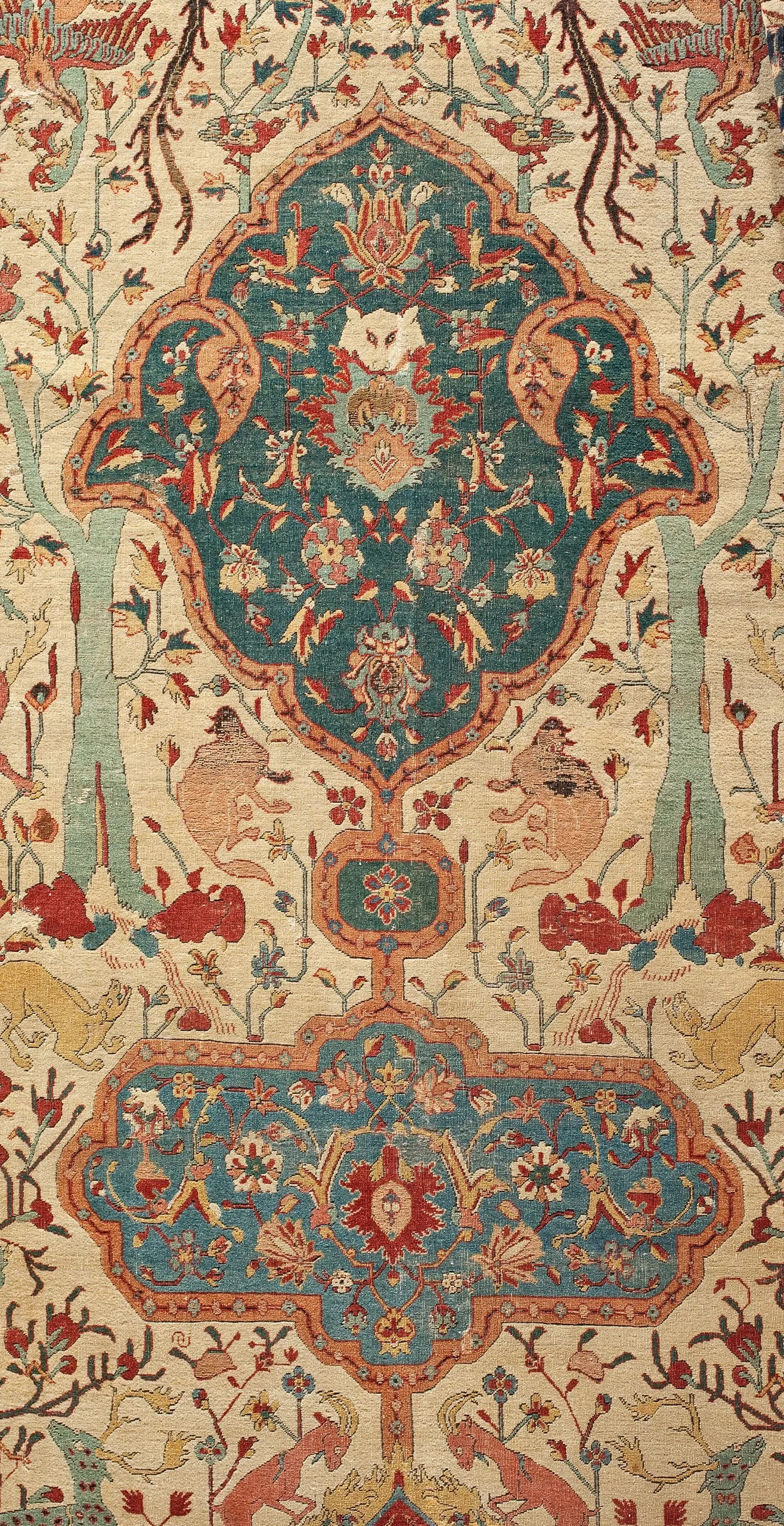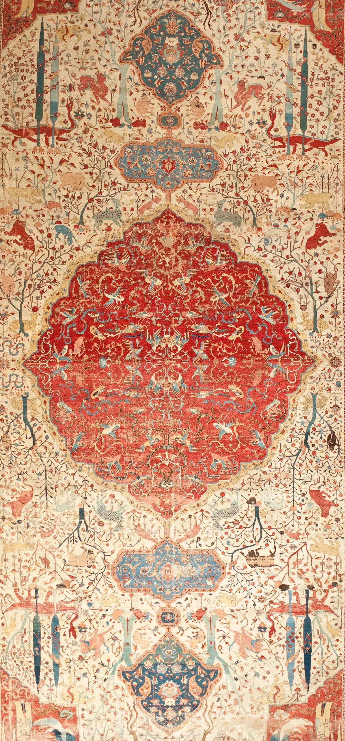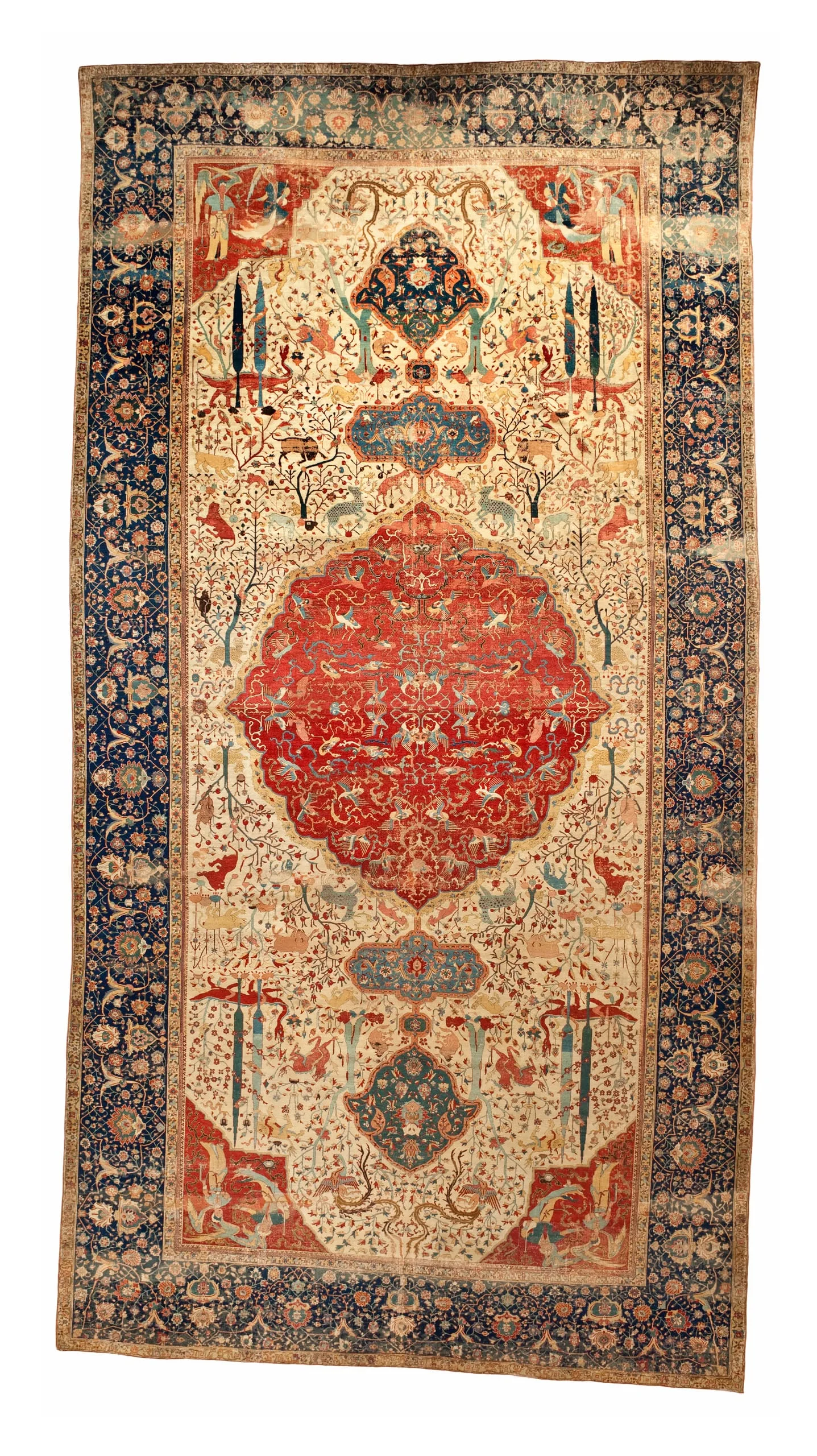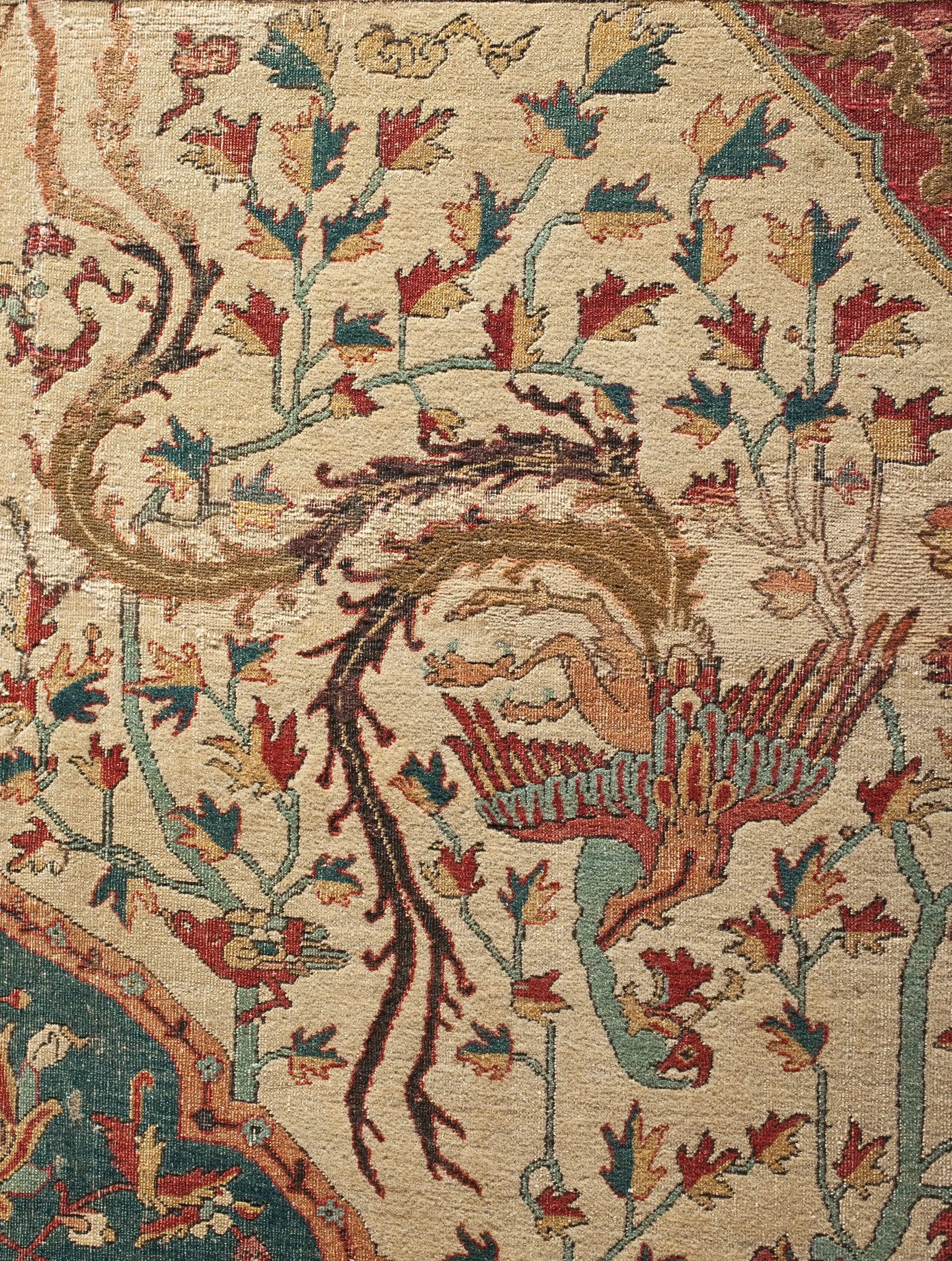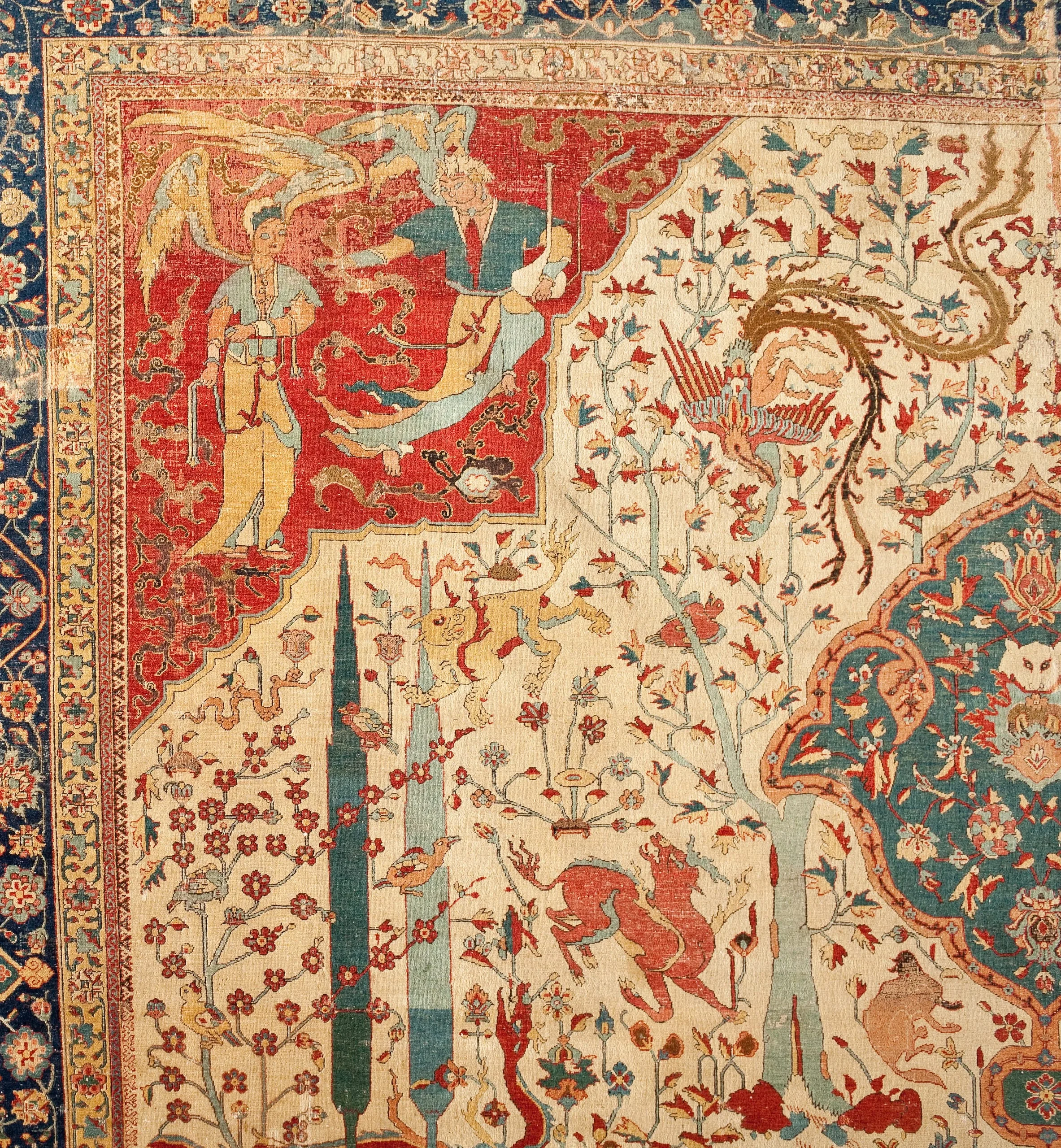 As is typical of the design structure of such sixteenth-century Persian carpets, each quarter repeats exactly. The carpet is generically classified as a medallion carpet with flora and fauna, although its decoration more specifically suggests a paradisiacal garden with an abundance of trees and animals. Flowing water is indicated by the smaller blue medallions, which are reminiscent of linked pools. What clearly makes this an unearthly setting are the dragons, phoenixes, and qilins (creatures borrowed from Chinese mythology), and especially the winged celestial beings, or houris, in each of the quarter medallions.