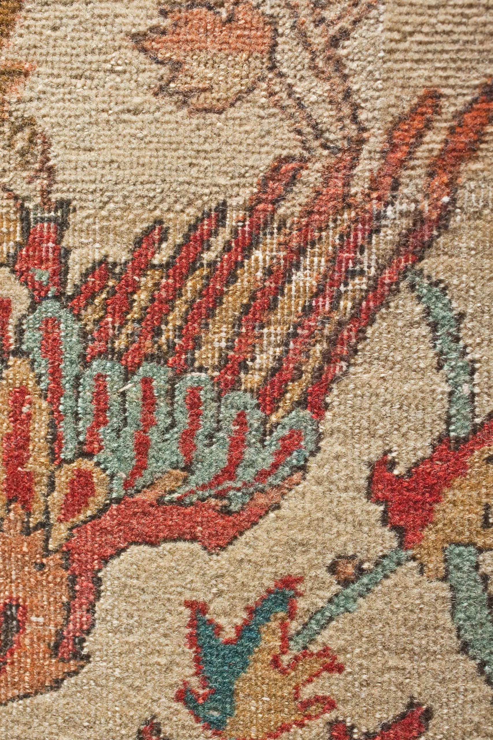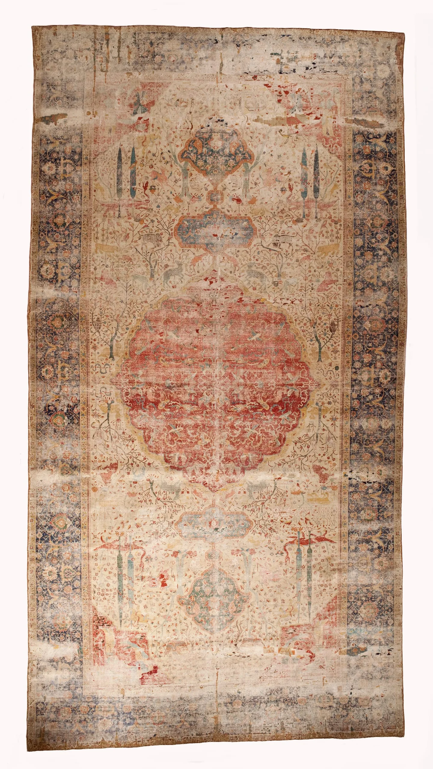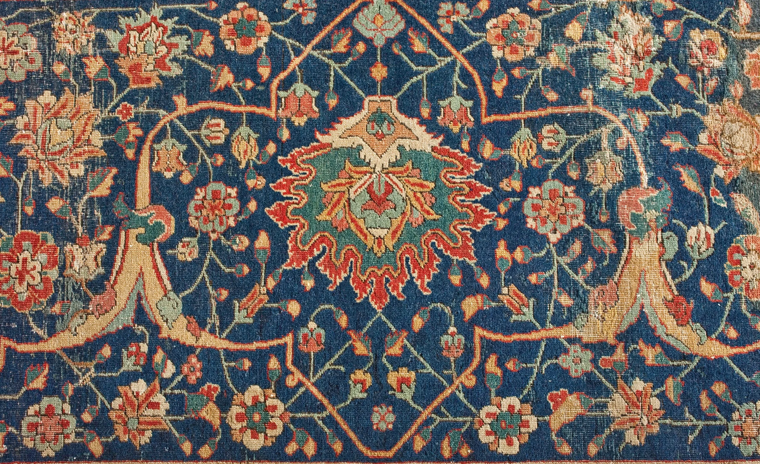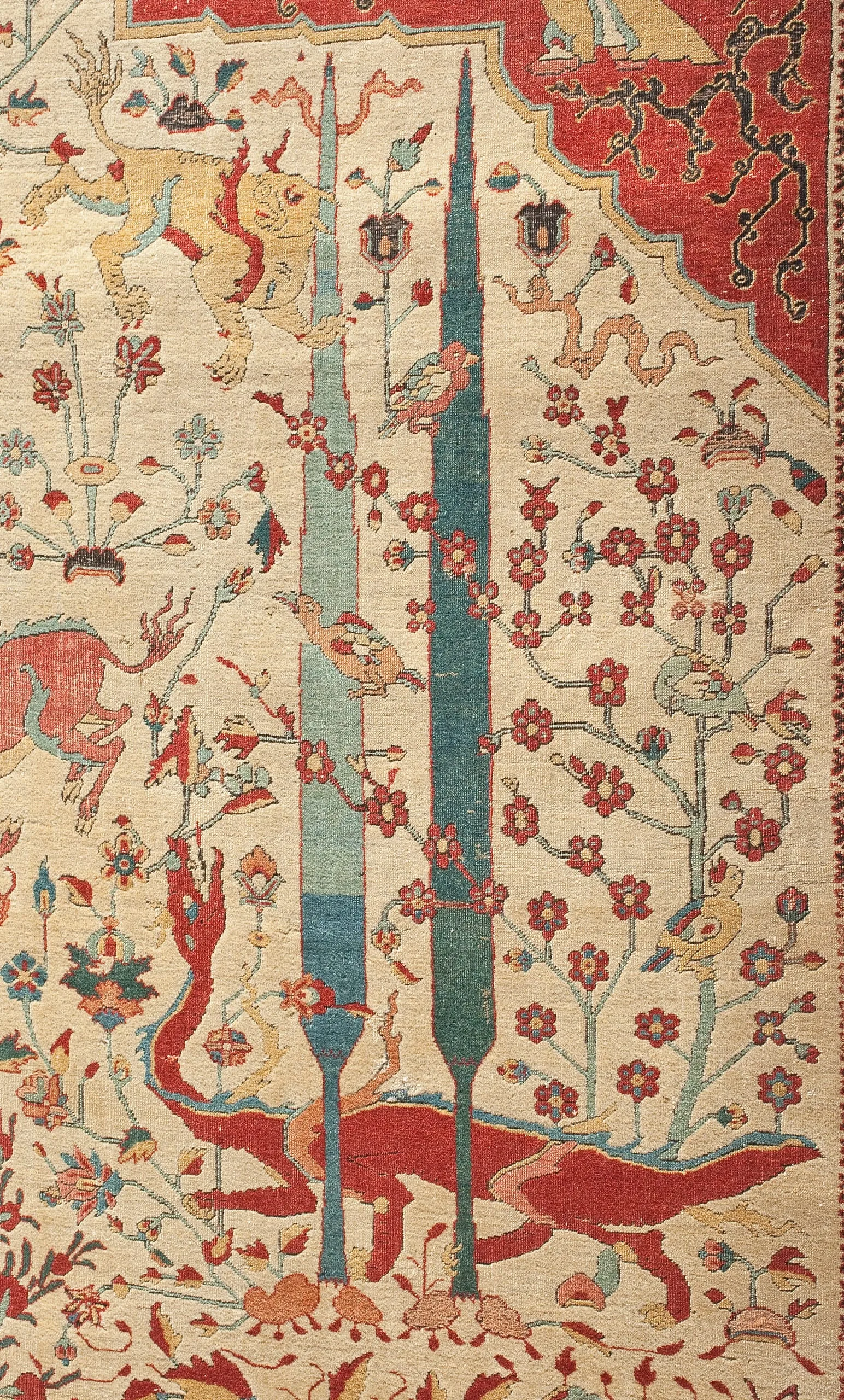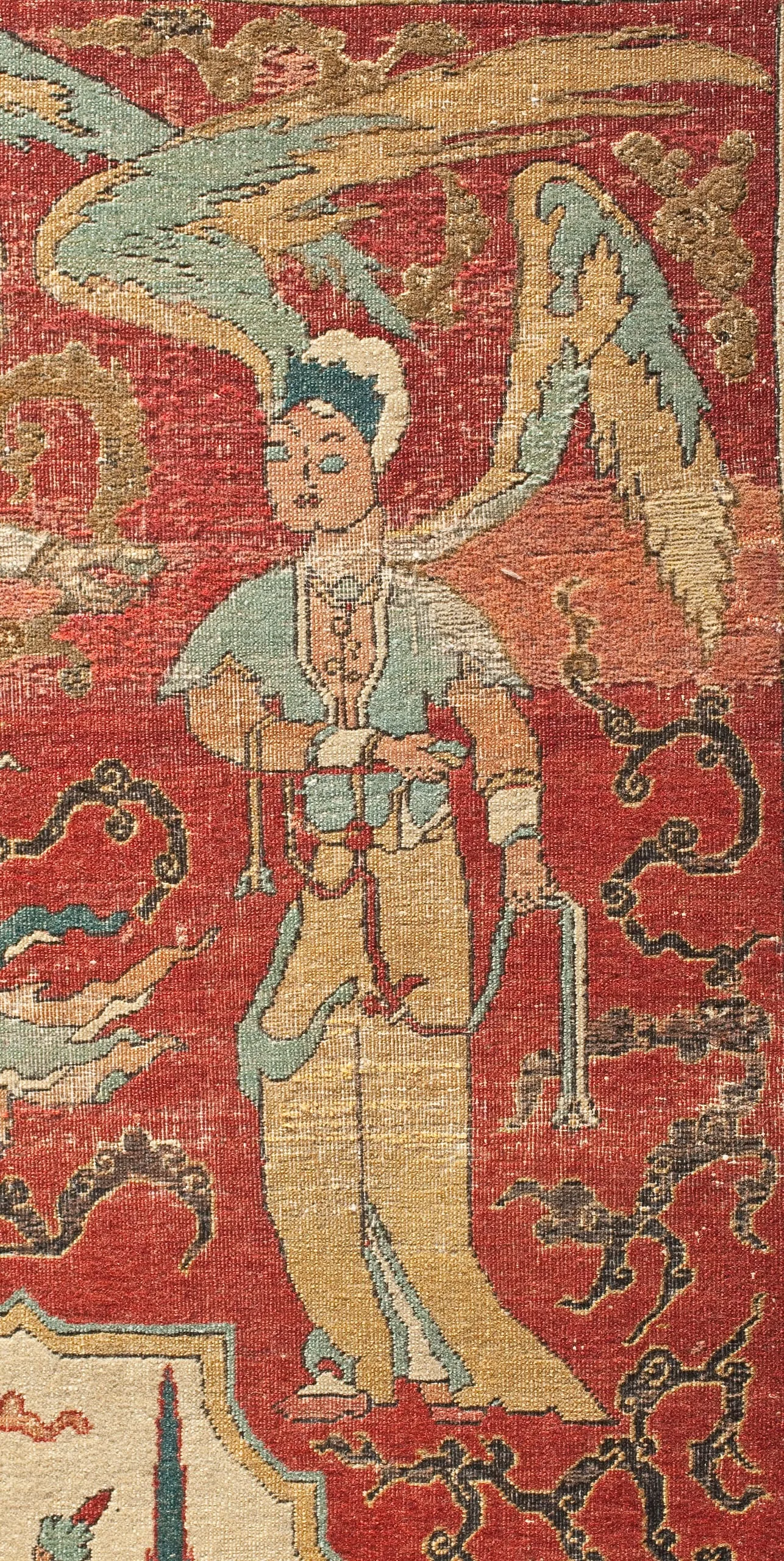 As is typical of the design structure of such sixteenth-century Persian carpets, each quarter repeats exactly. The carpet is generically classified as a medallion carpet with flora and fauna, although its decoration more specifically suggests a paradisiacal garden with an abundance of trees and animals. Flowing water is indicated by the smaller blue medallions, which are reminiscent of linked pools. What clearly makes this an unearthly setting are the dragons, phoenixes, and qilins (creatures borrowed from Chinese mythology), and especially the winged celestial beings, or houris, in each of the quarter medallions.