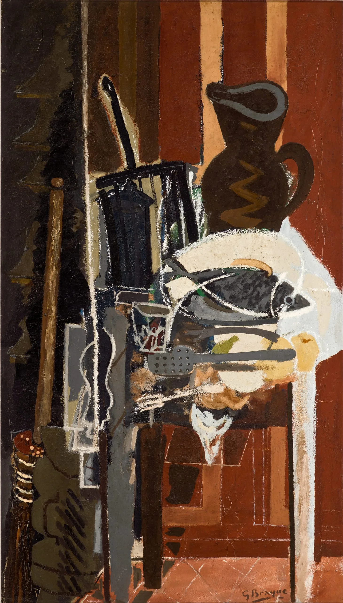 Braque later reintegrated color and volume into his still lifes, which featured objects that evoked a sense of touch, such as musical instruments and playing cards. Concert (to the left) underscores this tactility through Braque’s use of trompe l’oeil, or an optical illusion of three- dimensionality. Painted imitations of marble, wood, and wallpaper can be seen behind the table, which slopes for- ward, disrupting traditional perspective. Braque emphasized tactility in several ways, such as incorporating strips of paper in a technique called papier collé and mixing sand with gesso and paint, as seen in Kitchen Table with Grill (1943–44) on the adjacent wall.