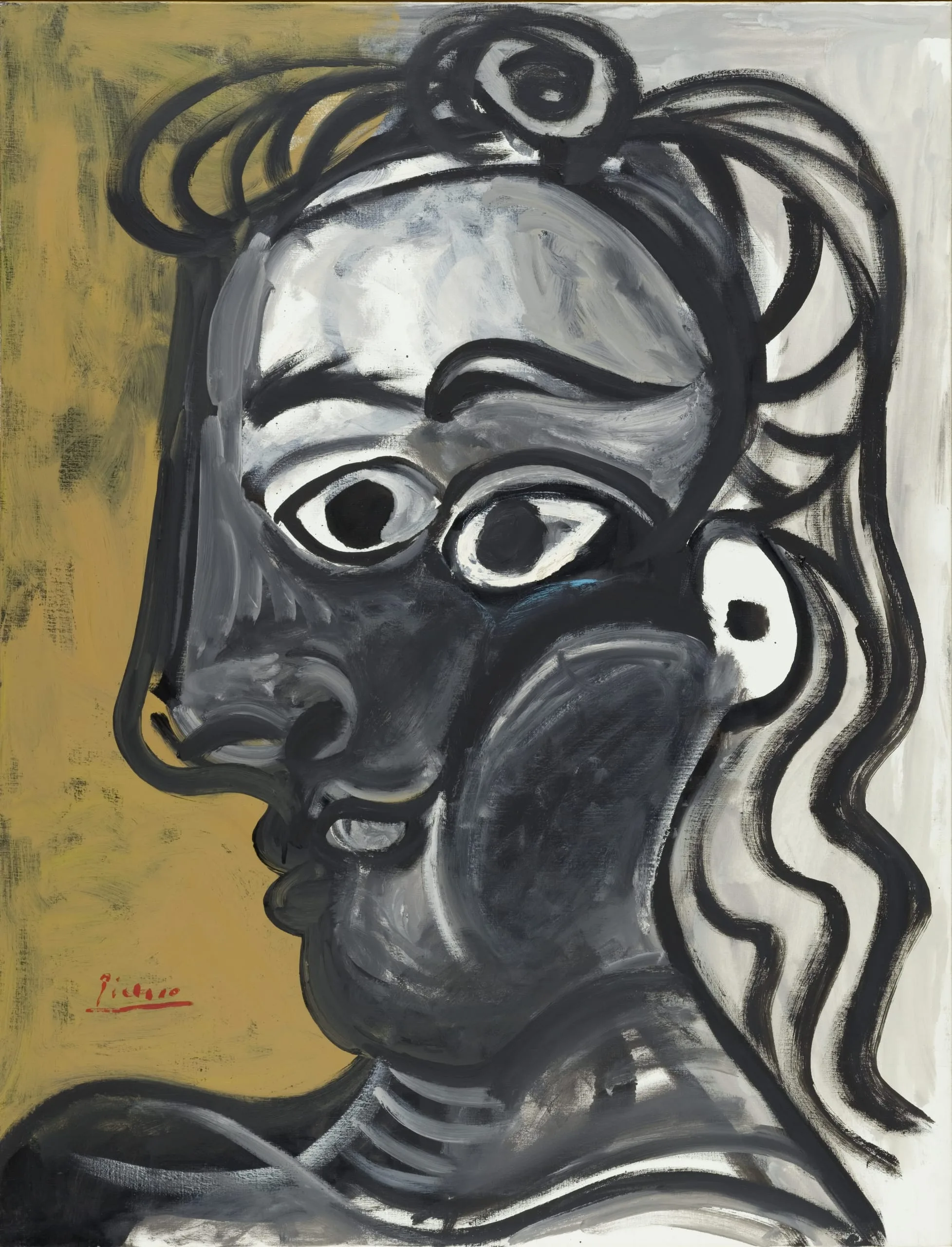 The two paintings on view in this gallery of Picasso’s second wife, Jacqueline Roque, demonstrate what art historian Pepe Karmel has described as the artist’s “ability to make a fundamentally black-and-white composition seem as rich and sensual as a brightly colored one.” With the dynamic, gestural composition of this work and the double face in Head of a Woman (Jacqueline), the paintings also suggest subtly layered aspects of Roque’s personality. The couple met in Cannes in 1952, and married in 1961; Roque provided steadfast support in the twenty years until Picasso’s death in 1973. Her distinctive large eyes, dark brows, and straight nose dominated the artist’s oeuvre in that period, making her the most sustained subject in his work.