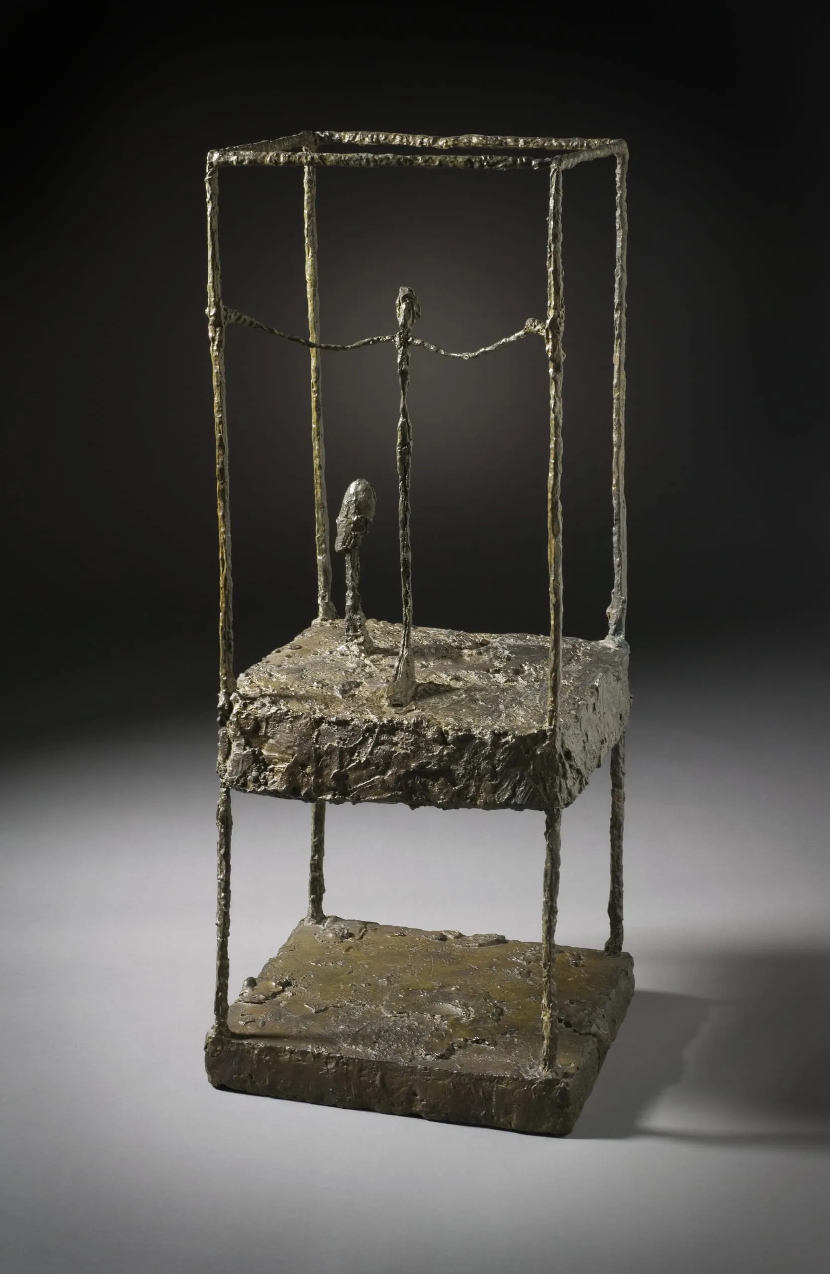 Much of Giacometti’s postwar work was seen as a fitting response to the horrors of World War II. Here a hollowed-out space contains two figures positioned at a distance from each other—they are together, yet alienated in the enclosure that surrounds them.