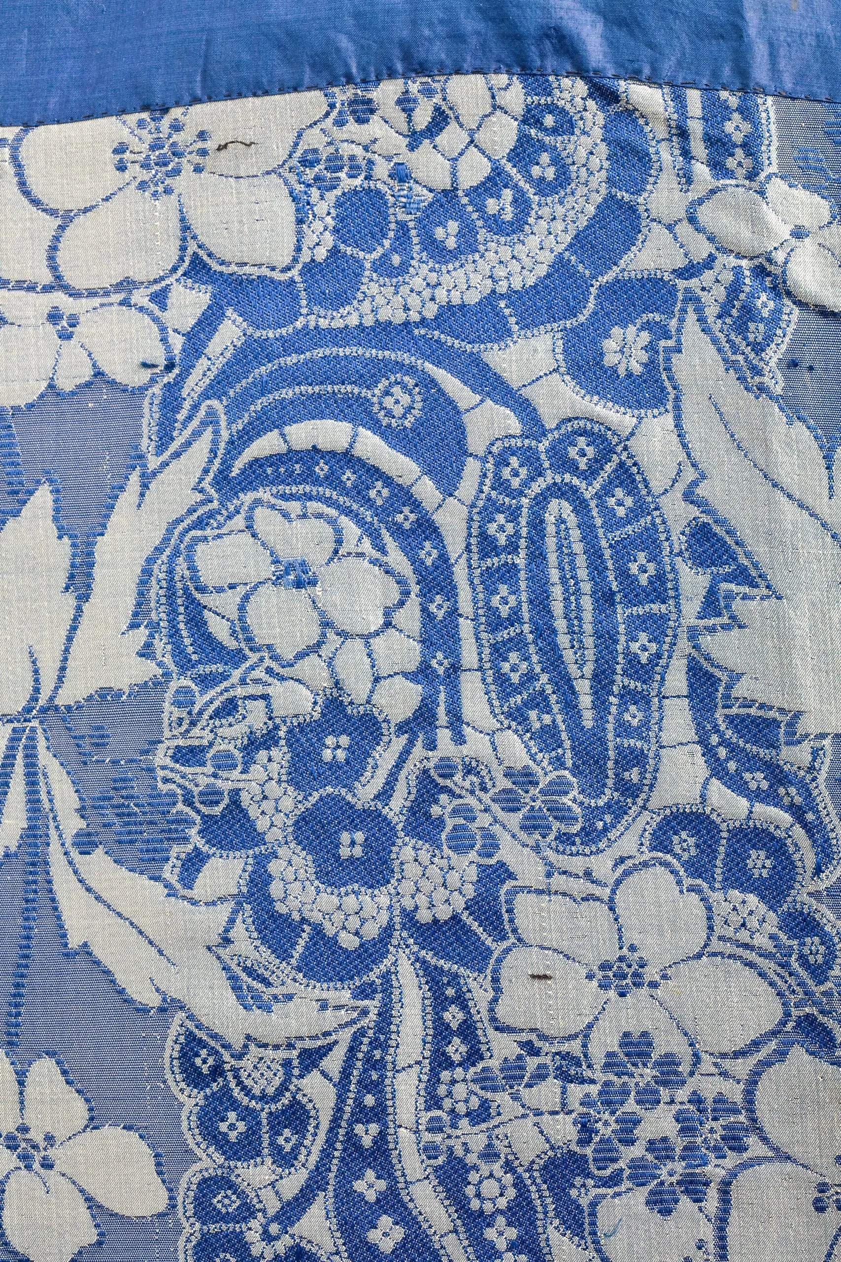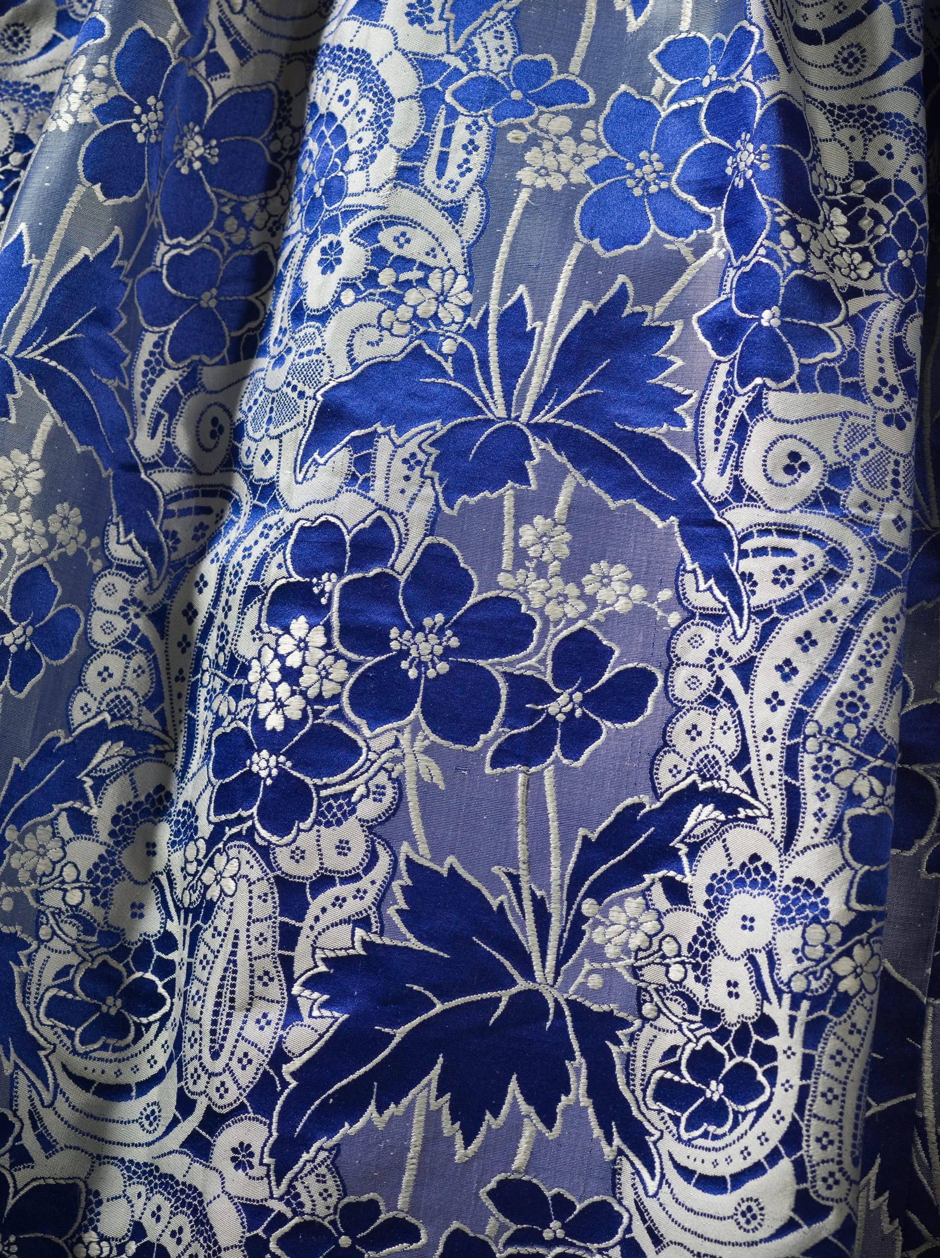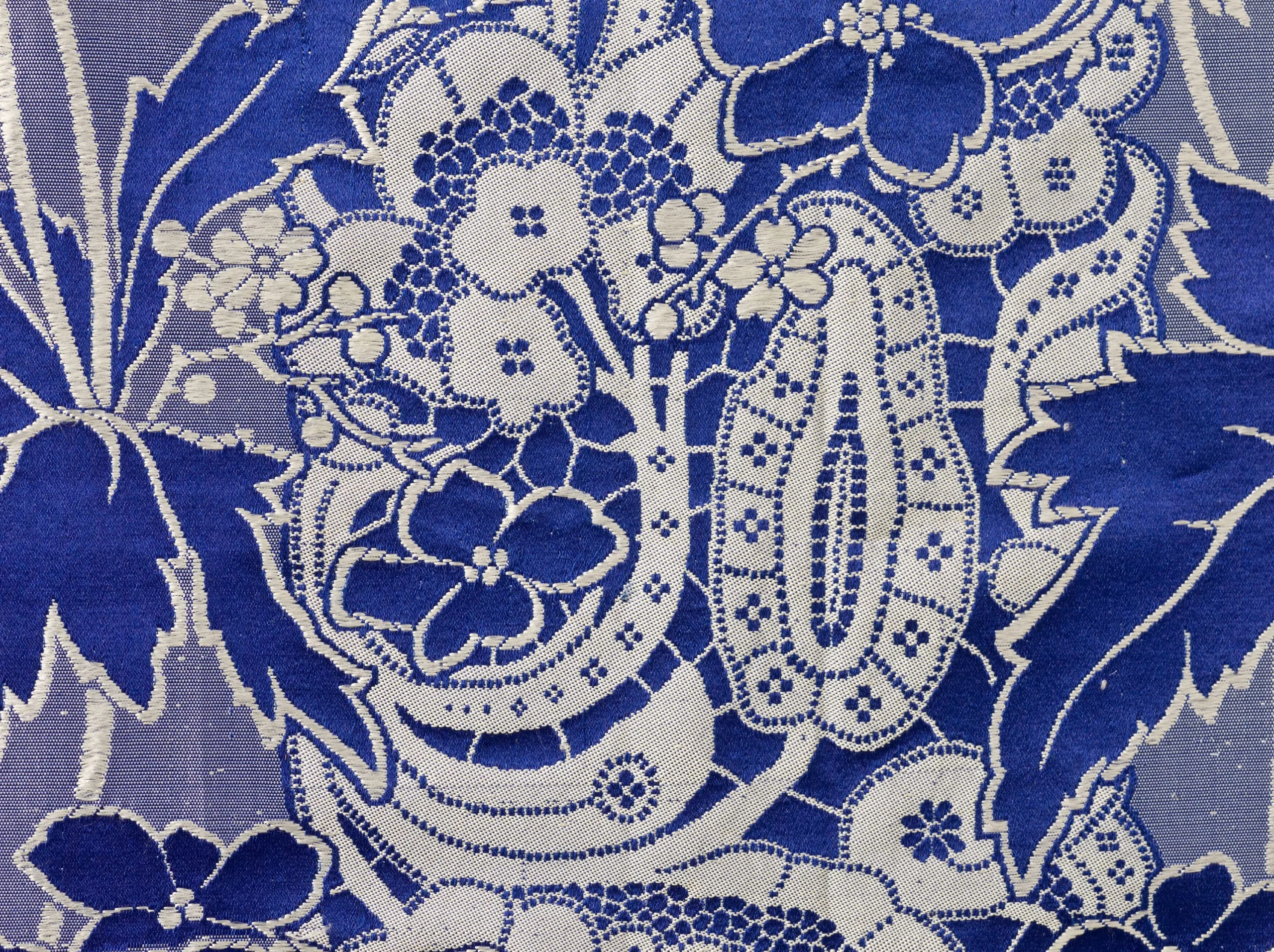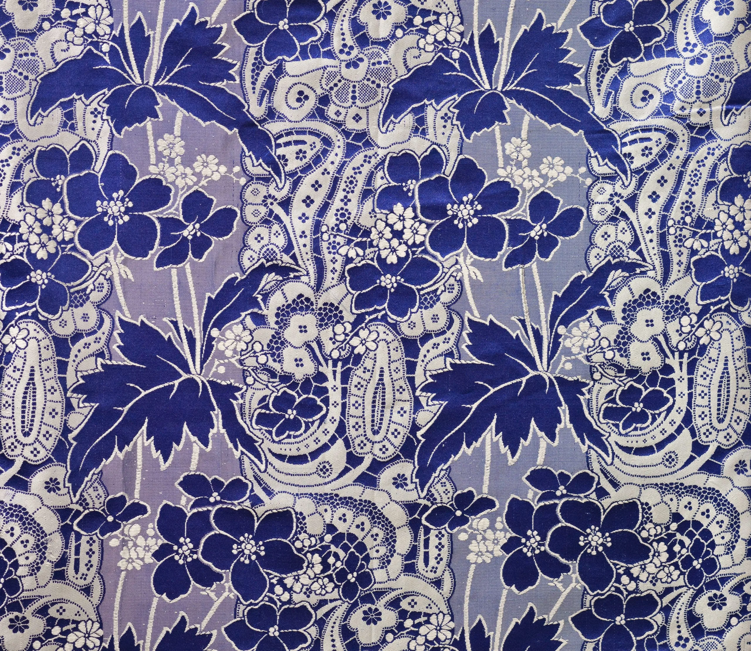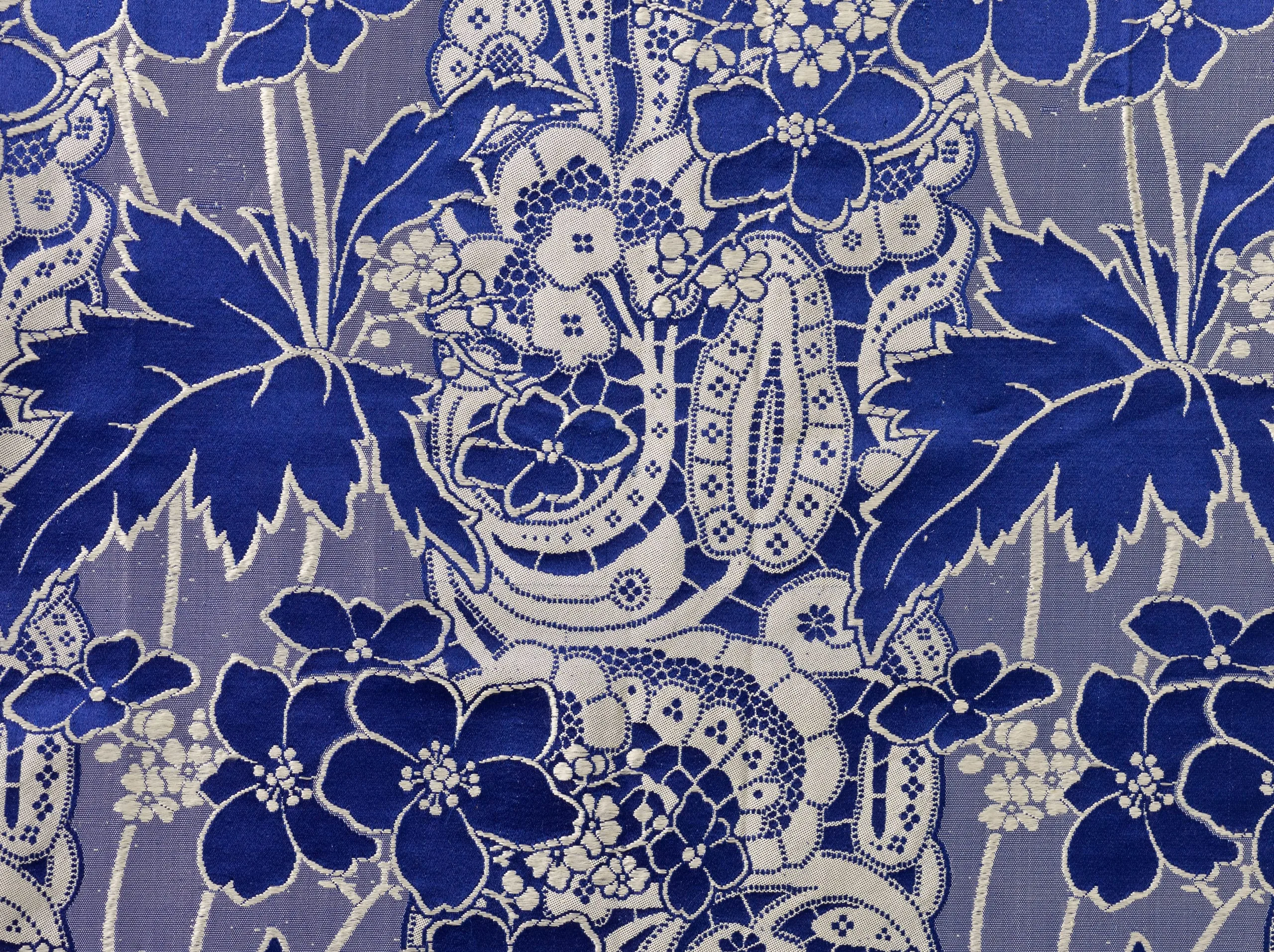 - Silk plain weave with supplementary weft-float patterning, silk satin, and silk ribbon trim