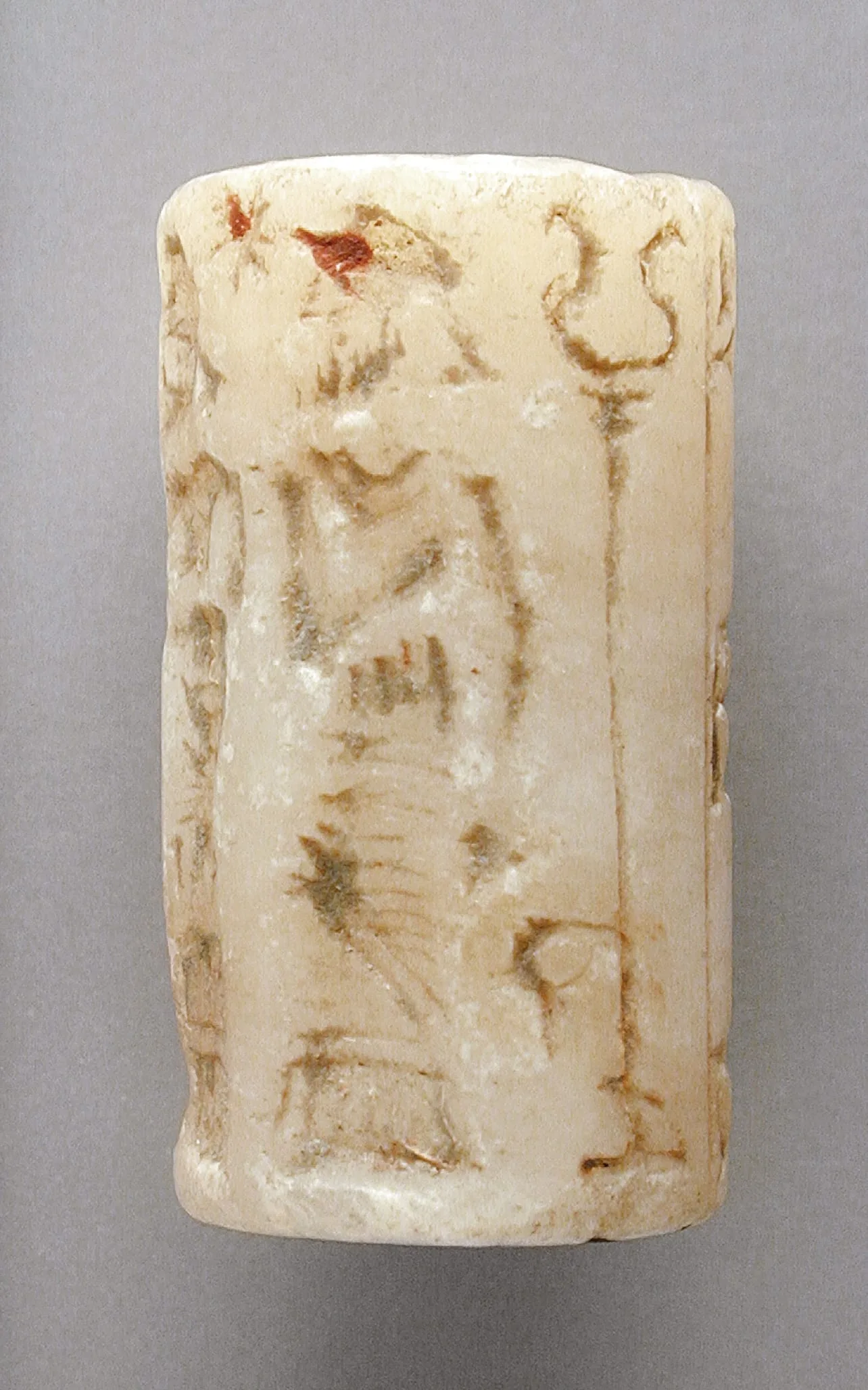 Small carved stone cylinder seal with cream and rust-brown surface, showing a standing figure in fringed garment and a staff or standard in low relief