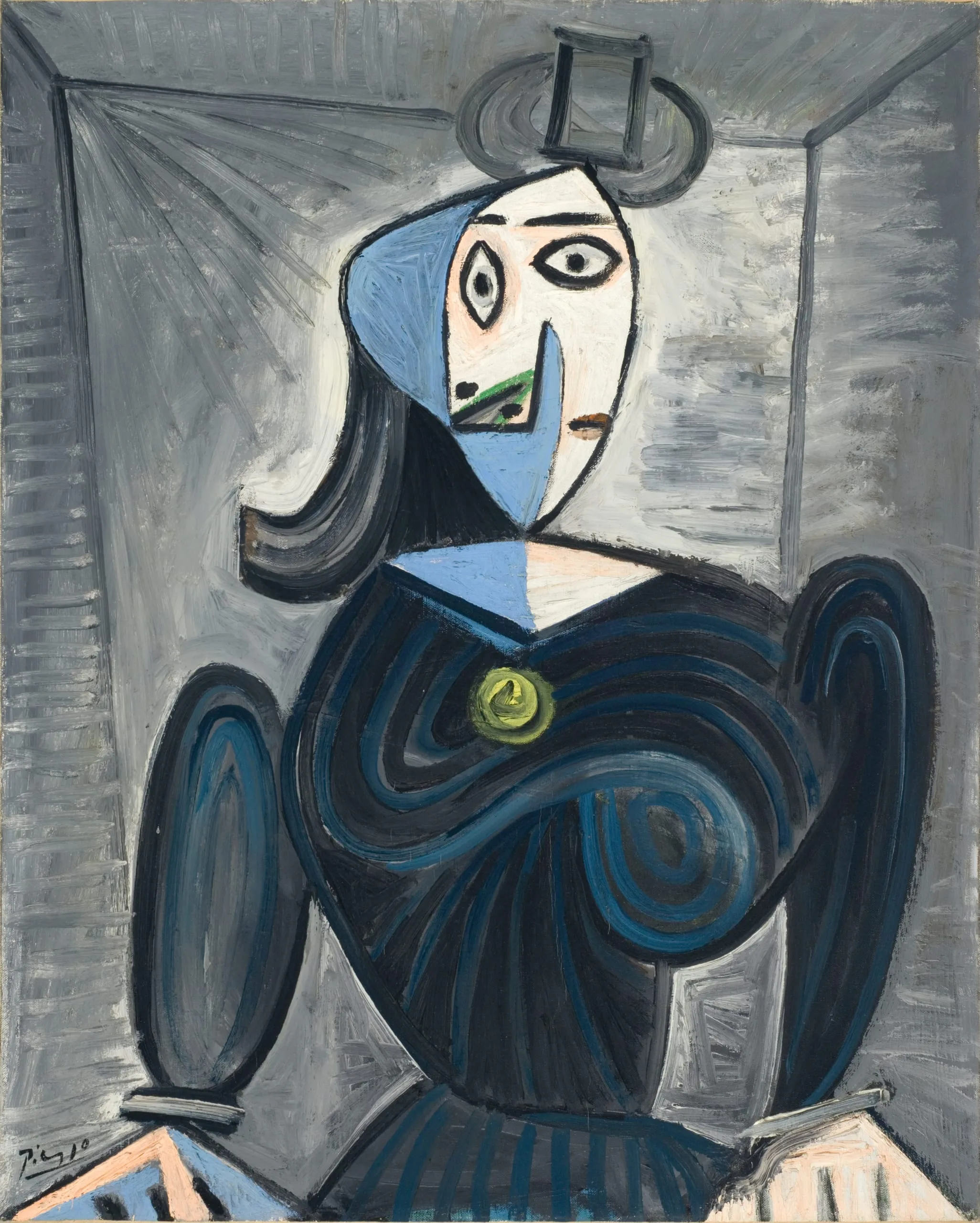 Cubist oil painting portrait of a seated woman, face split into blue and white halves, wearing a navy striped dress with a green brooch, against a gray background