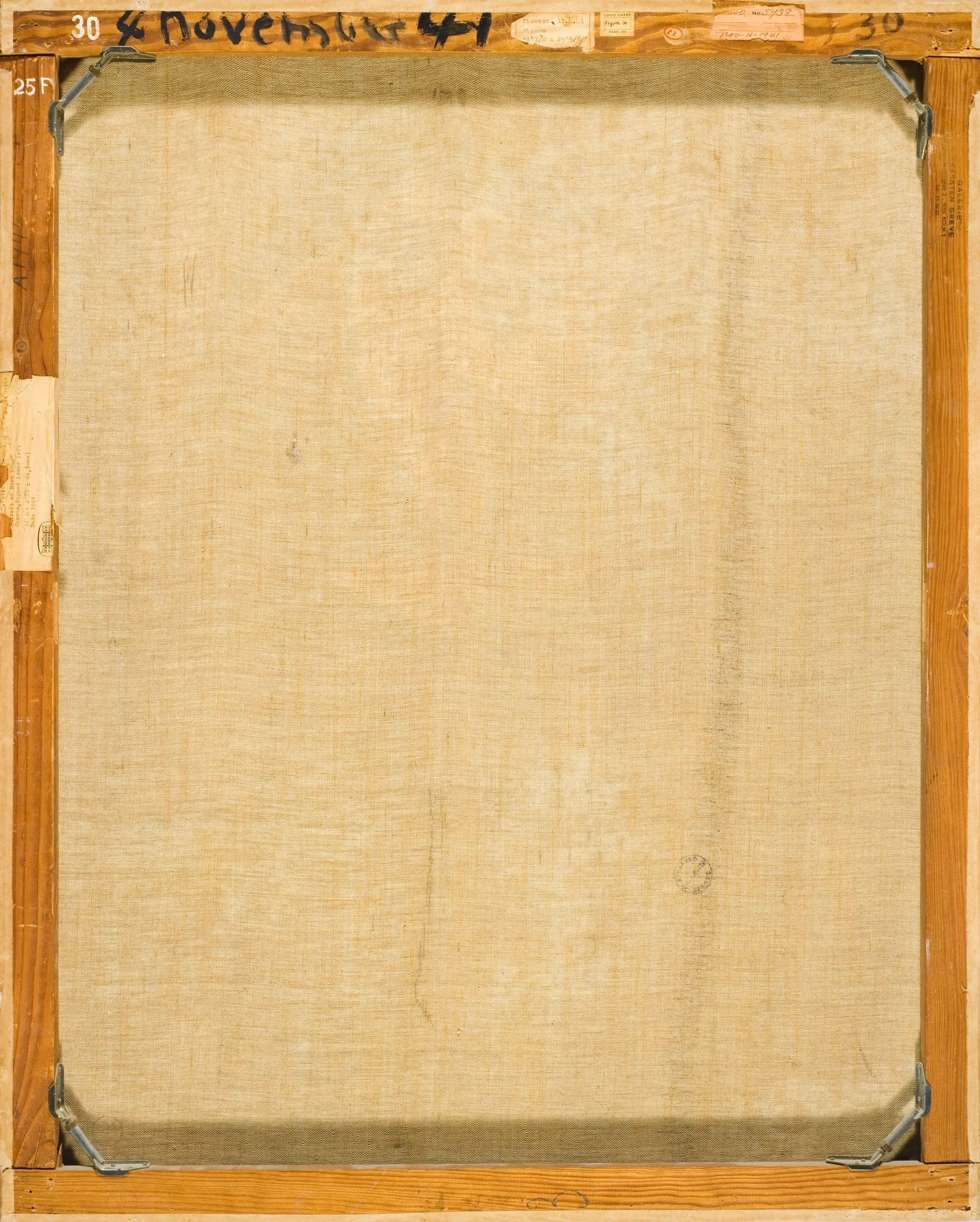 Reverse of a canvas painting on a wooden stretcher, showing aged linen fabric with handwritten inscription along the top edge reading '4 Novembre 41,' with metal corner braces and paper labels visible.