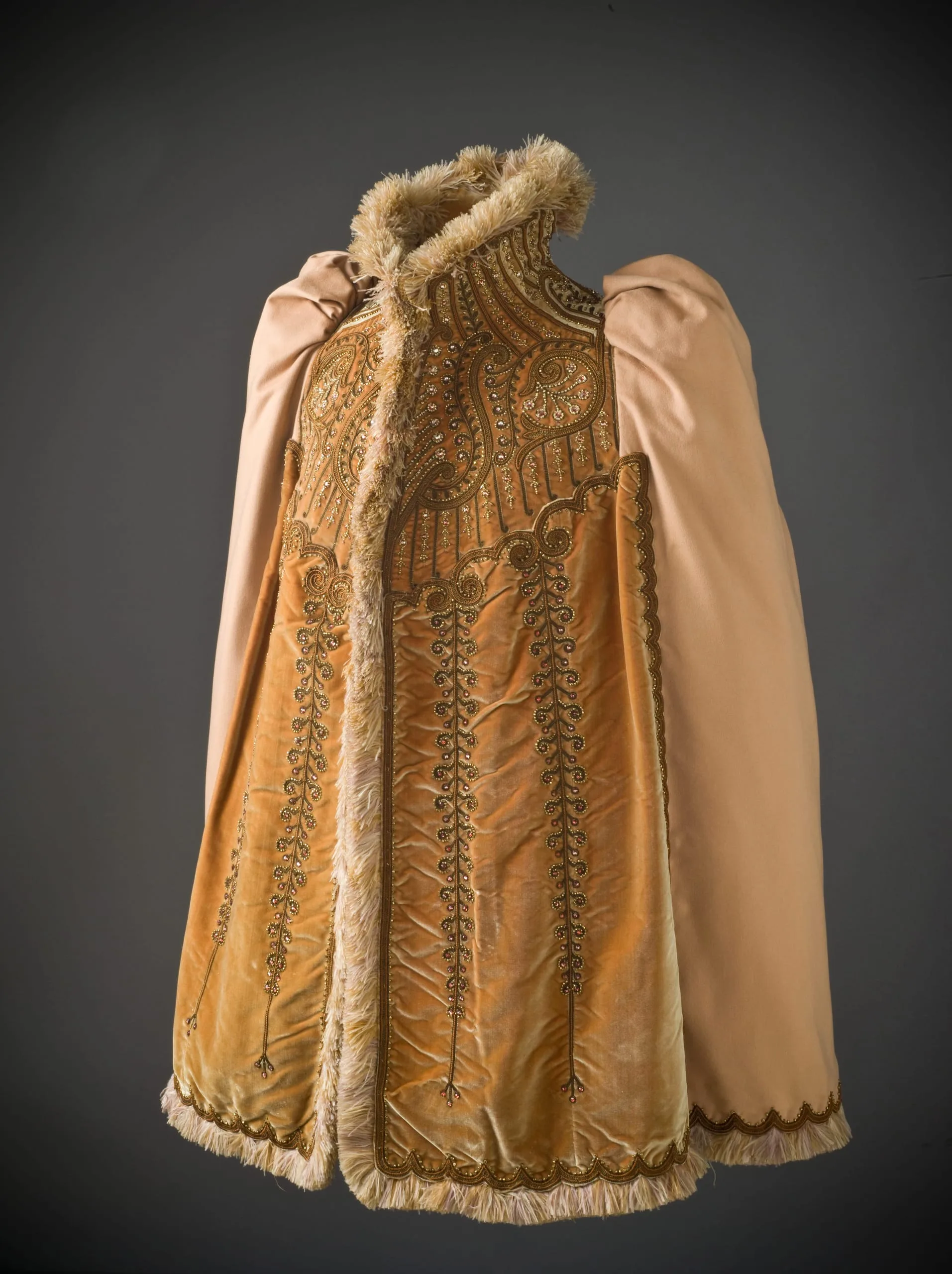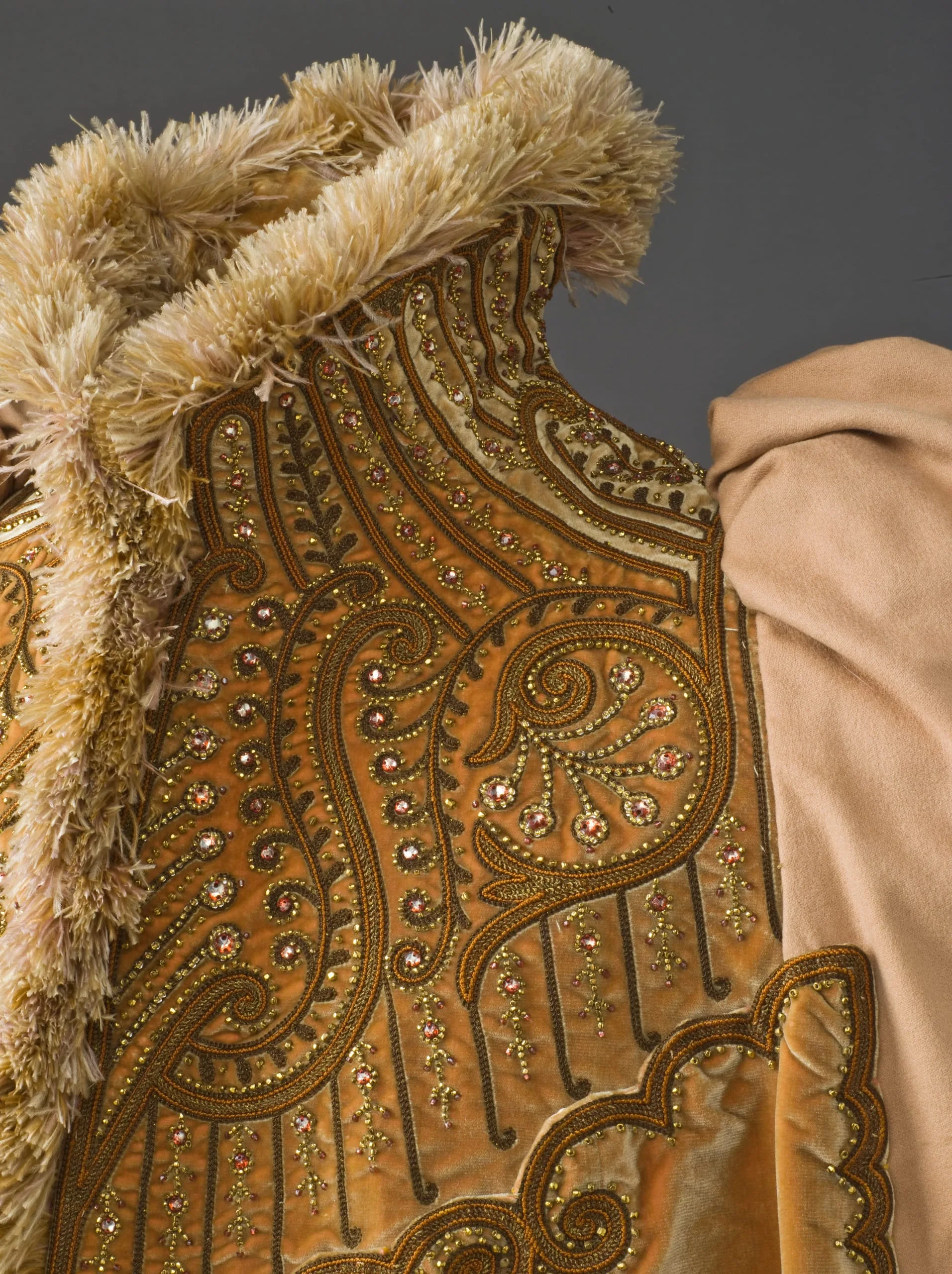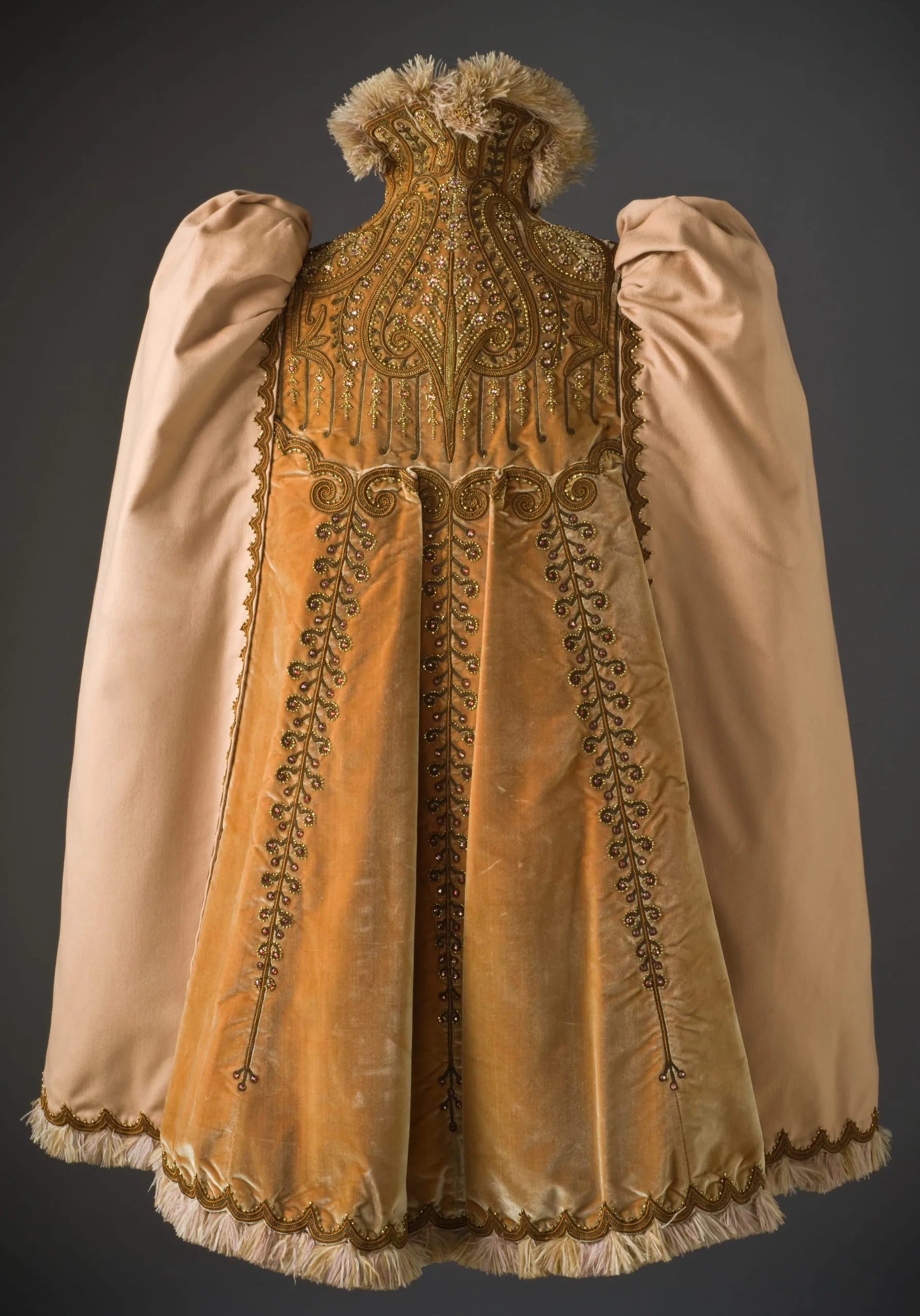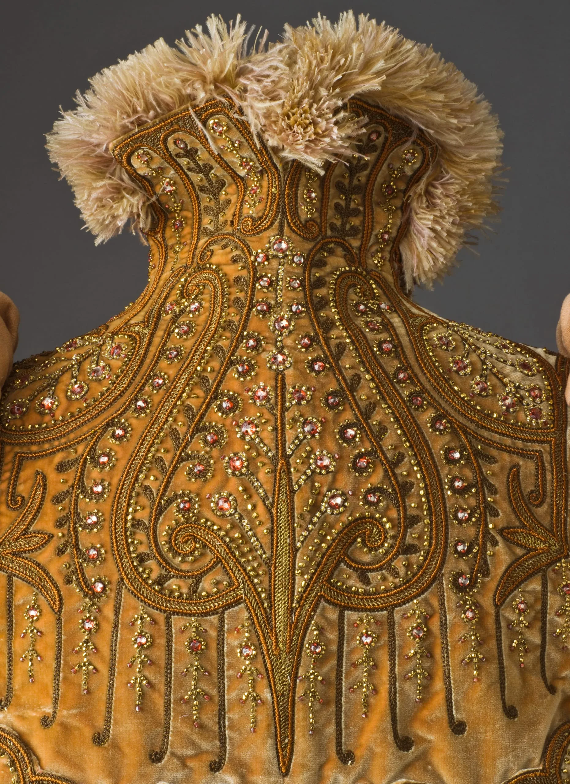 - Wool plain weave and silk velvet with silk and metallic-thread embroidery, glass beads, and ostrich-feather trim