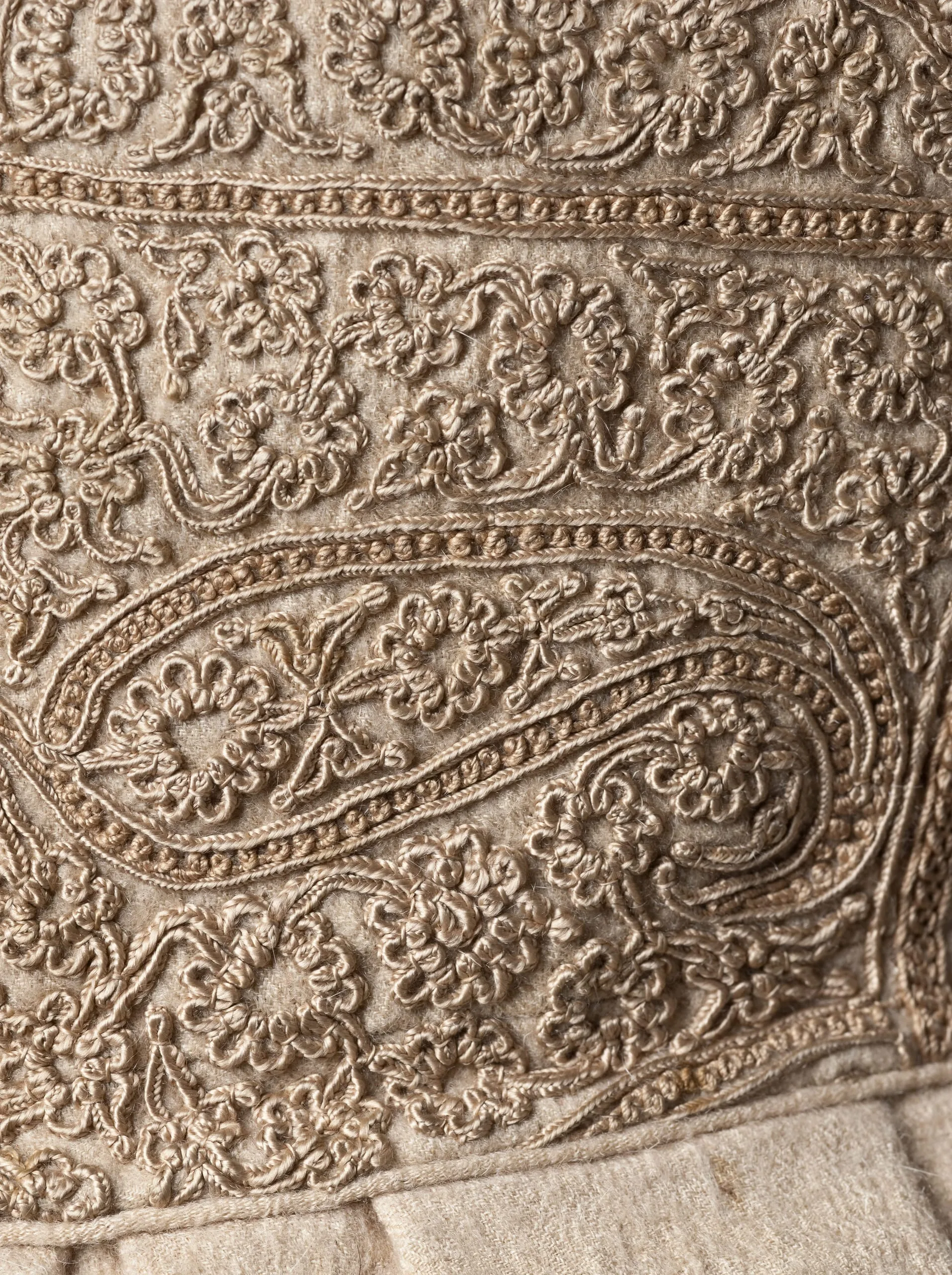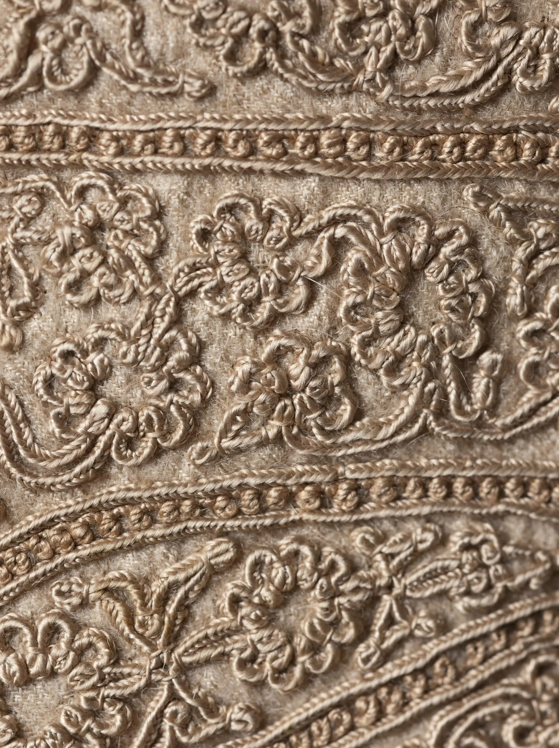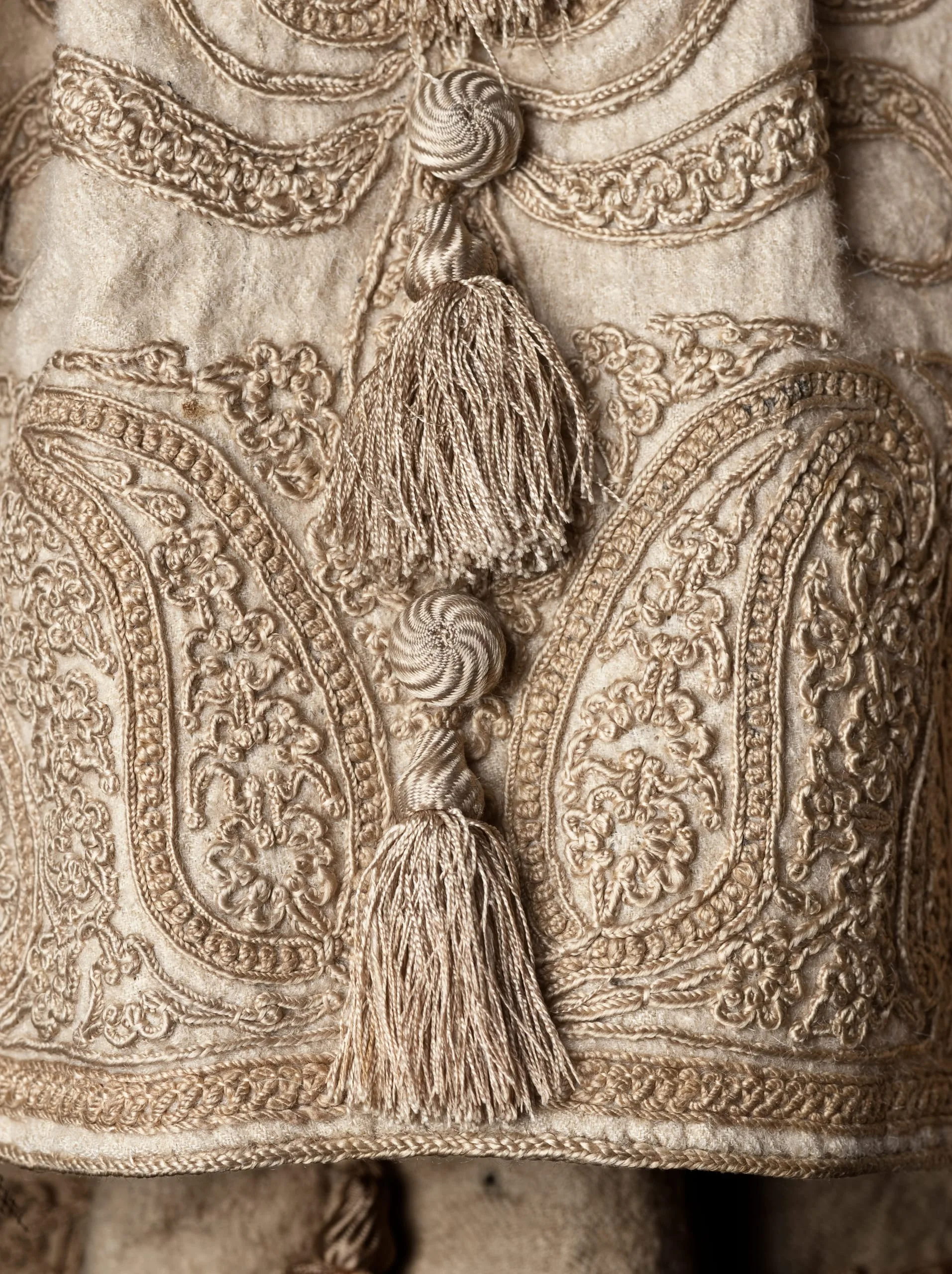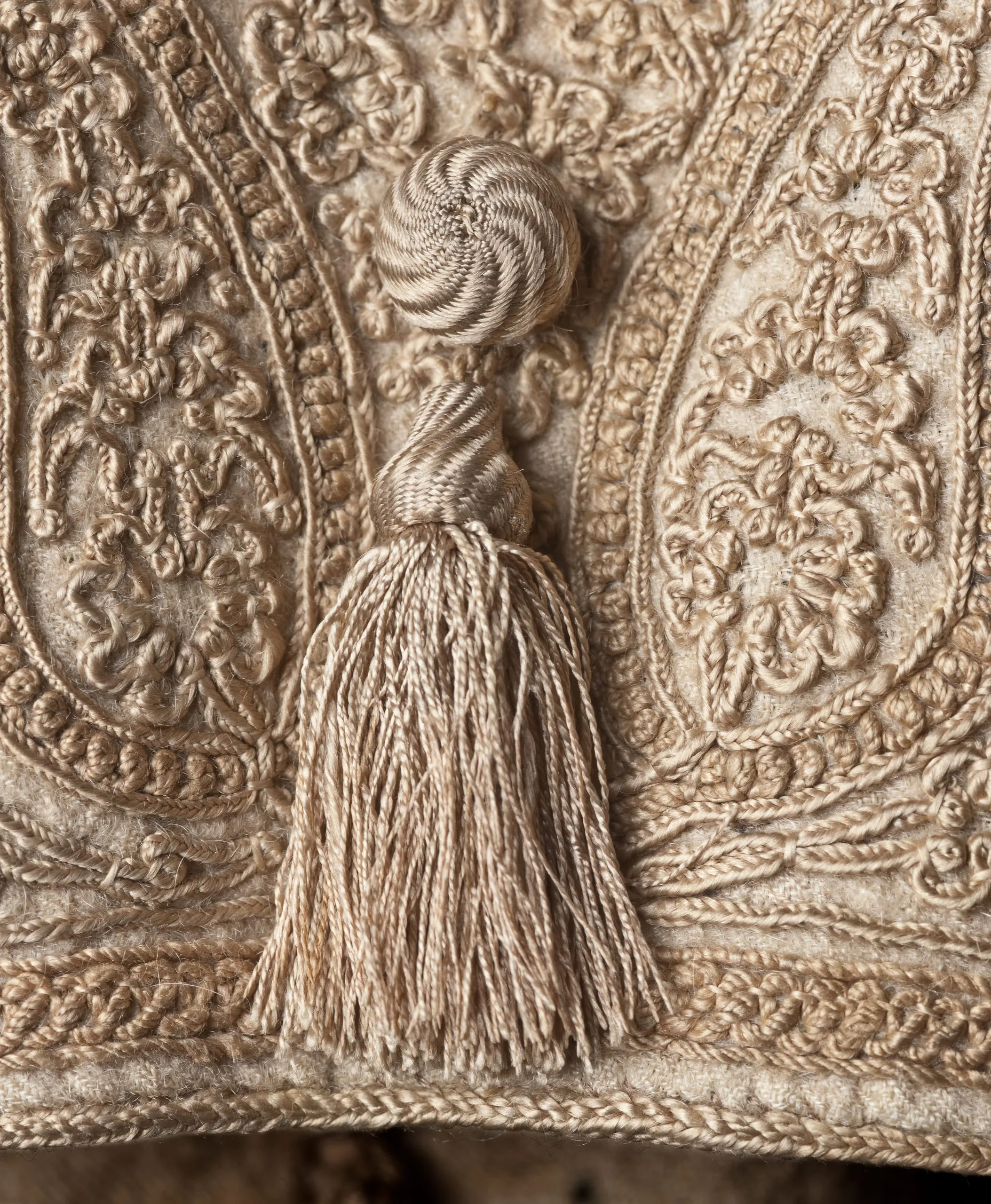 - Goat-fleece underdown (cashmere wool) twill with silk embroidery and silk tassels