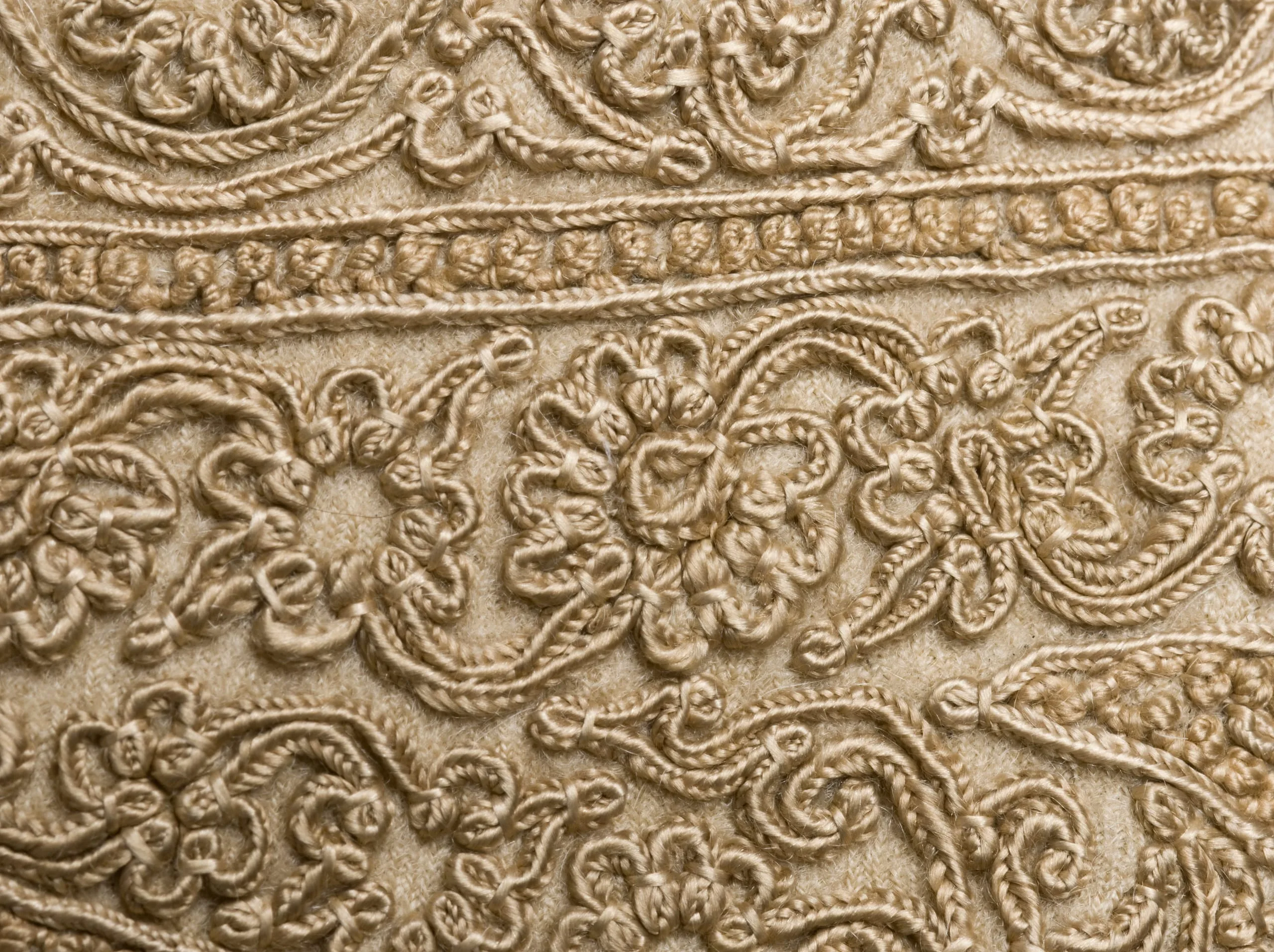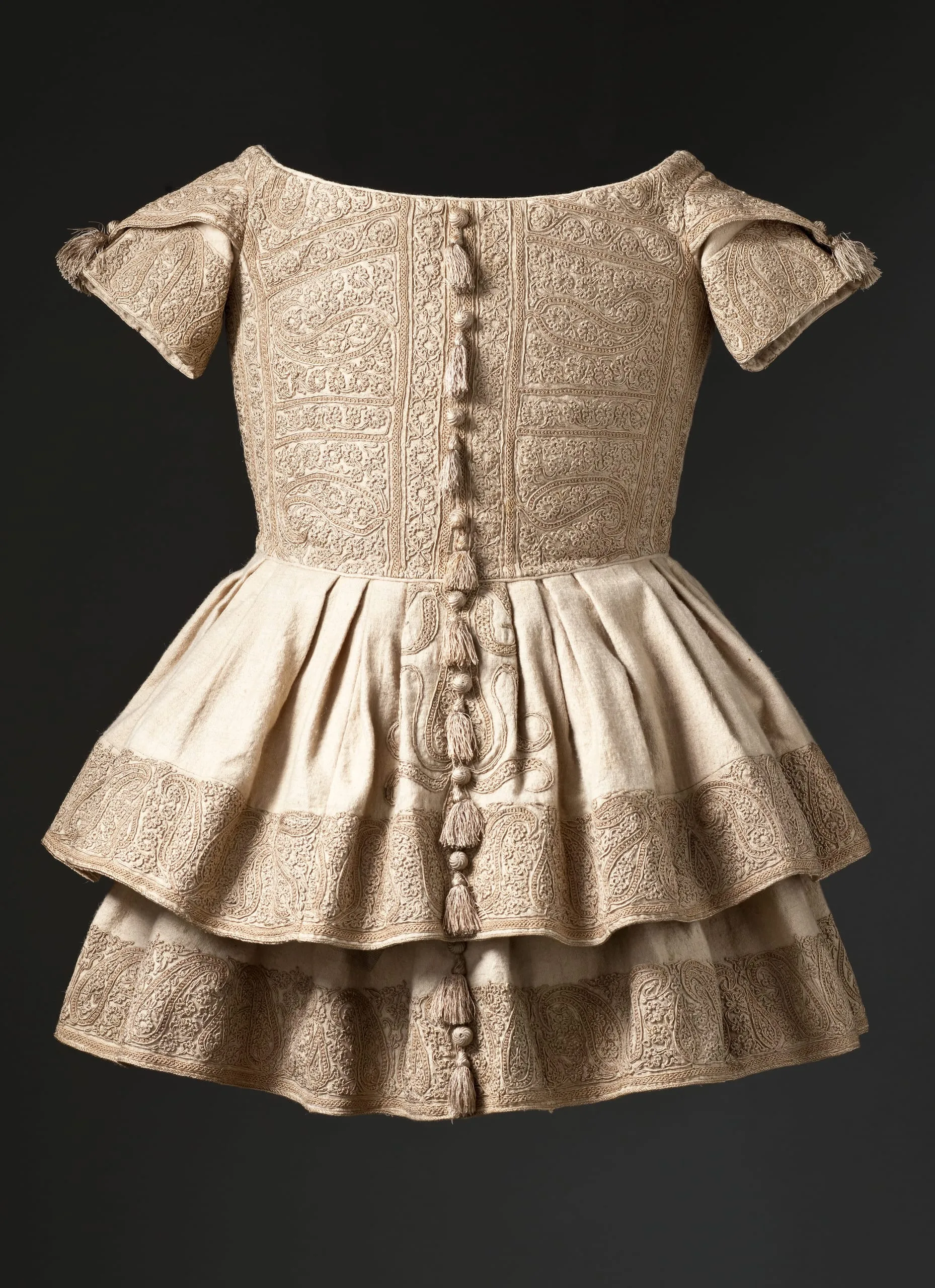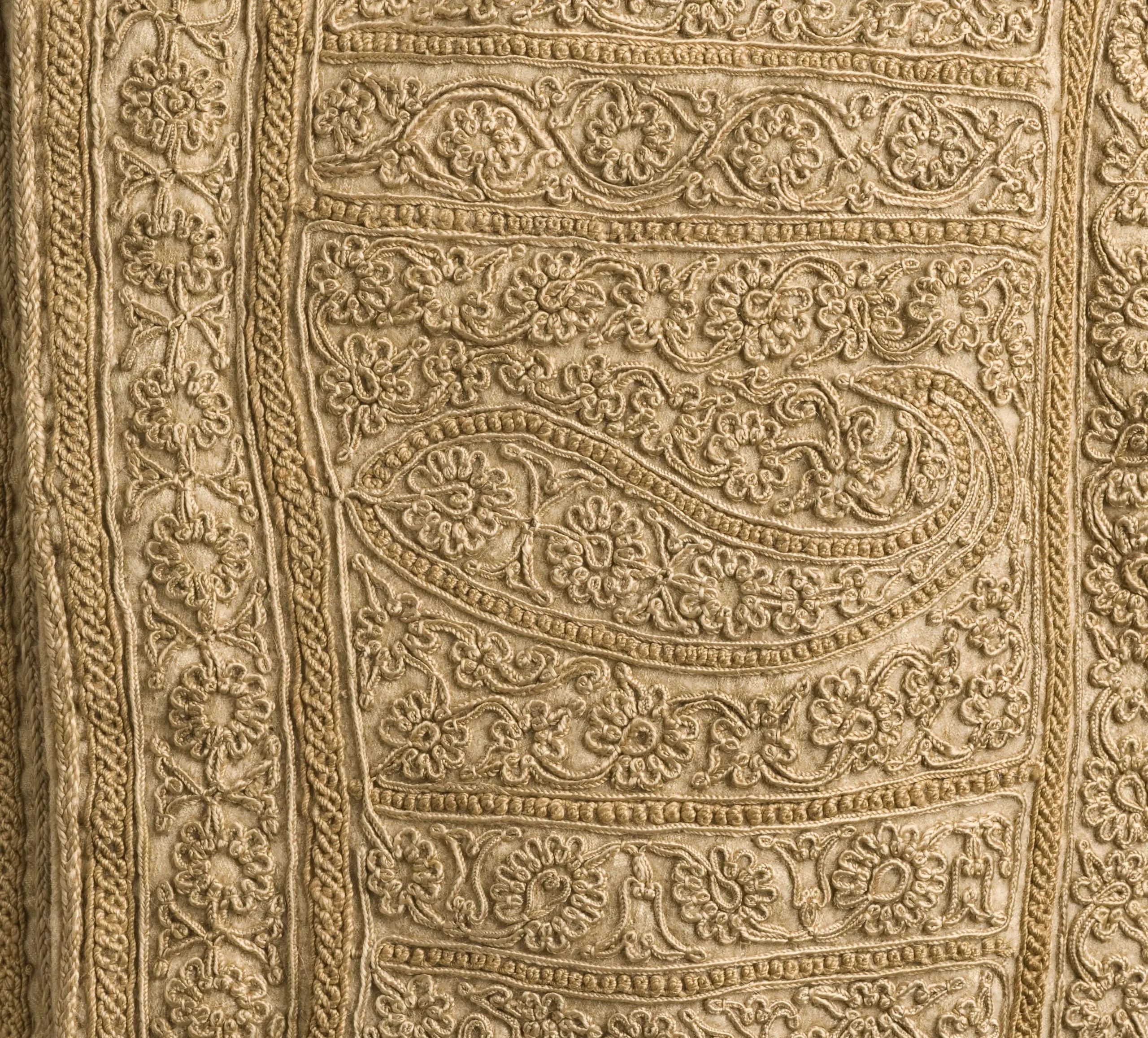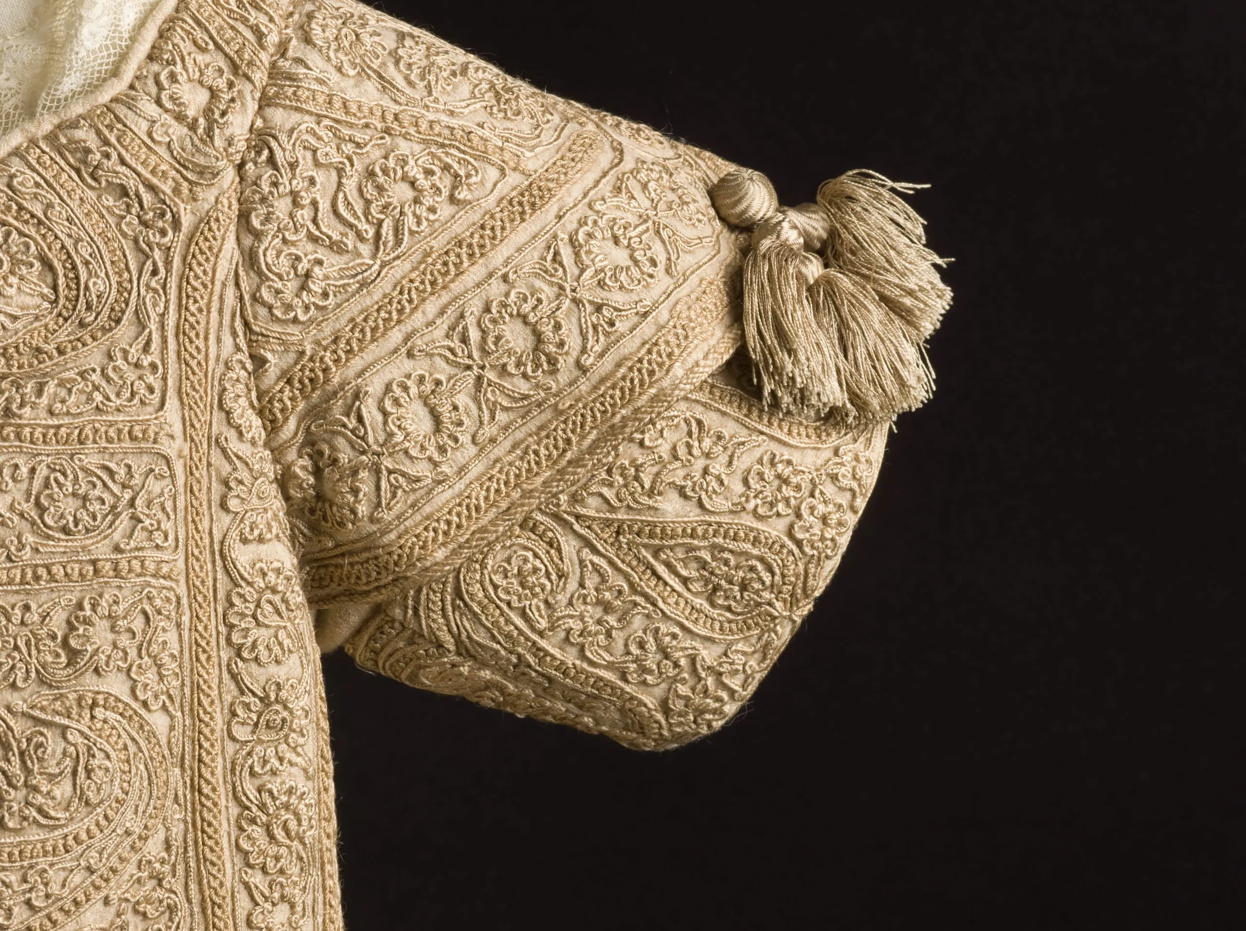 - Goat-fleece underdown (cashmere wool) twill with silk embroidery and silk tassels