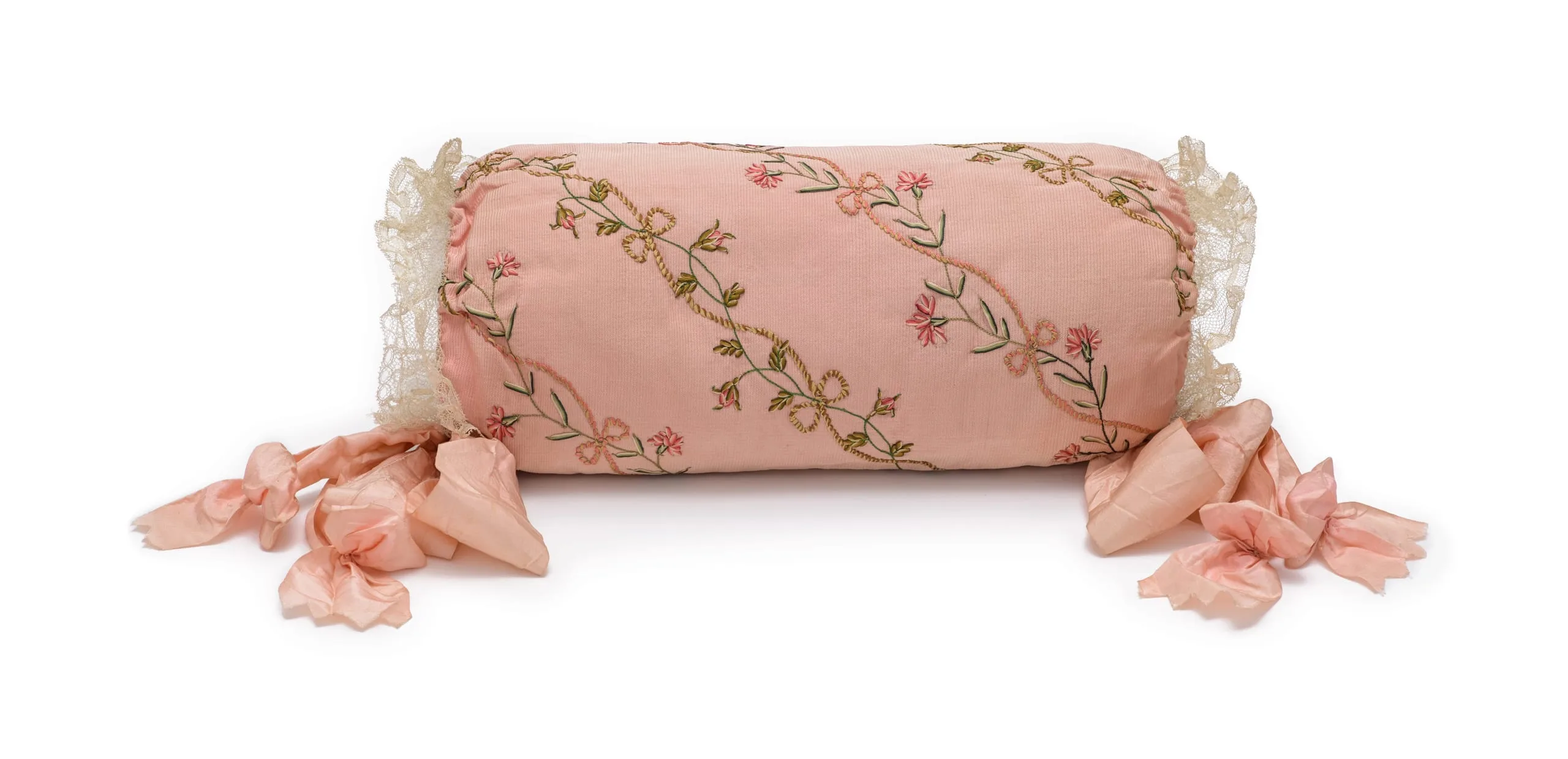 - Silk plain weave with weft patterning, with silk embroidery, silk plain weave ribbon embroidery, silk plain weave ribbon (taffeta), and linen lace trim
