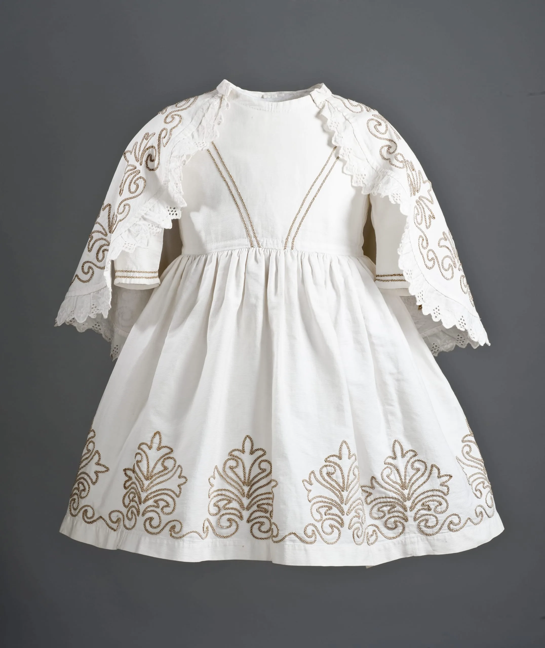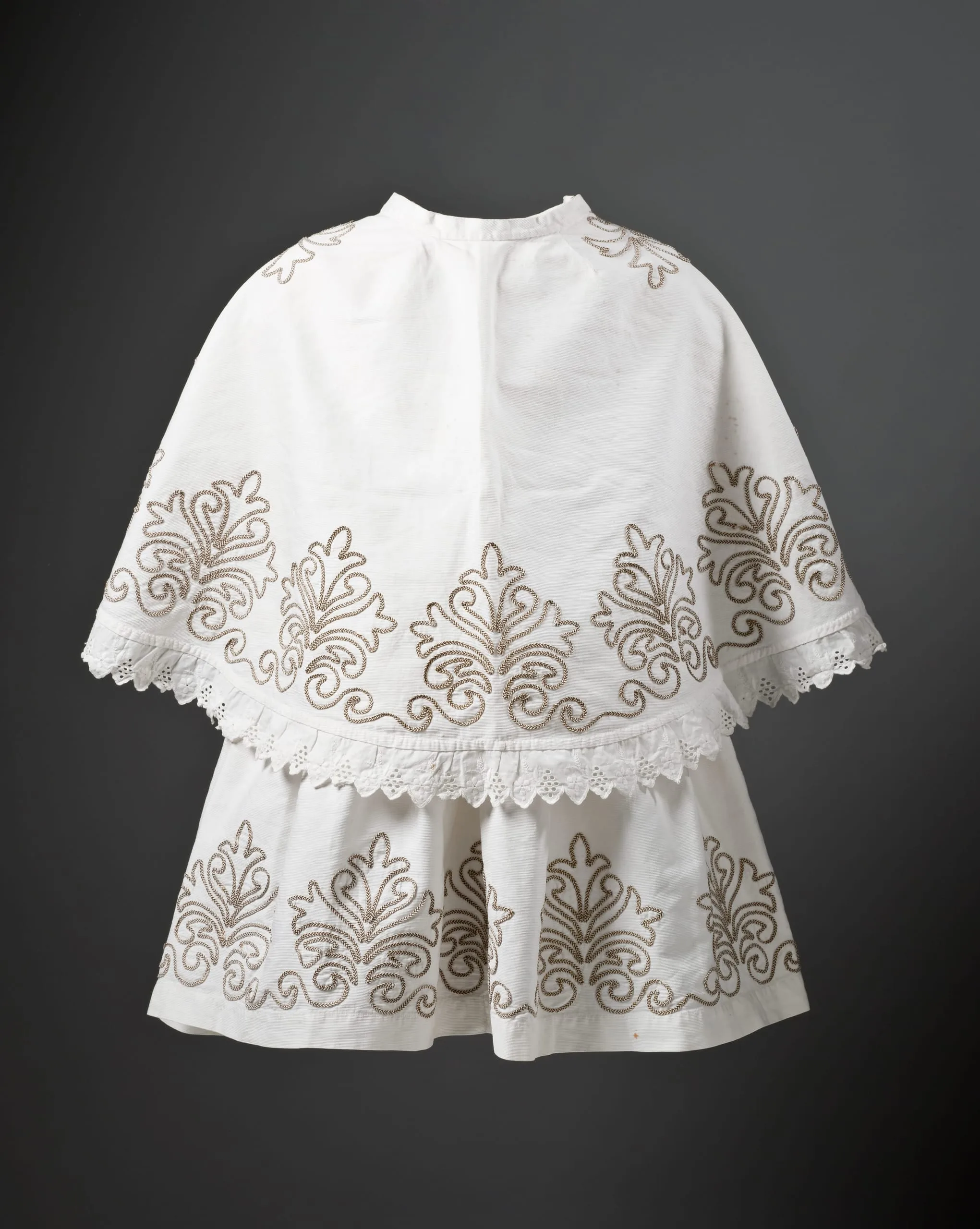 - Dress: Cotton plain weave with cotton braid applique; Cape: Cotton plain weave with cotton braid applique and cotton plain weave with cotton cutwork embroidery