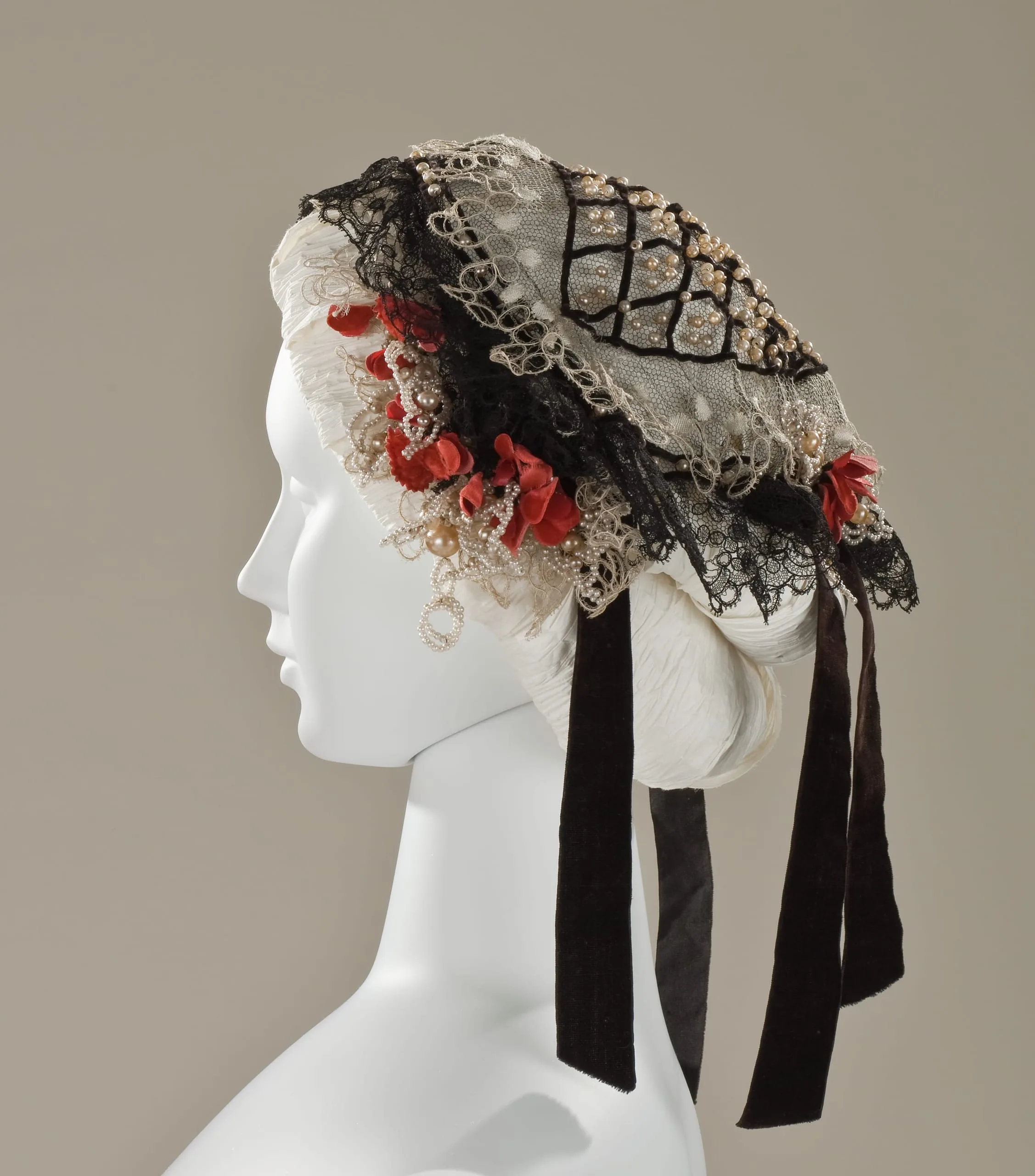 - Linen net with linen lace, silk lace, silk velvet, and glass beads
