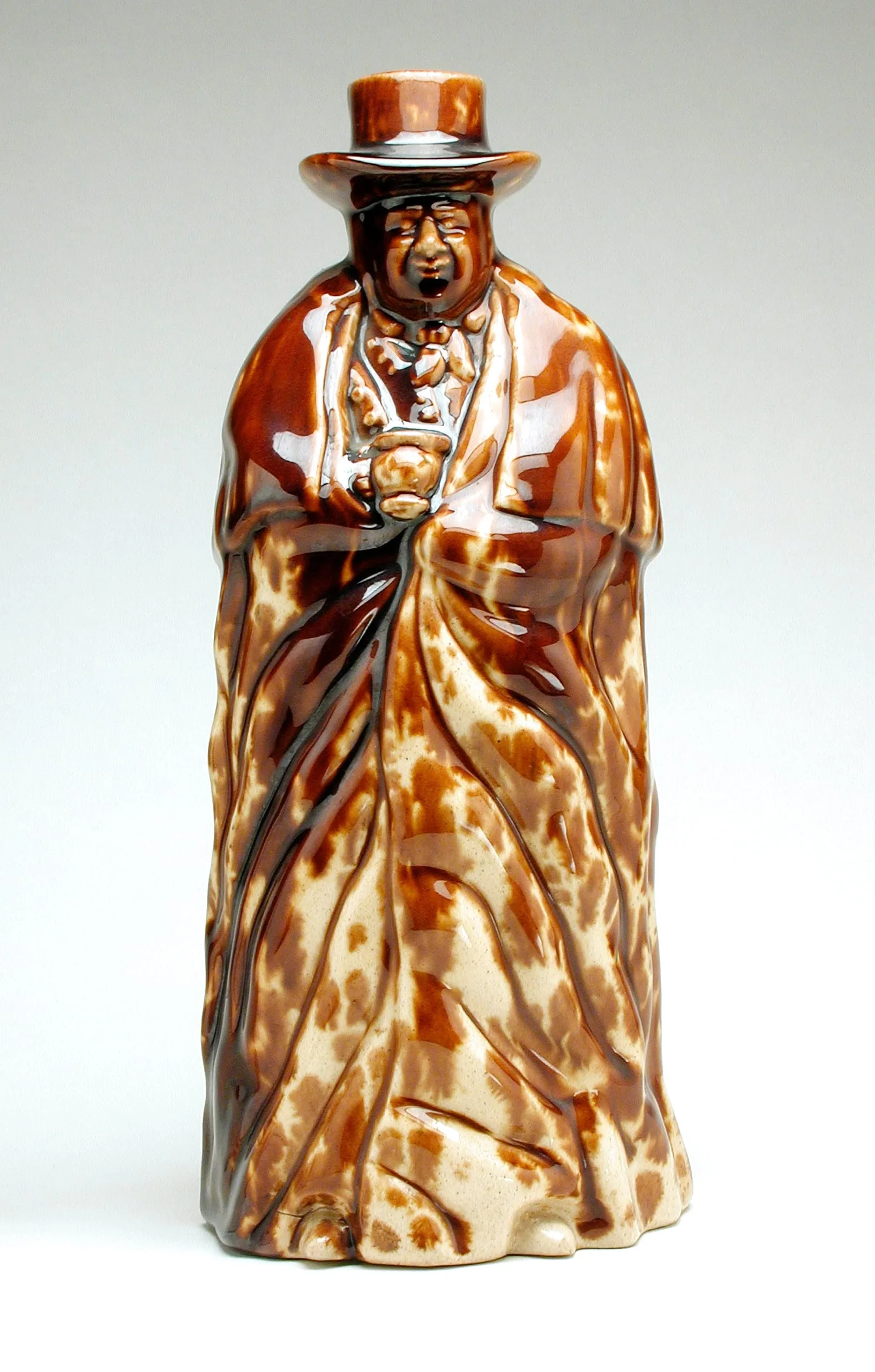 Ceramic figural bottle in the form of a cloaked standing man with a flat-brimmed hat, covered in mottled amber and cream glaze with high-gloss finish