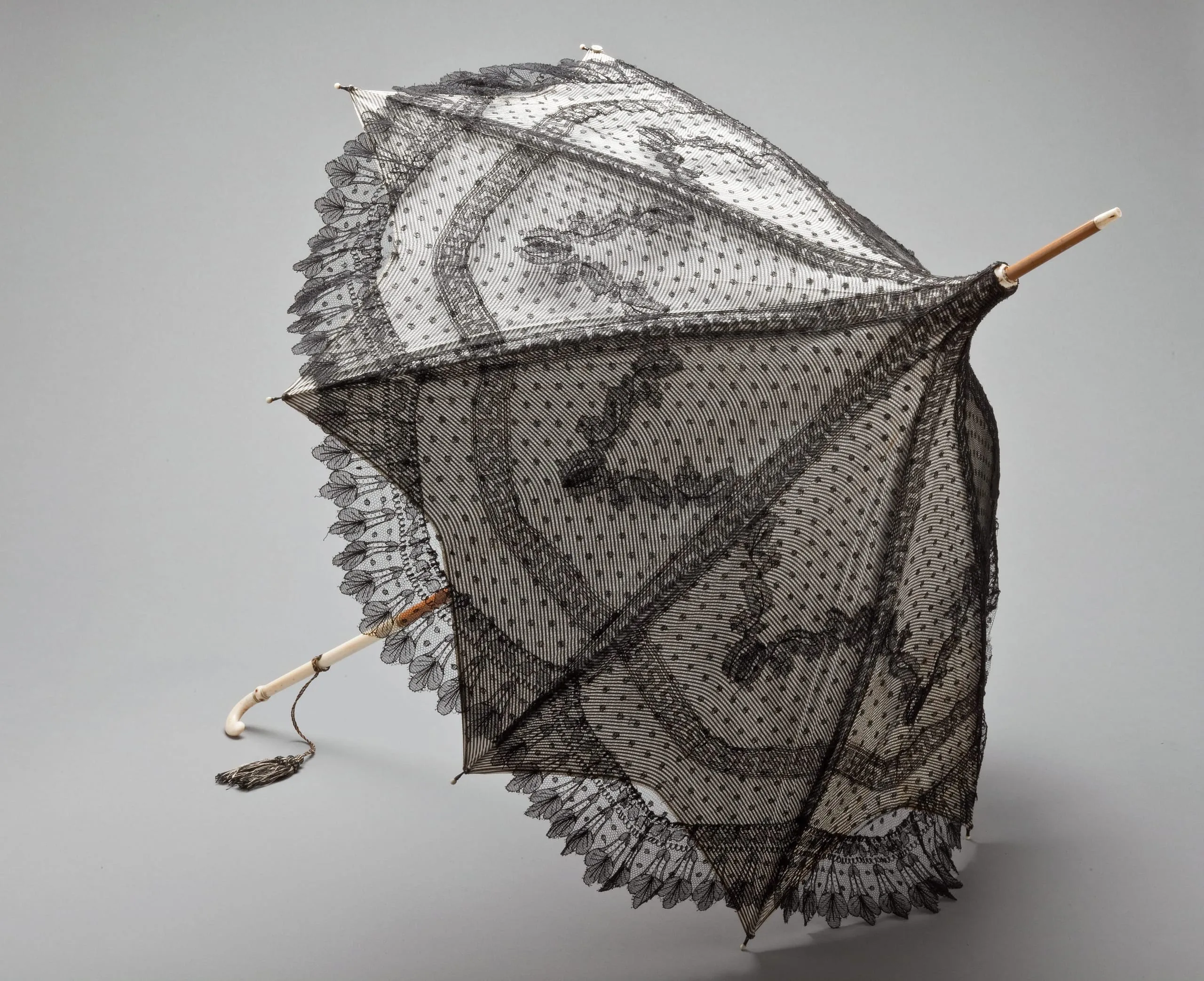 - Silk lace and silk plain weave (taffeta), with silk tassels, wood, ivory, and metal