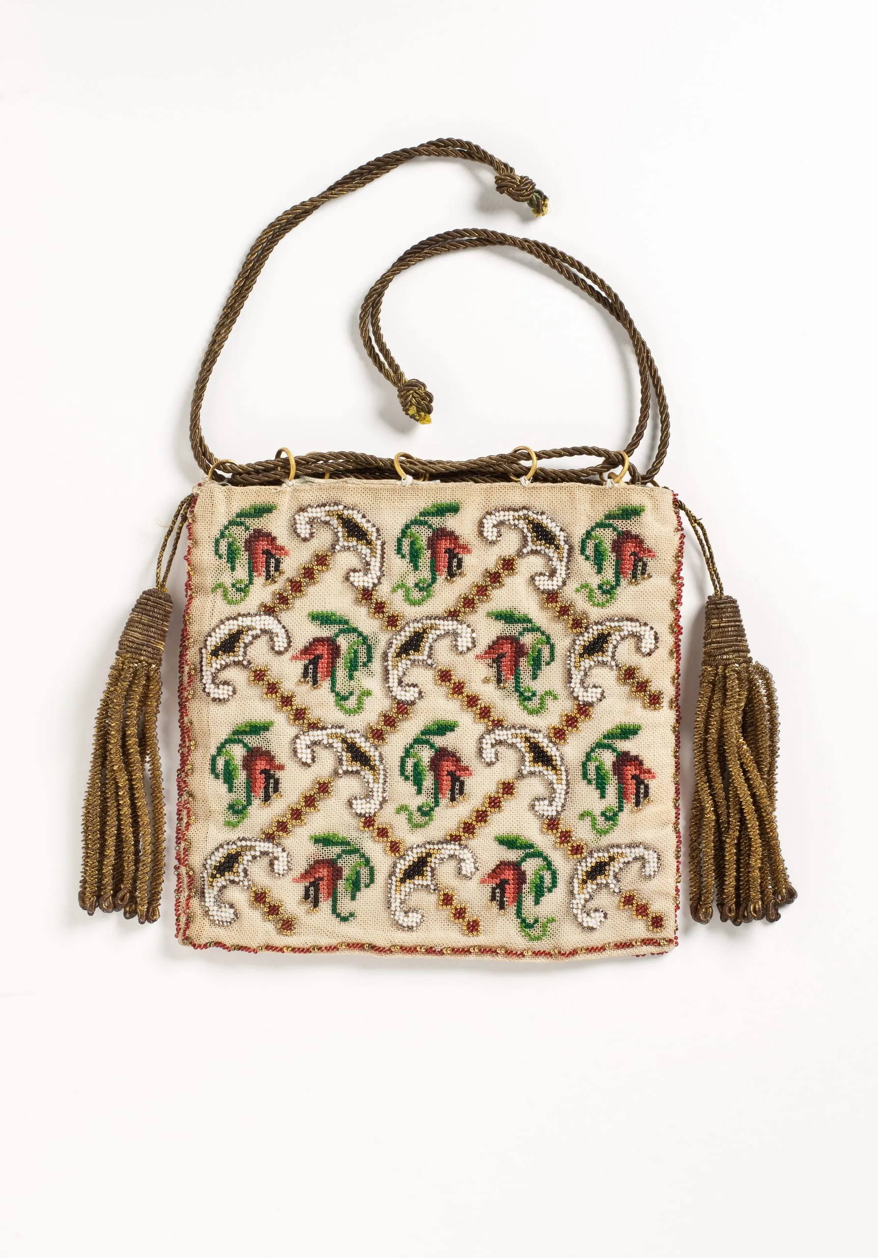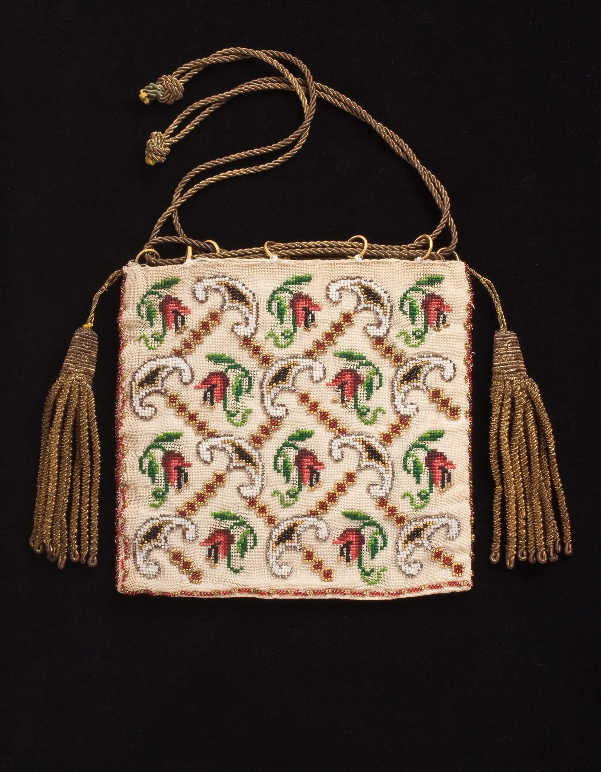 - Silk plain weave with silk needlepoint, glass- and metallic-bead embroidery, and metallic cord and fringe
