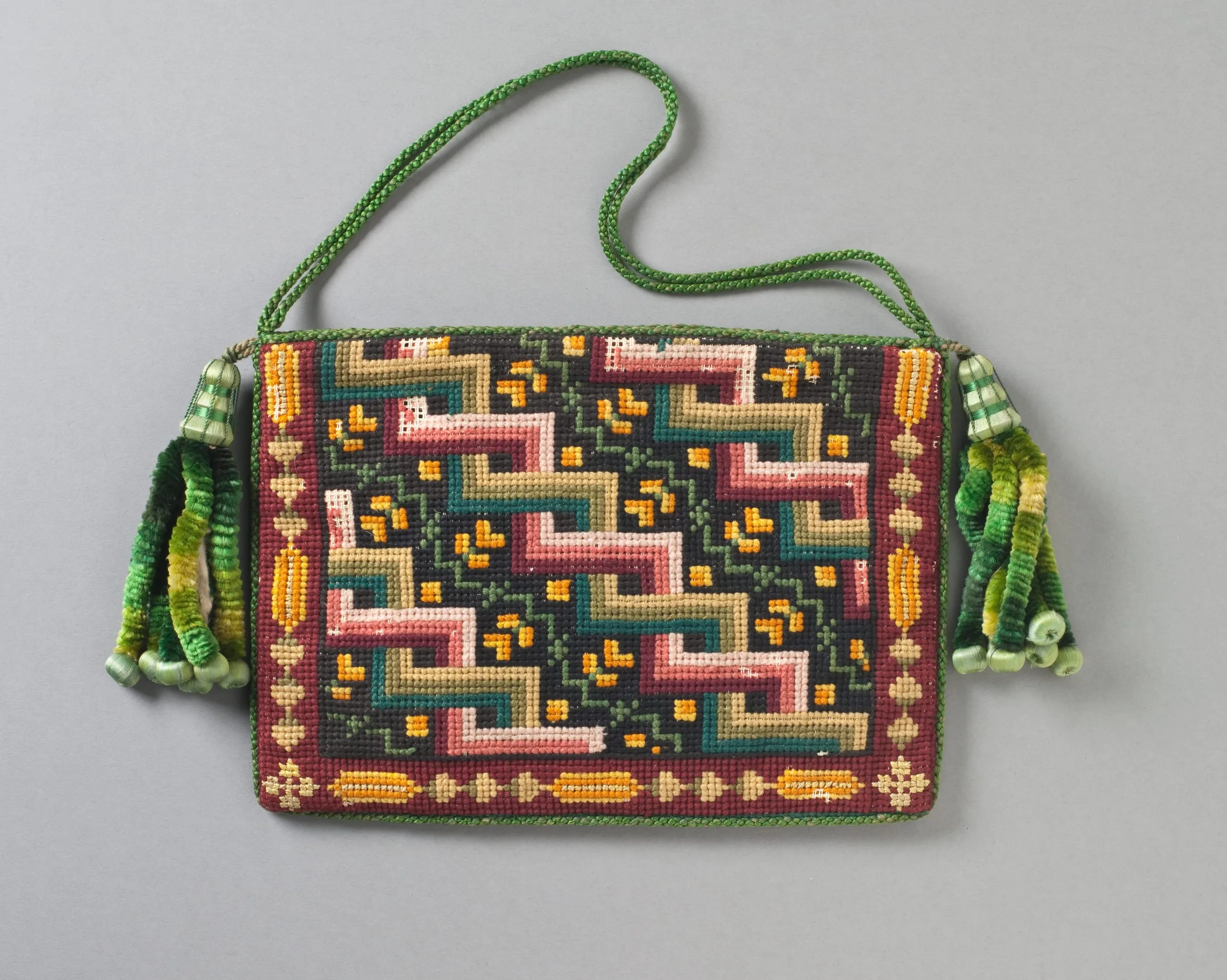 - Cotton canvas with wool needlepoint (Berlin work), silk braided cord, and silk chenille tassels