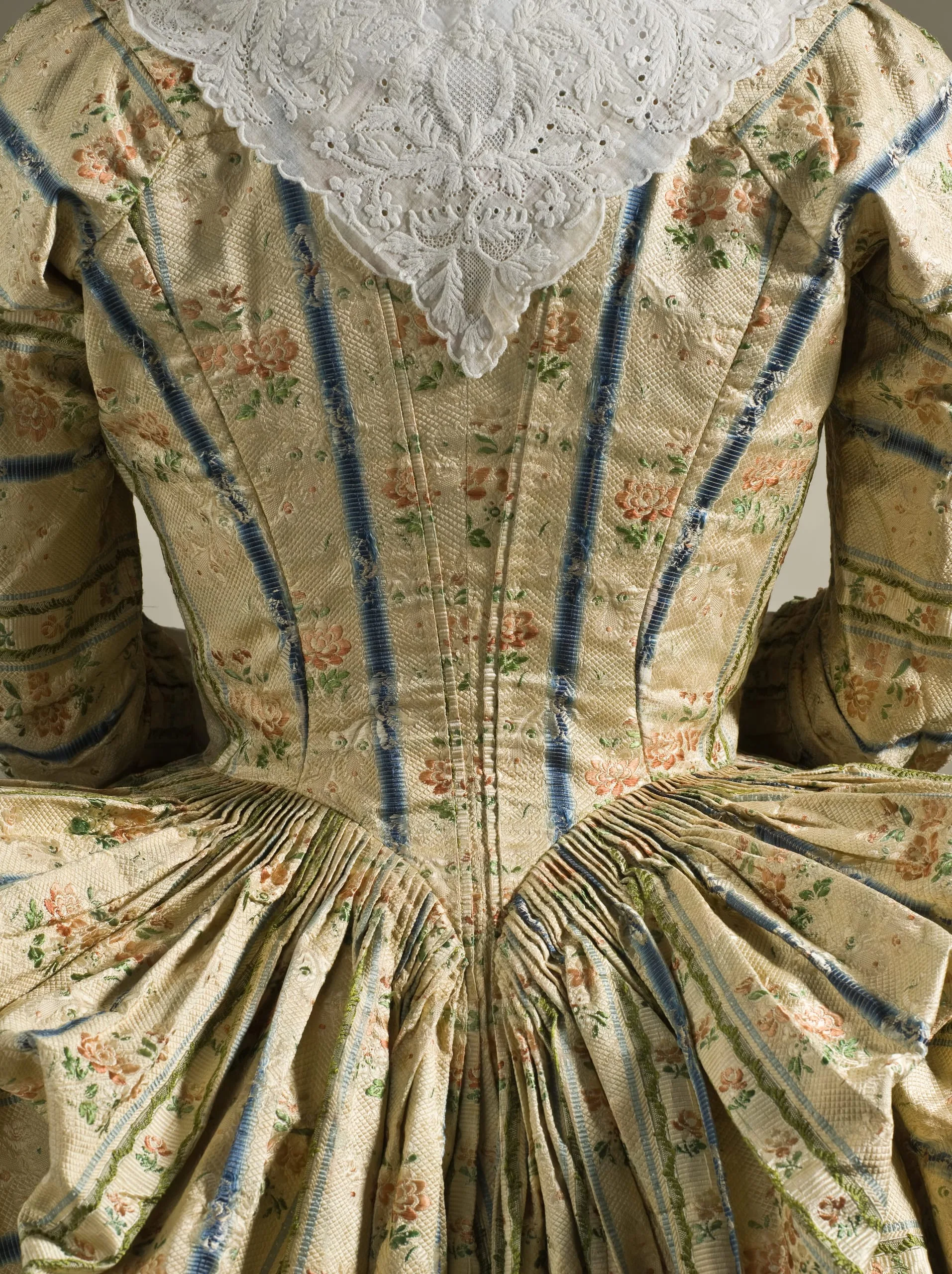 - Cotton plain weave (muslin) with linen embroidery