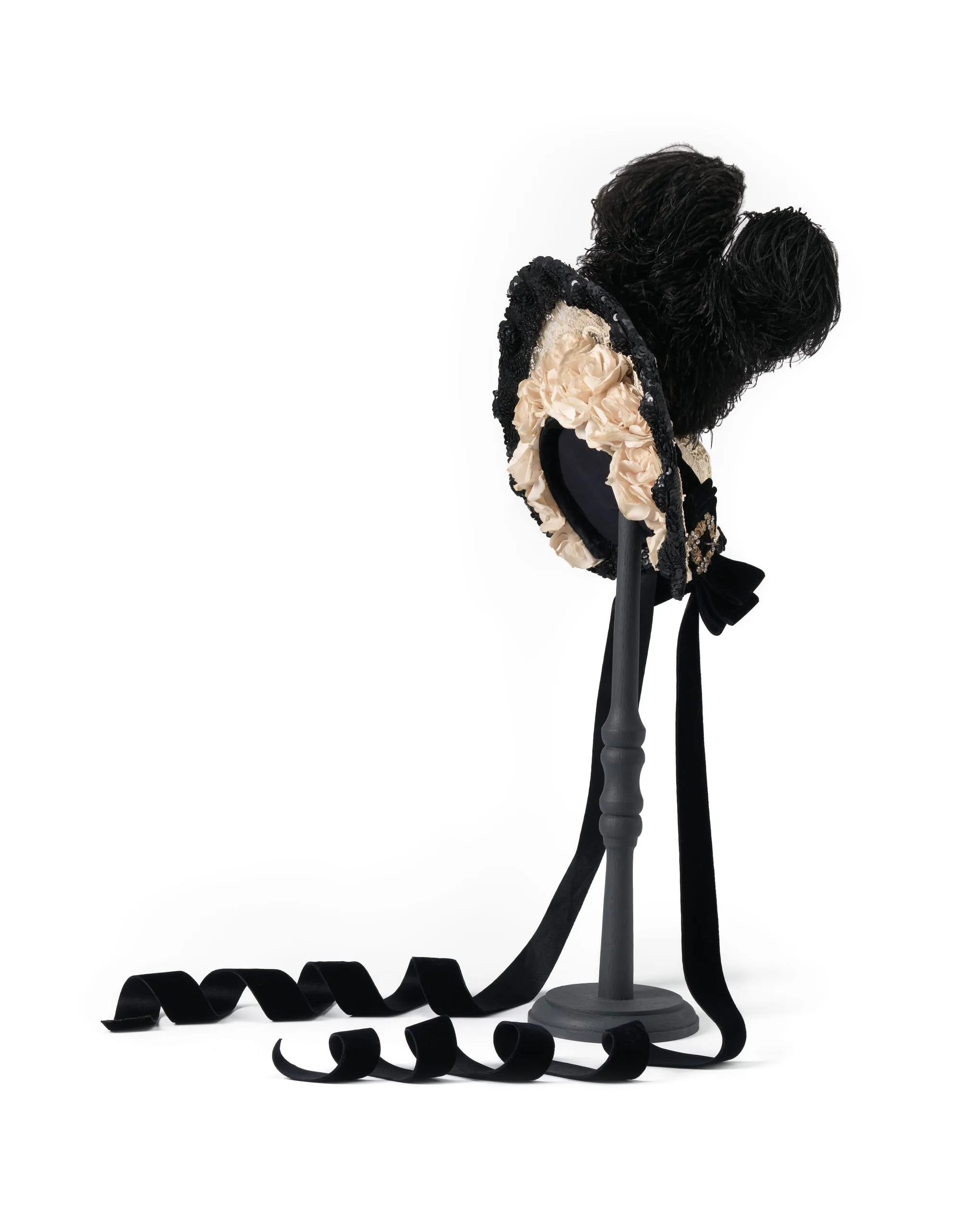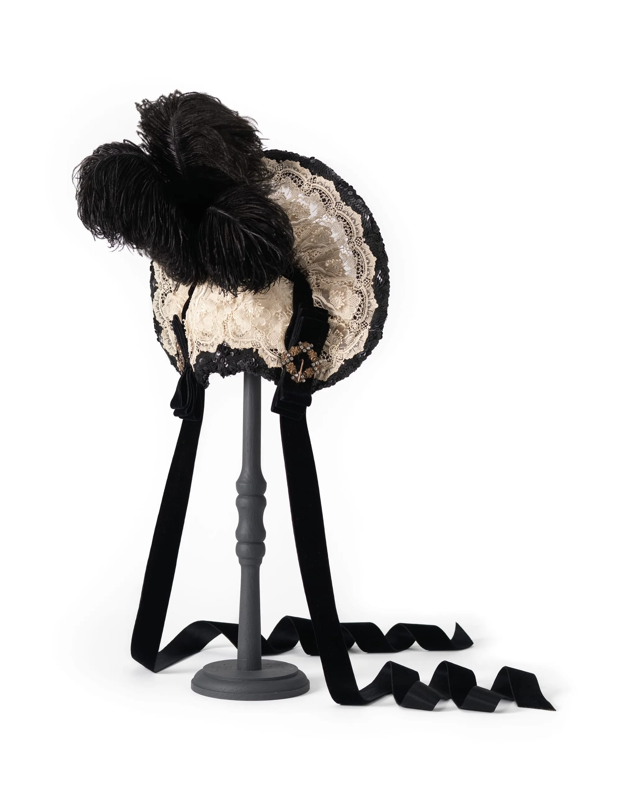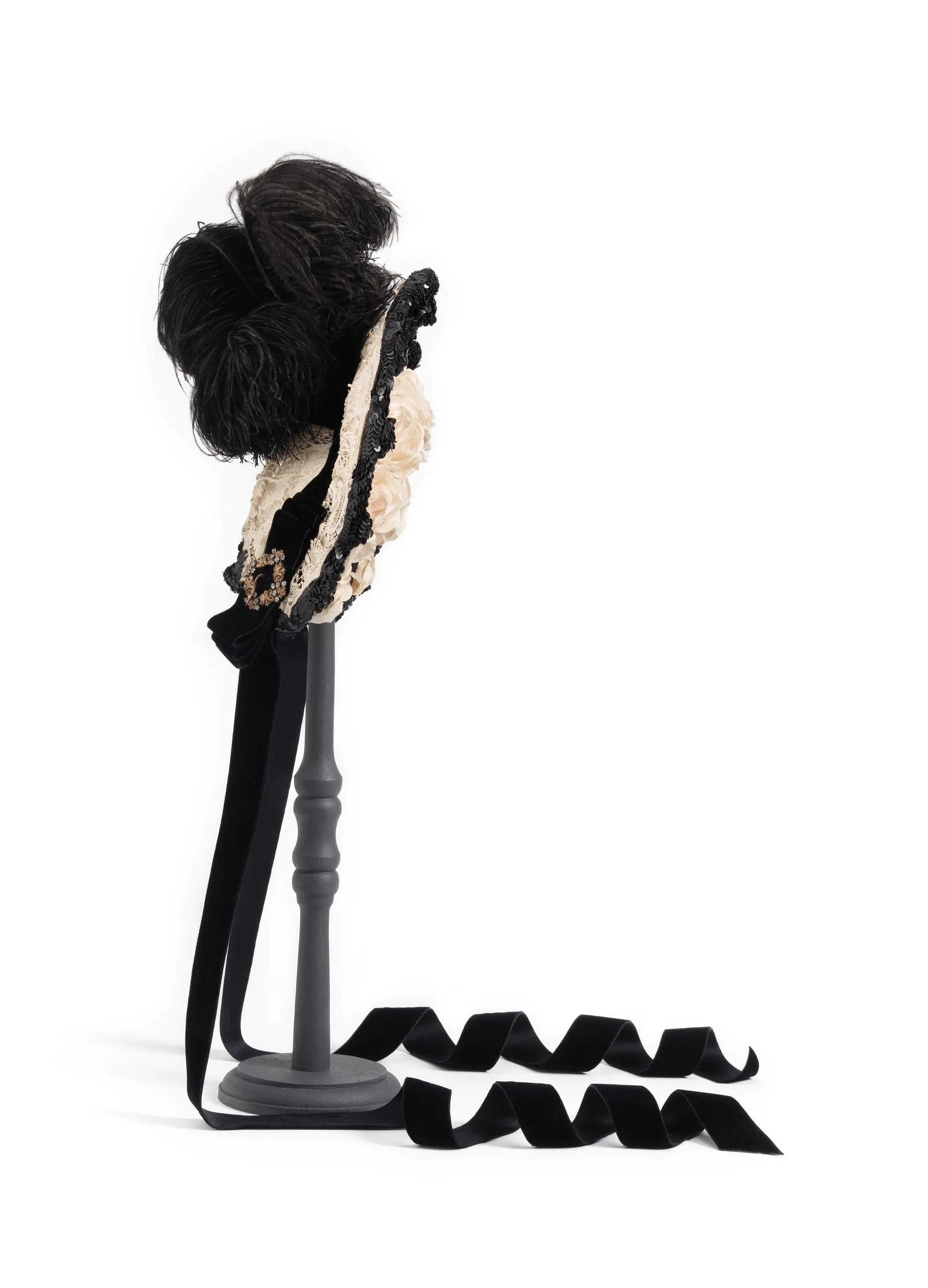 - Cotton lace and plain weave with ostrich feathers, silk velvet ribbon, metal sequins, metal, and faceted glass stones