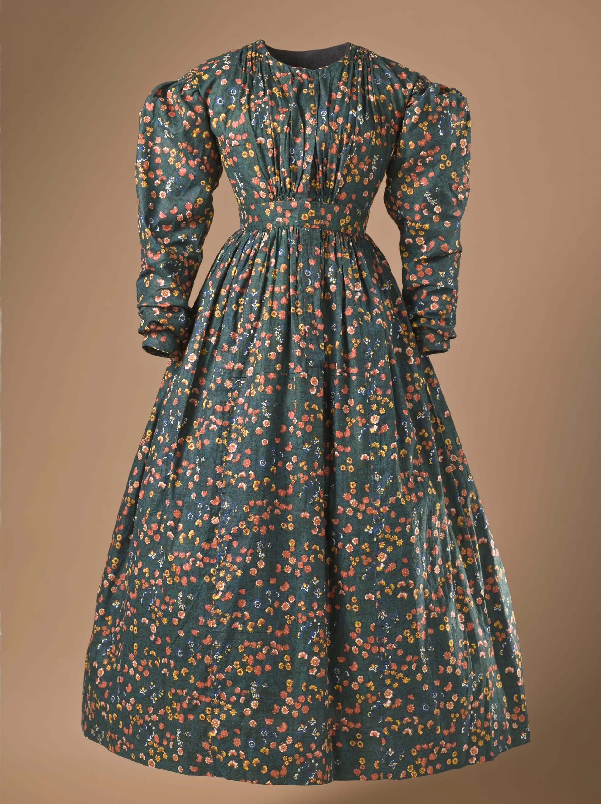 Teal green women's dress with allover small-scale floral print in coral, yellow, and white, featuring a fitted bodice, puffed sleeves, and full gathered skirt