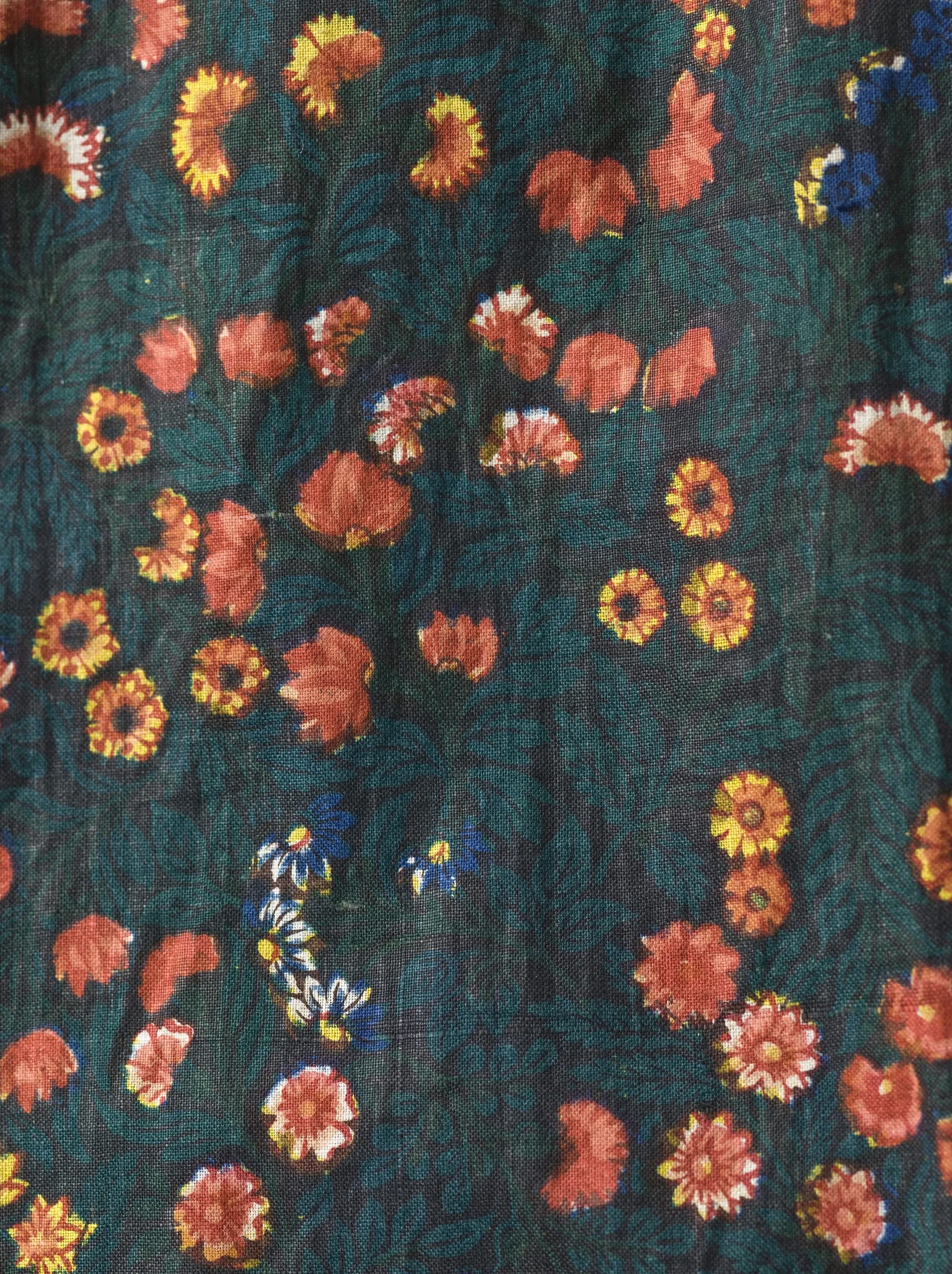 Textile fragment with printed floral pattern; scattered small flowers in rust, yellow, orange, blue, and white against a dark teal ground with subtle leaf motifs visible beneath.