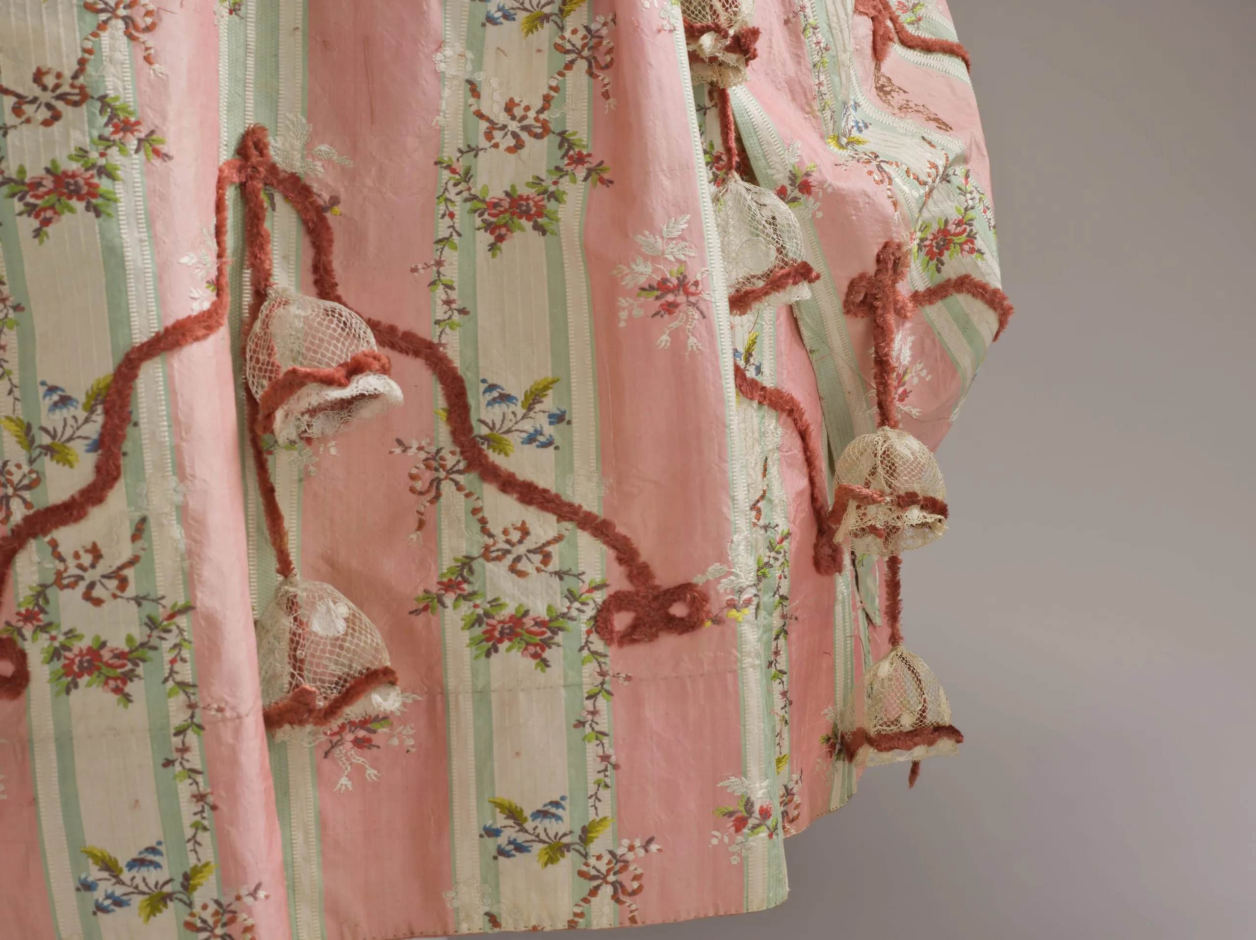 - Silk plain weave (taffeta) with silk supplementary warp and weft patterning, silk chenille and linen lace