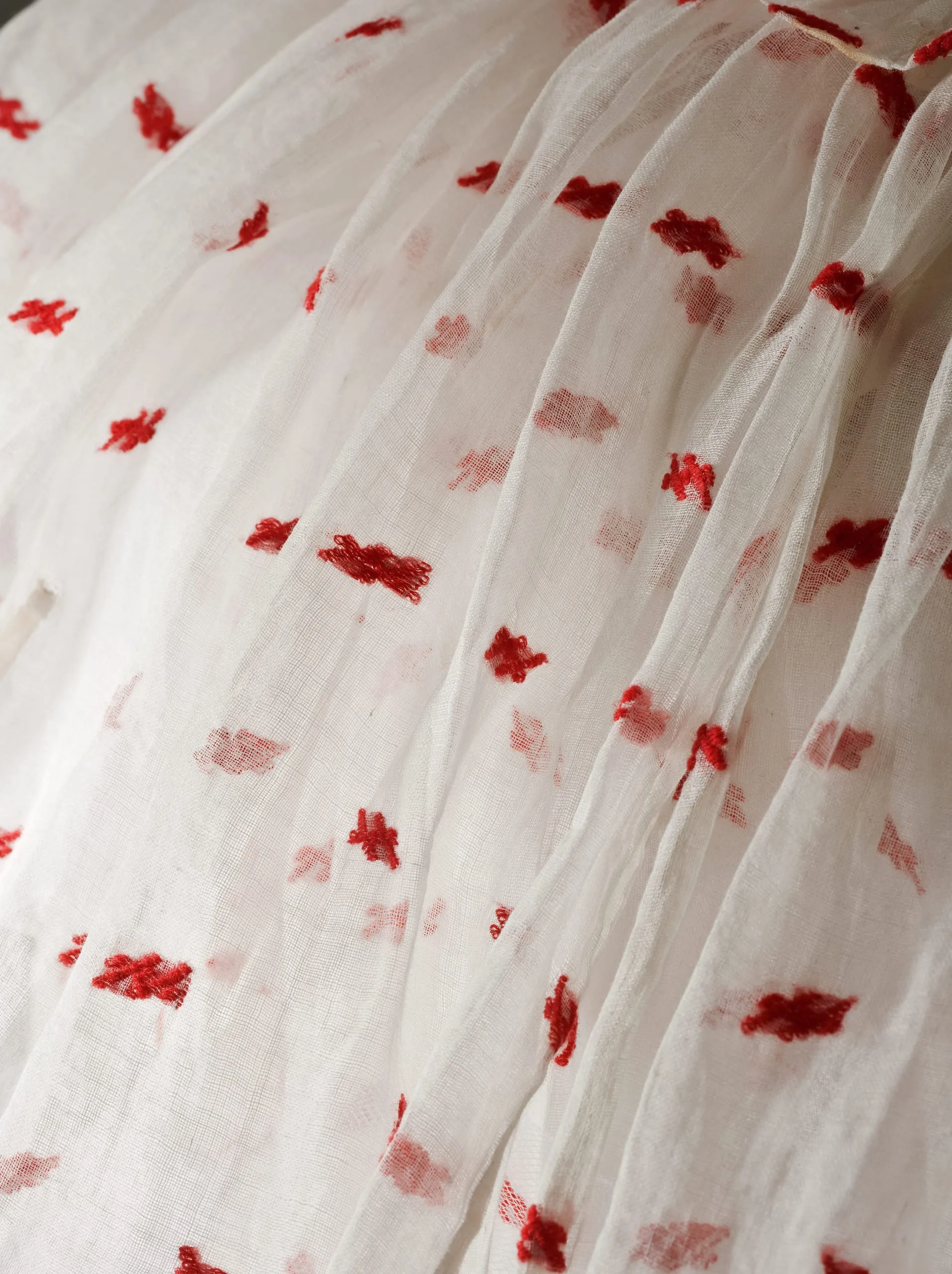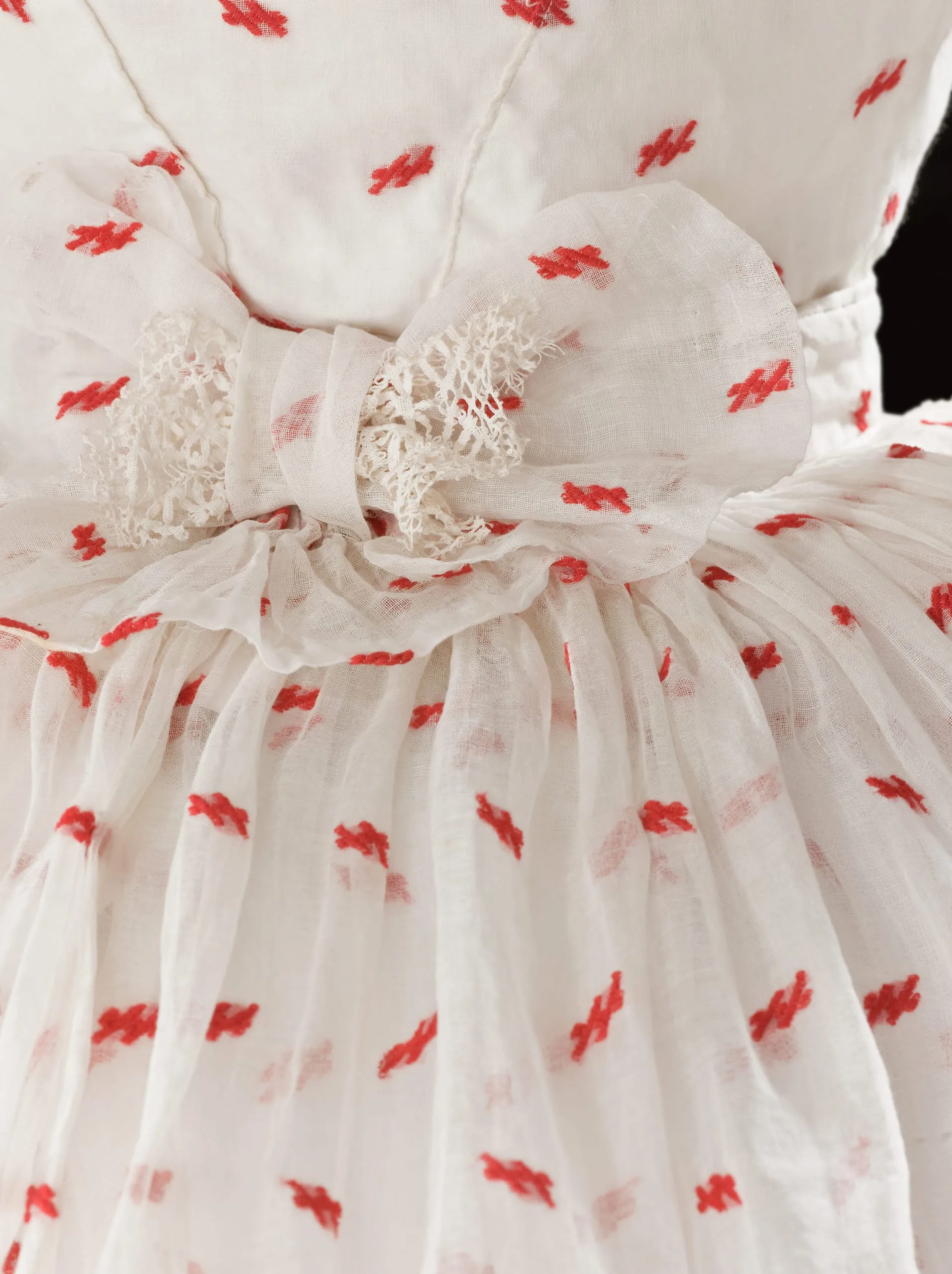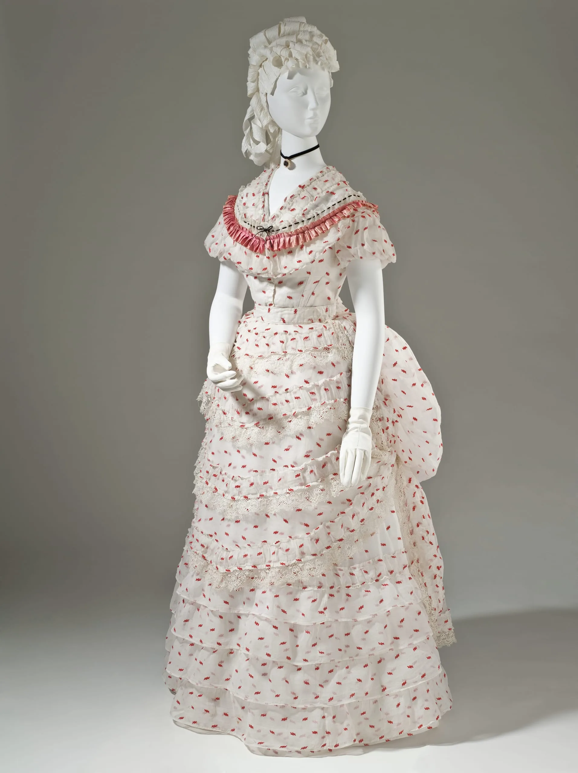 - Cotton plain weave with wool supplementary patterning, silk satin ribbon, and cotton machine lace