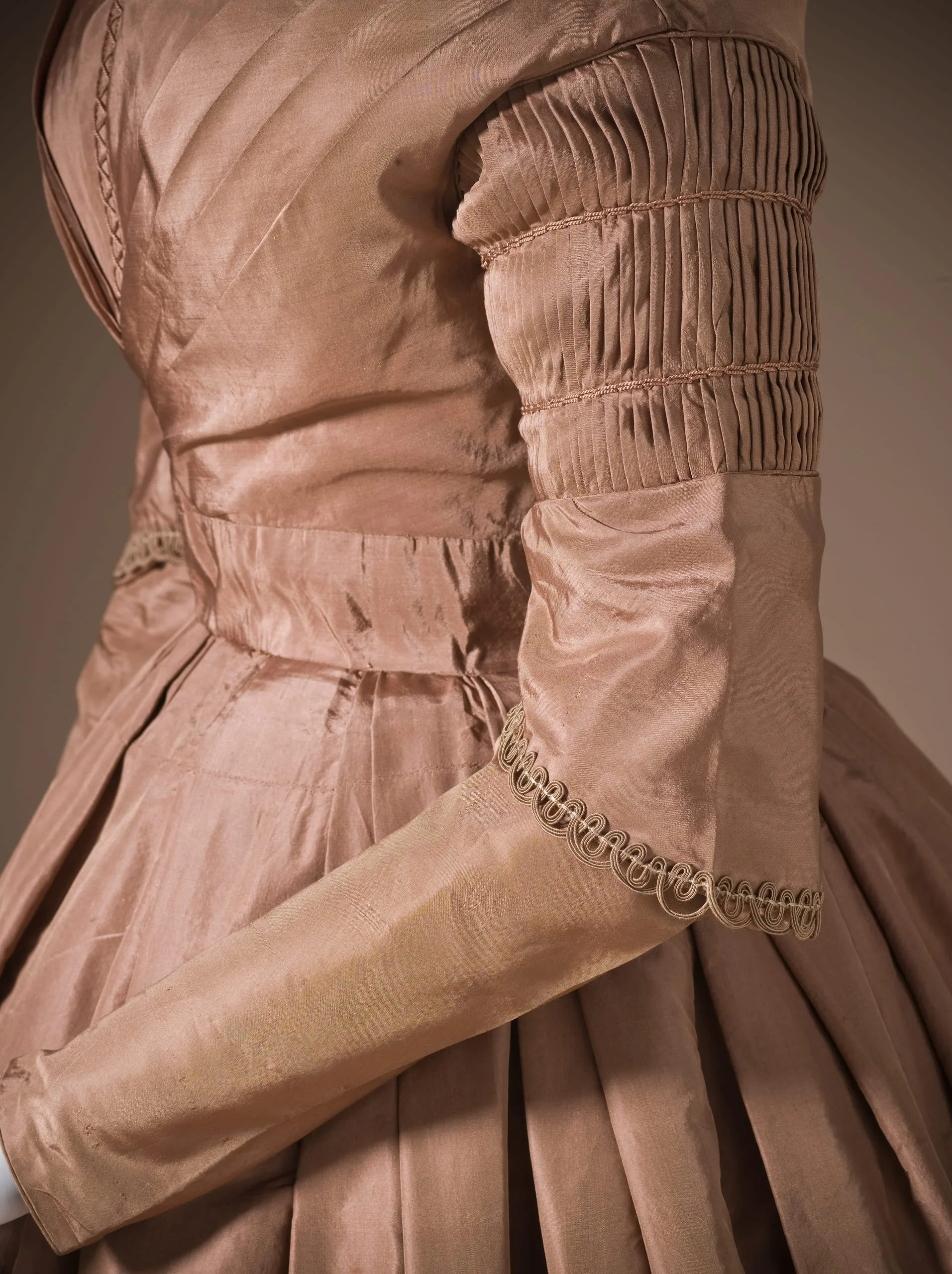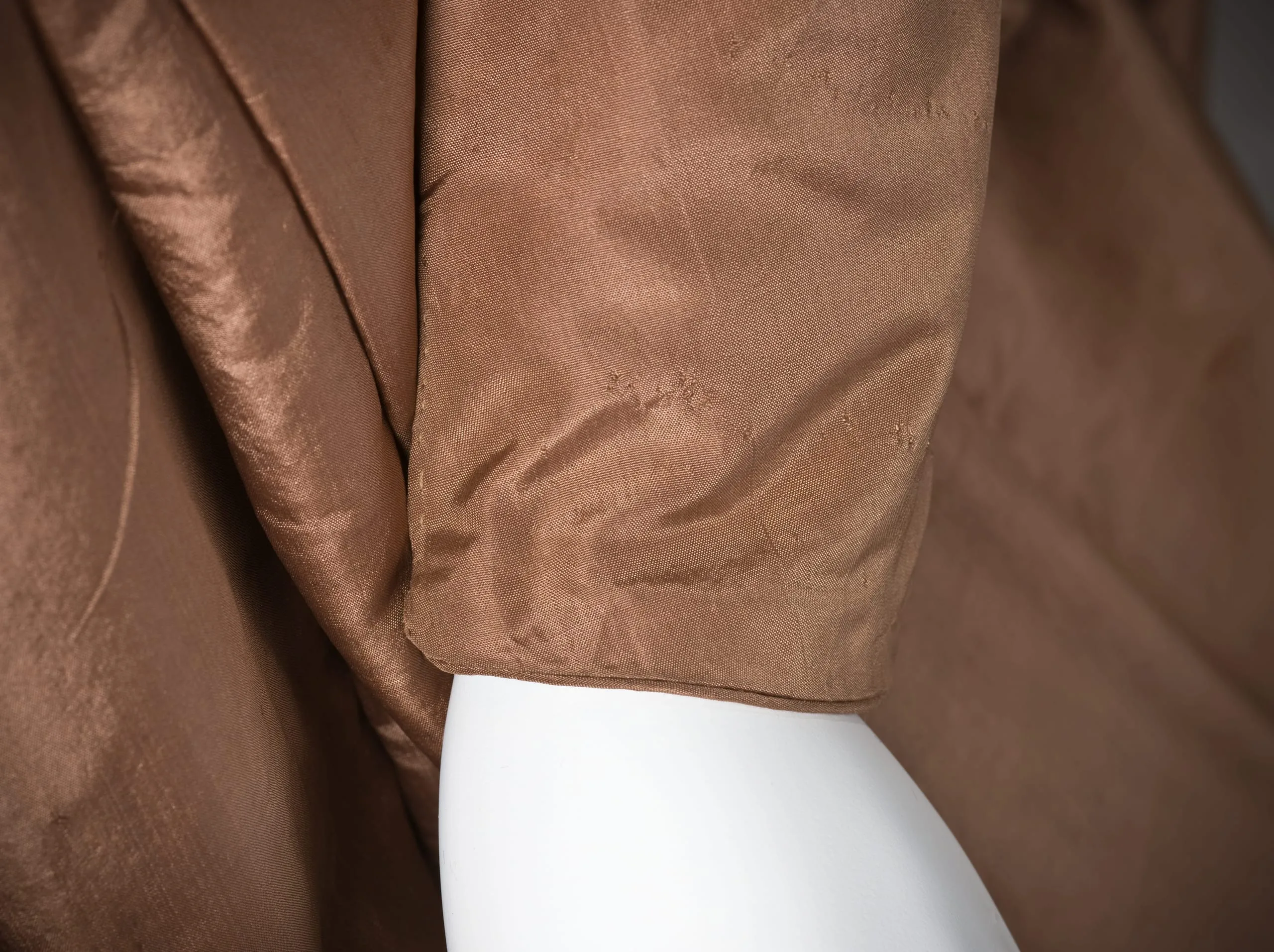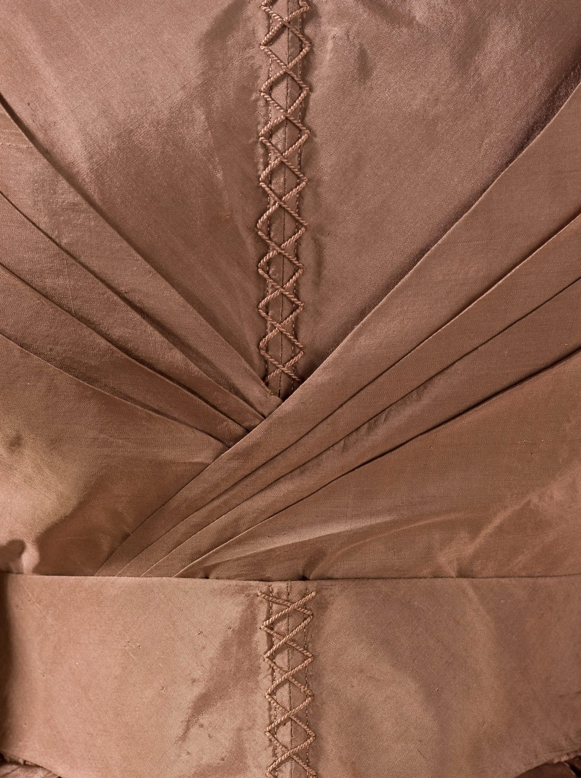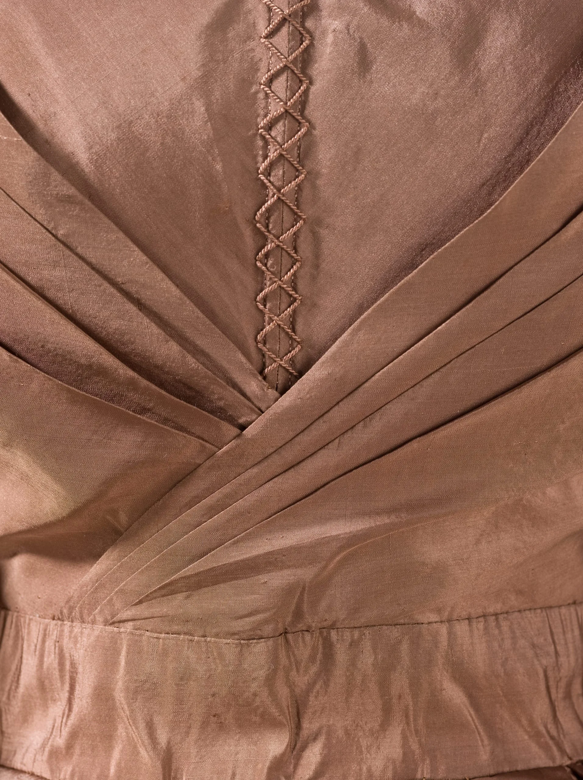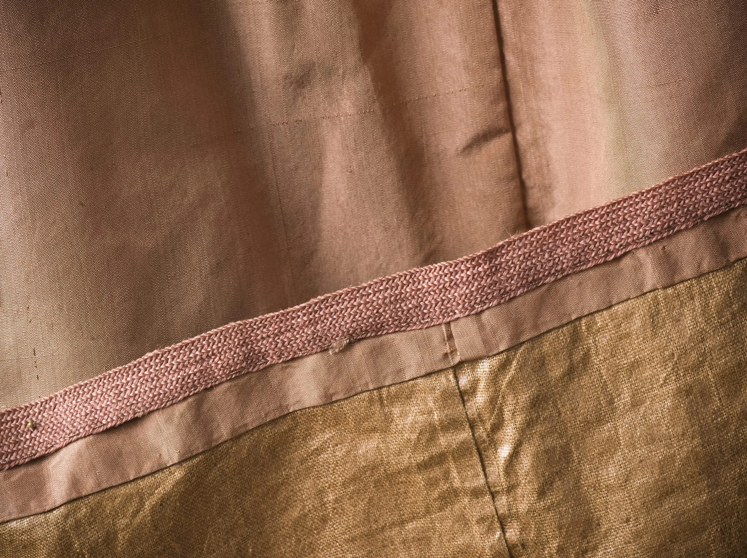 - Silk plain weave (taffeta) with silk cord embroidery and silk braid