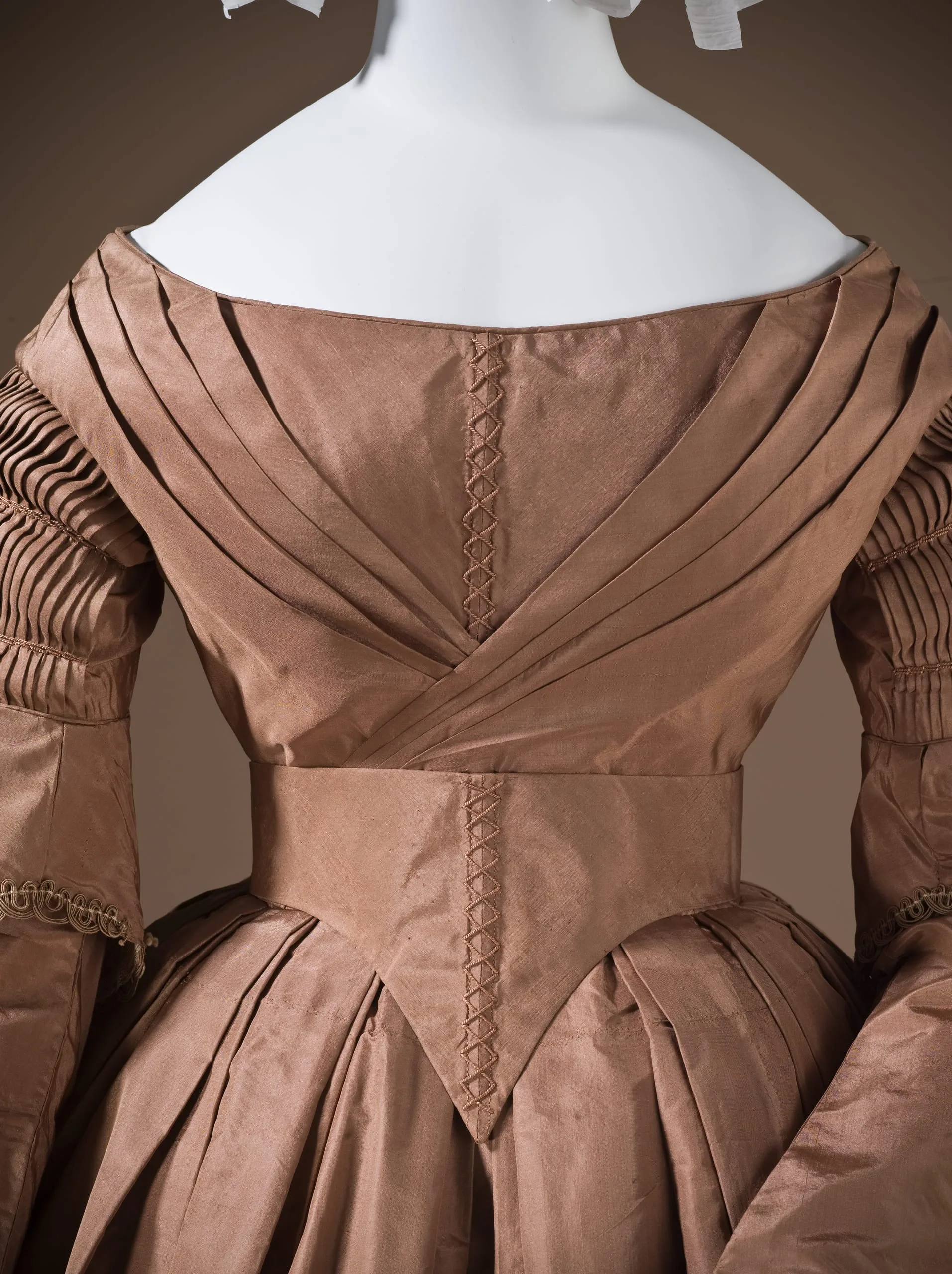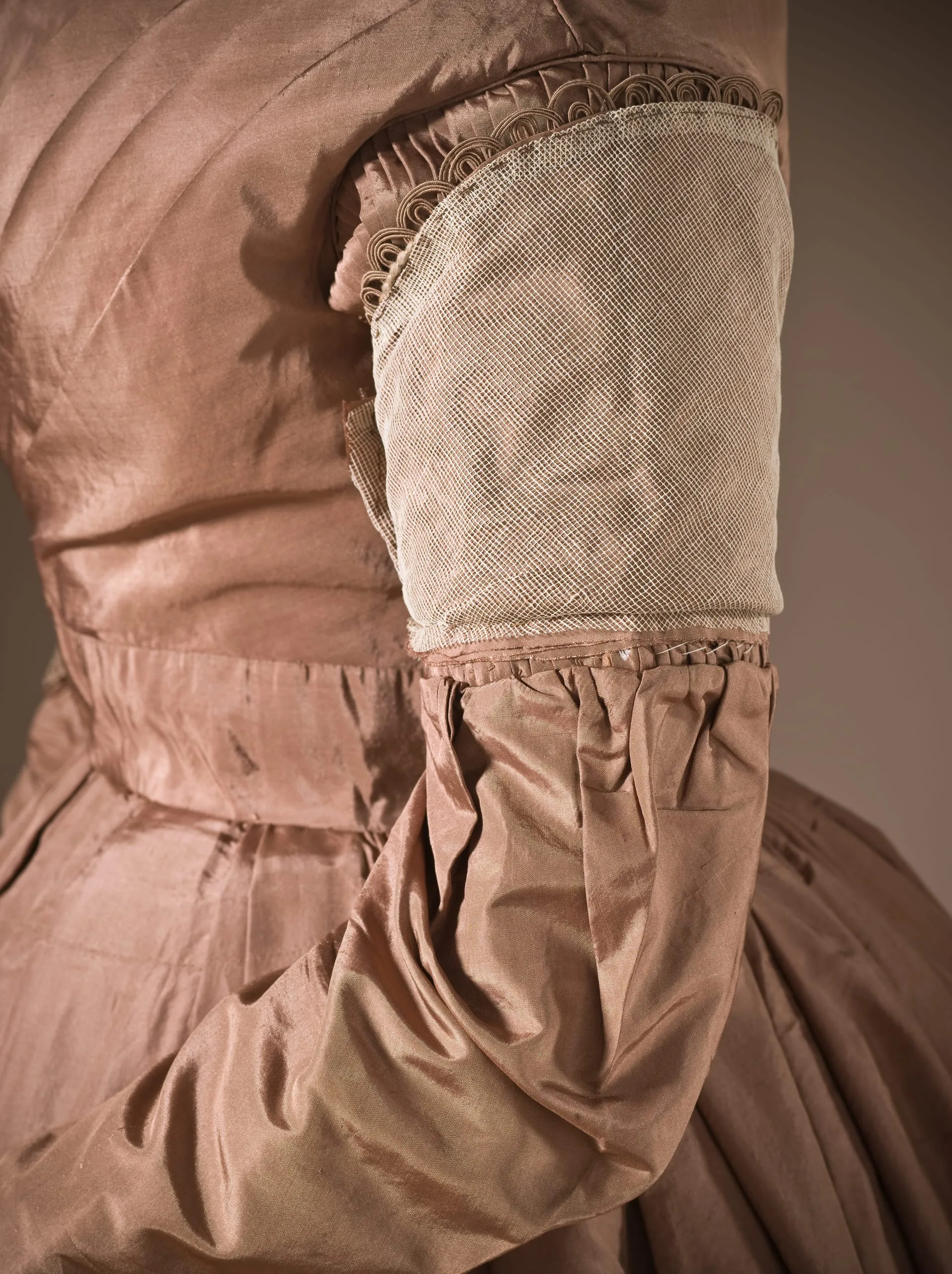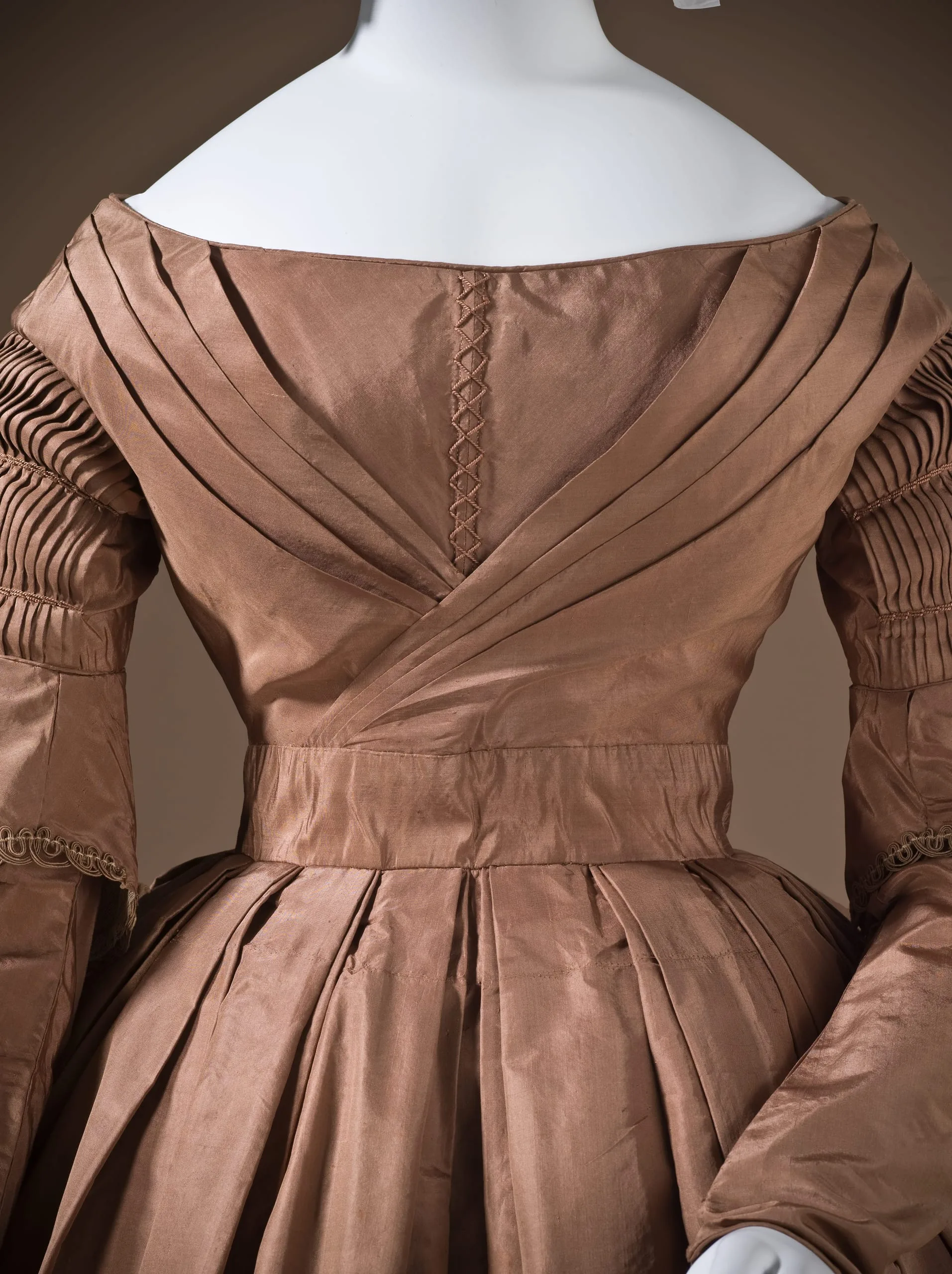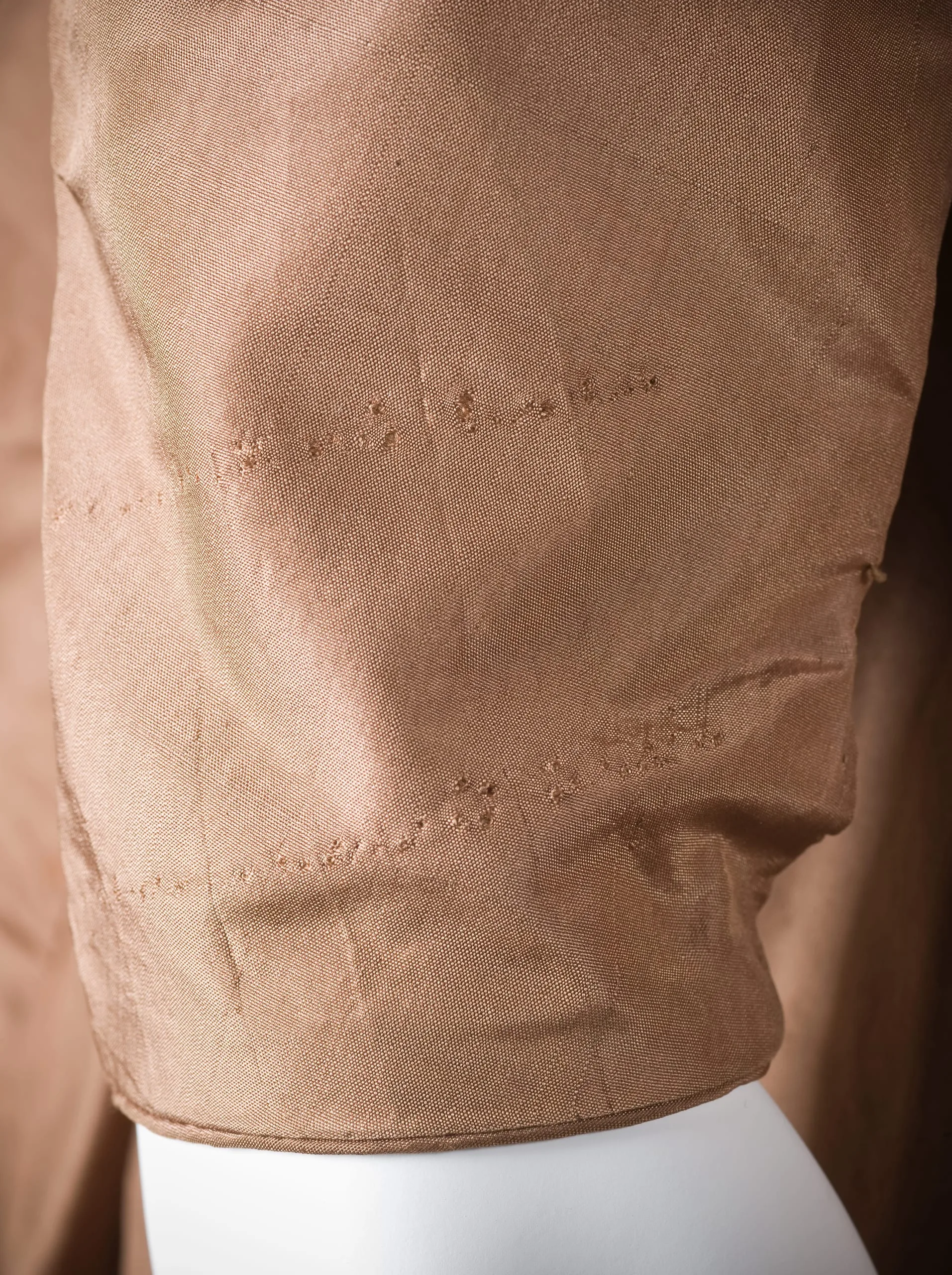 - Silk plain weave (taffeta) with silk cord embroidery and silk braid
