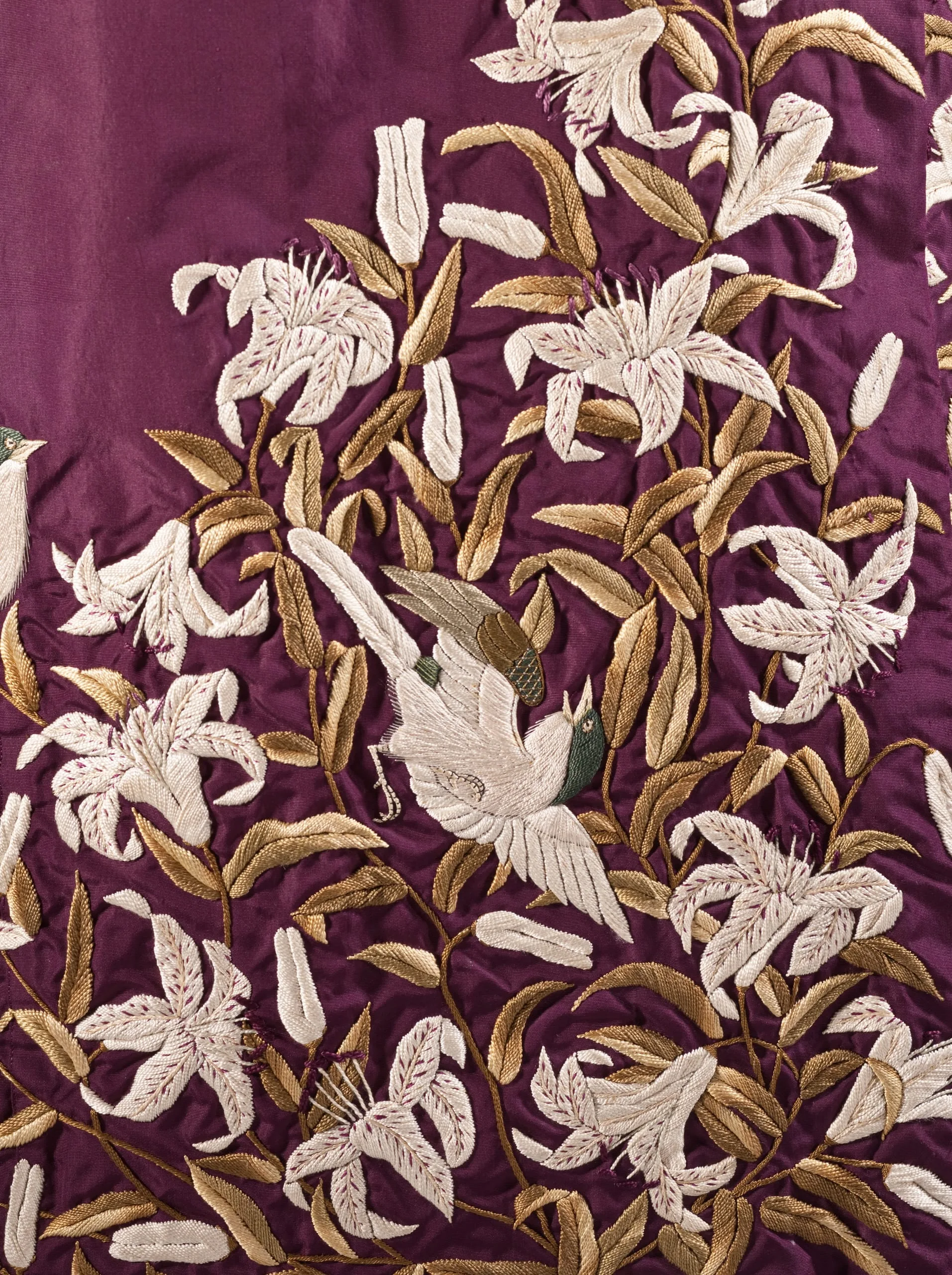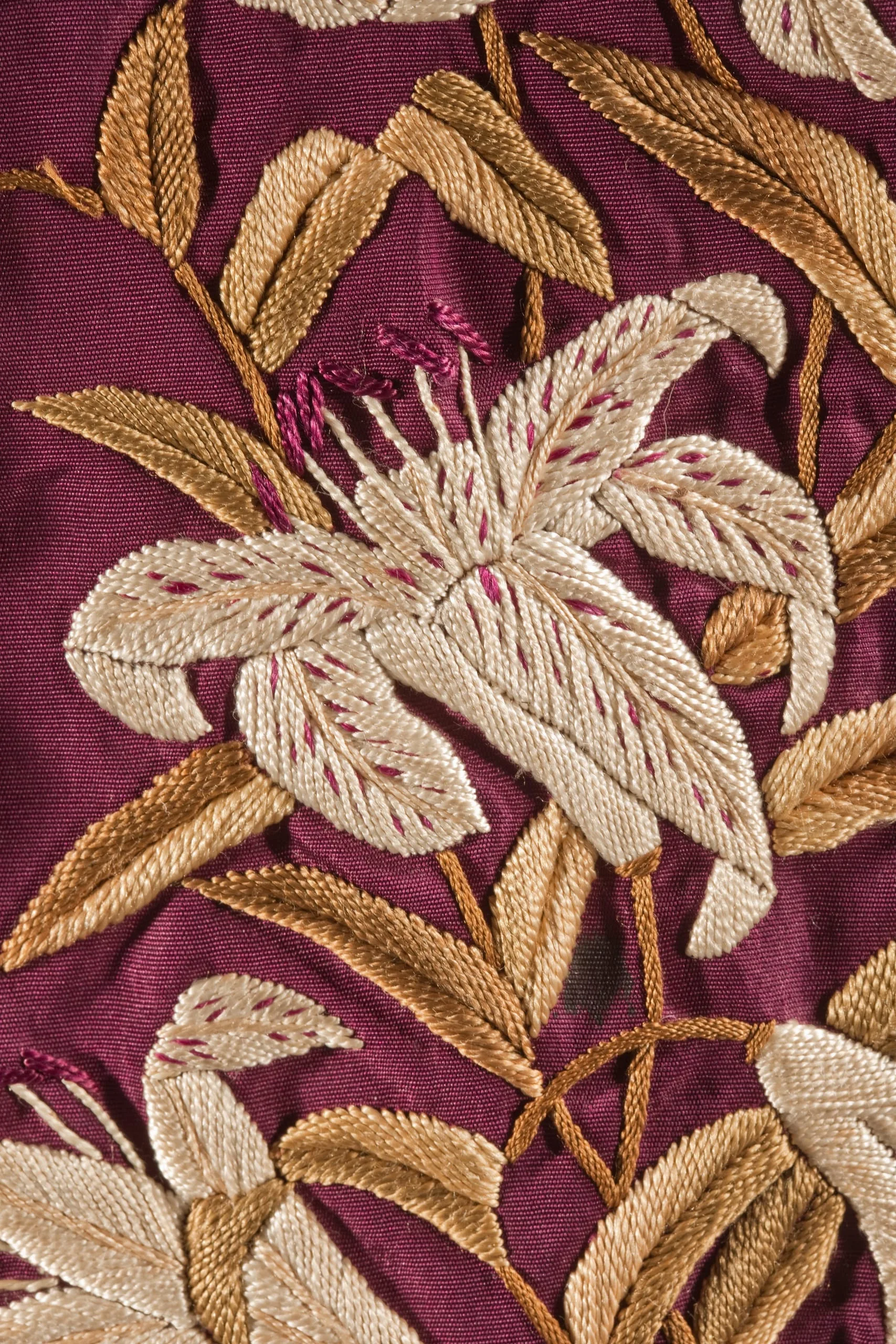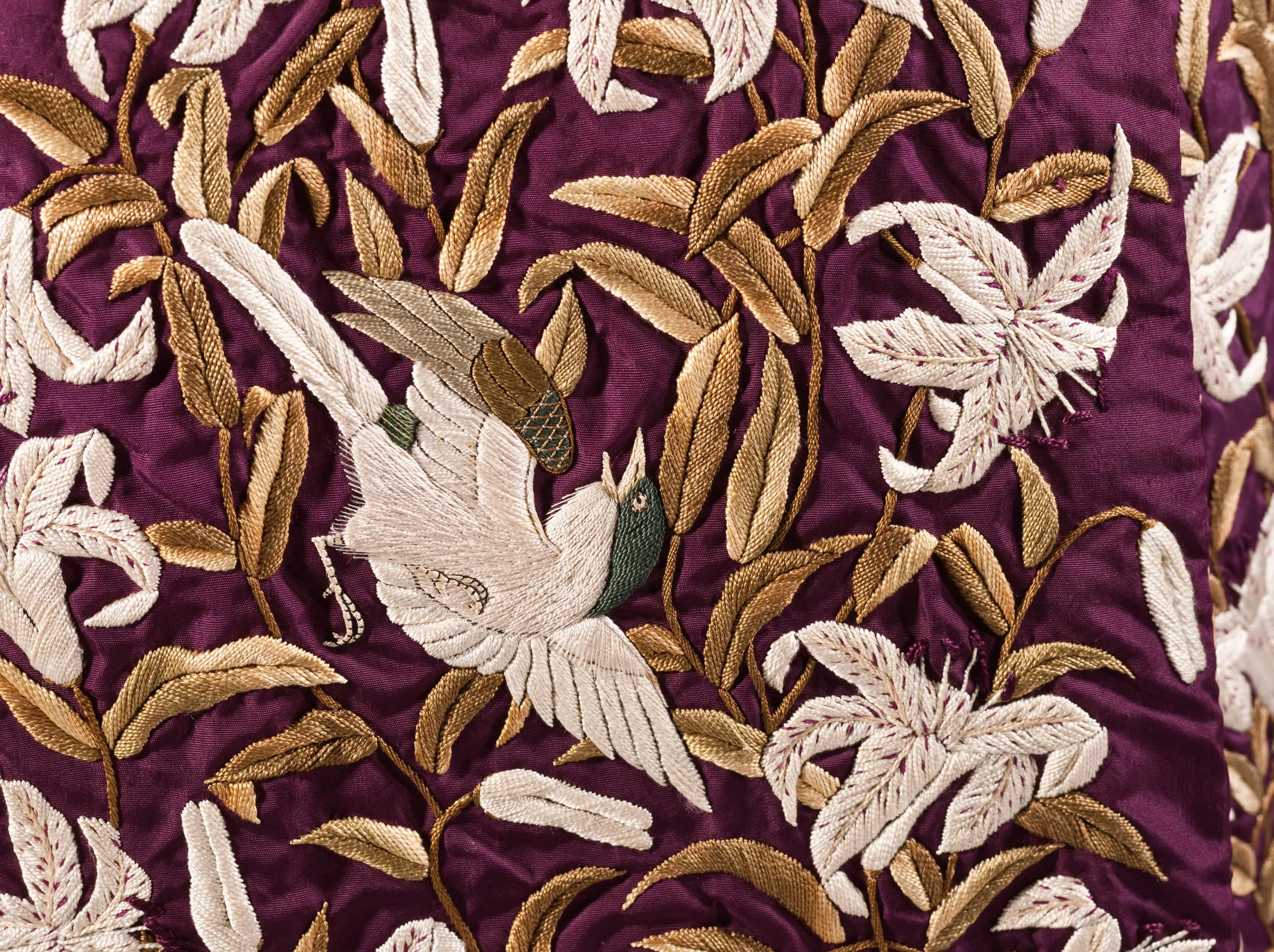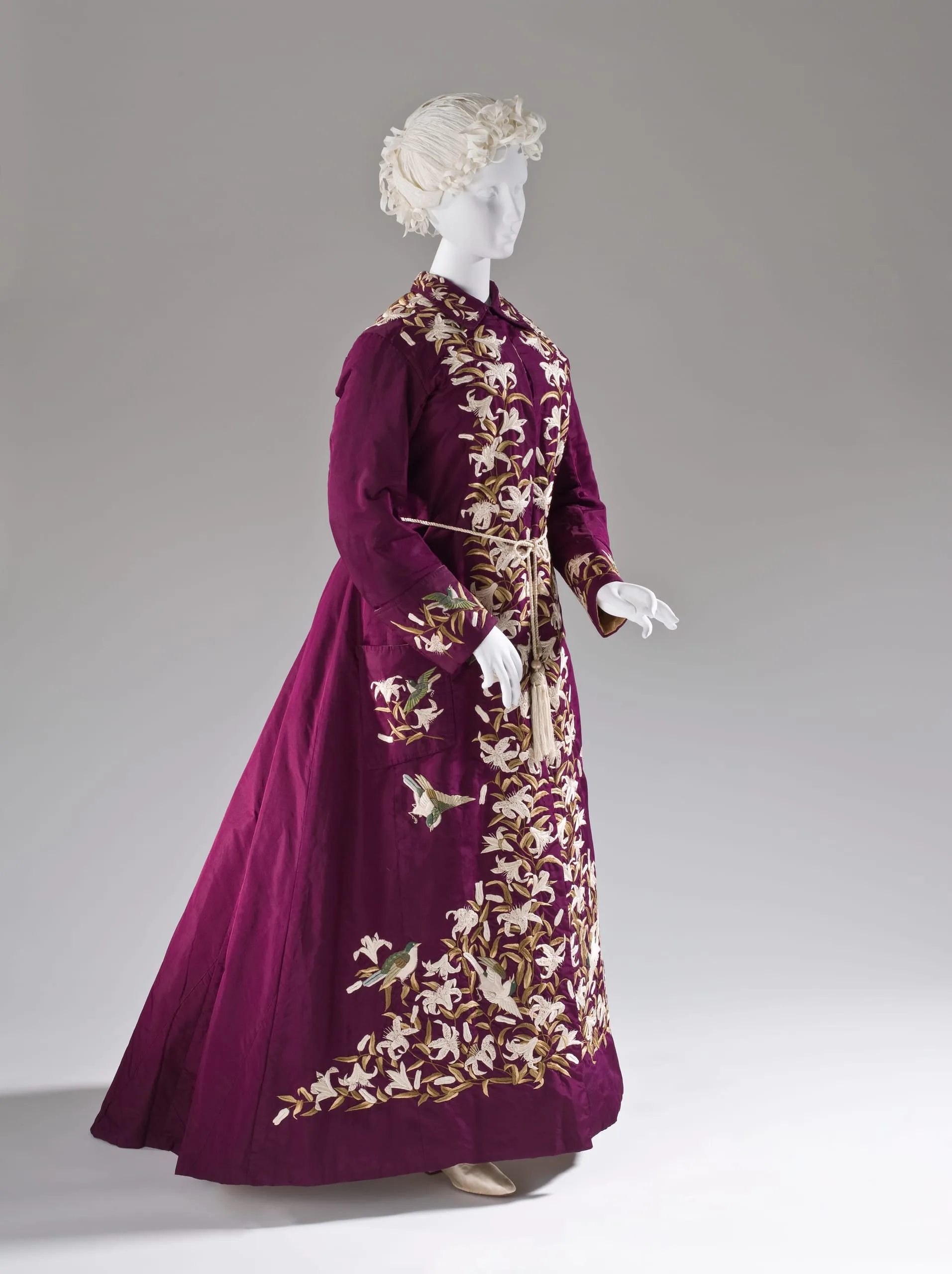 - Dressing gown: silk plain weave (faille) with silk and metallic thread embroidery; Belt: silk braided cord with tassels