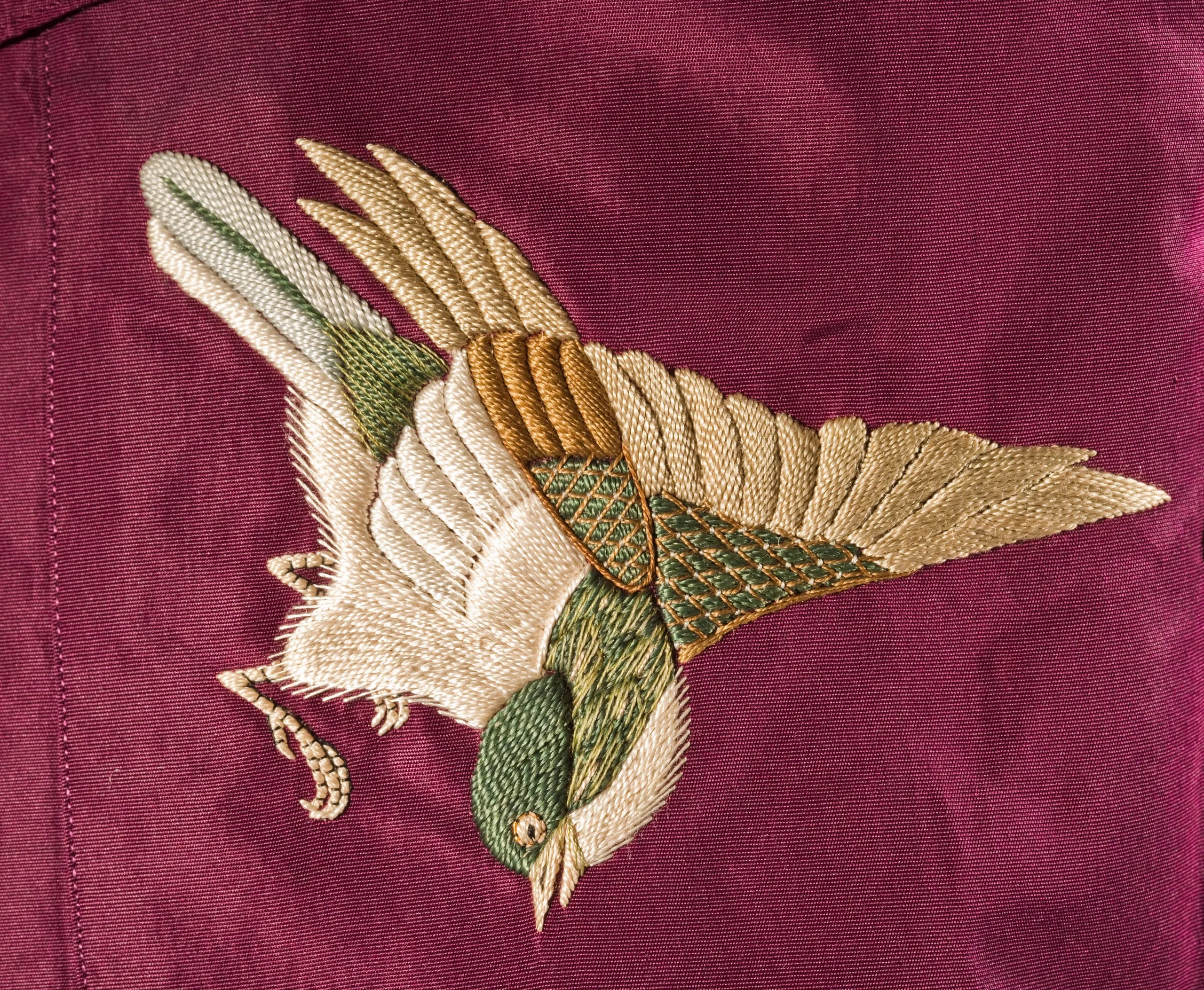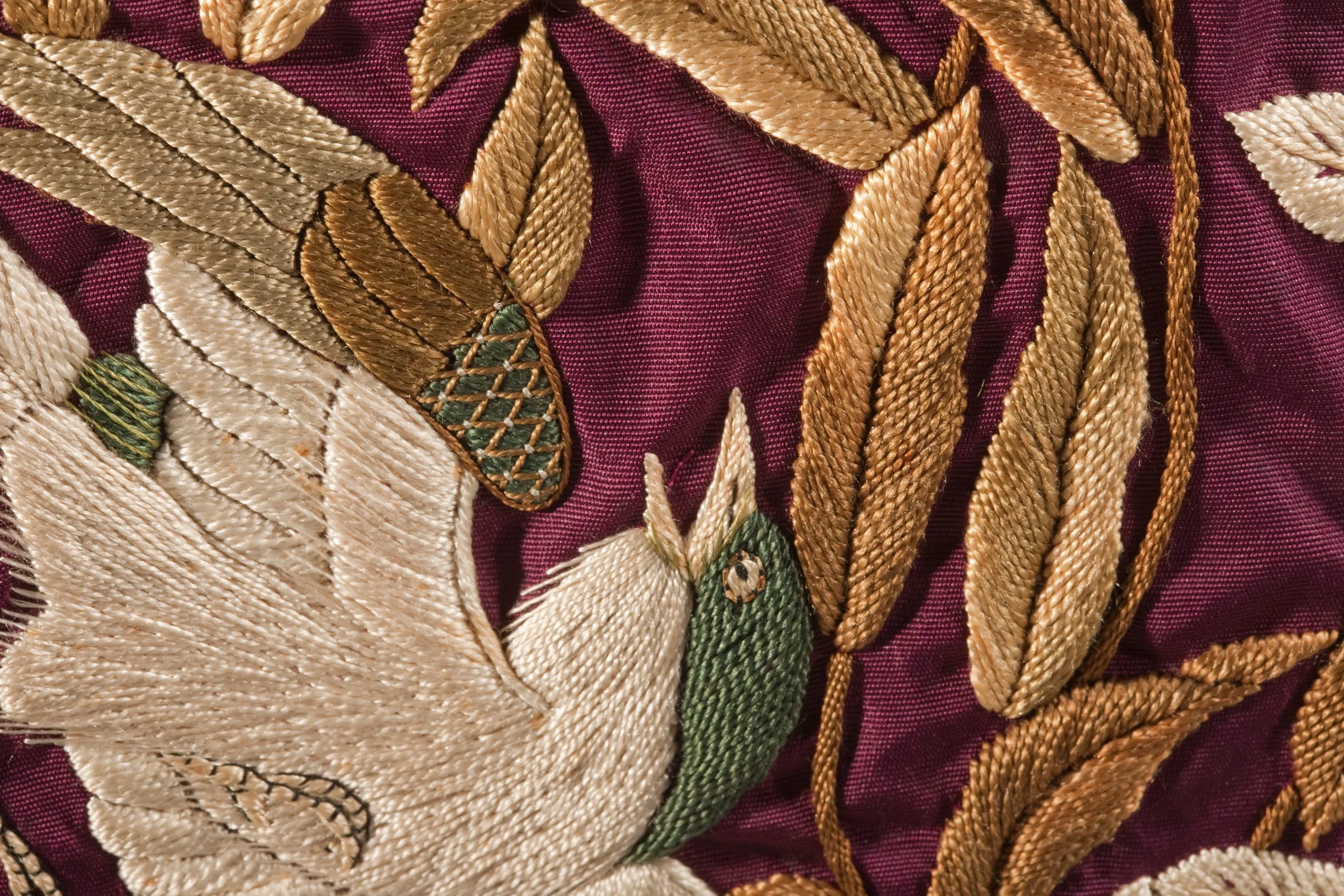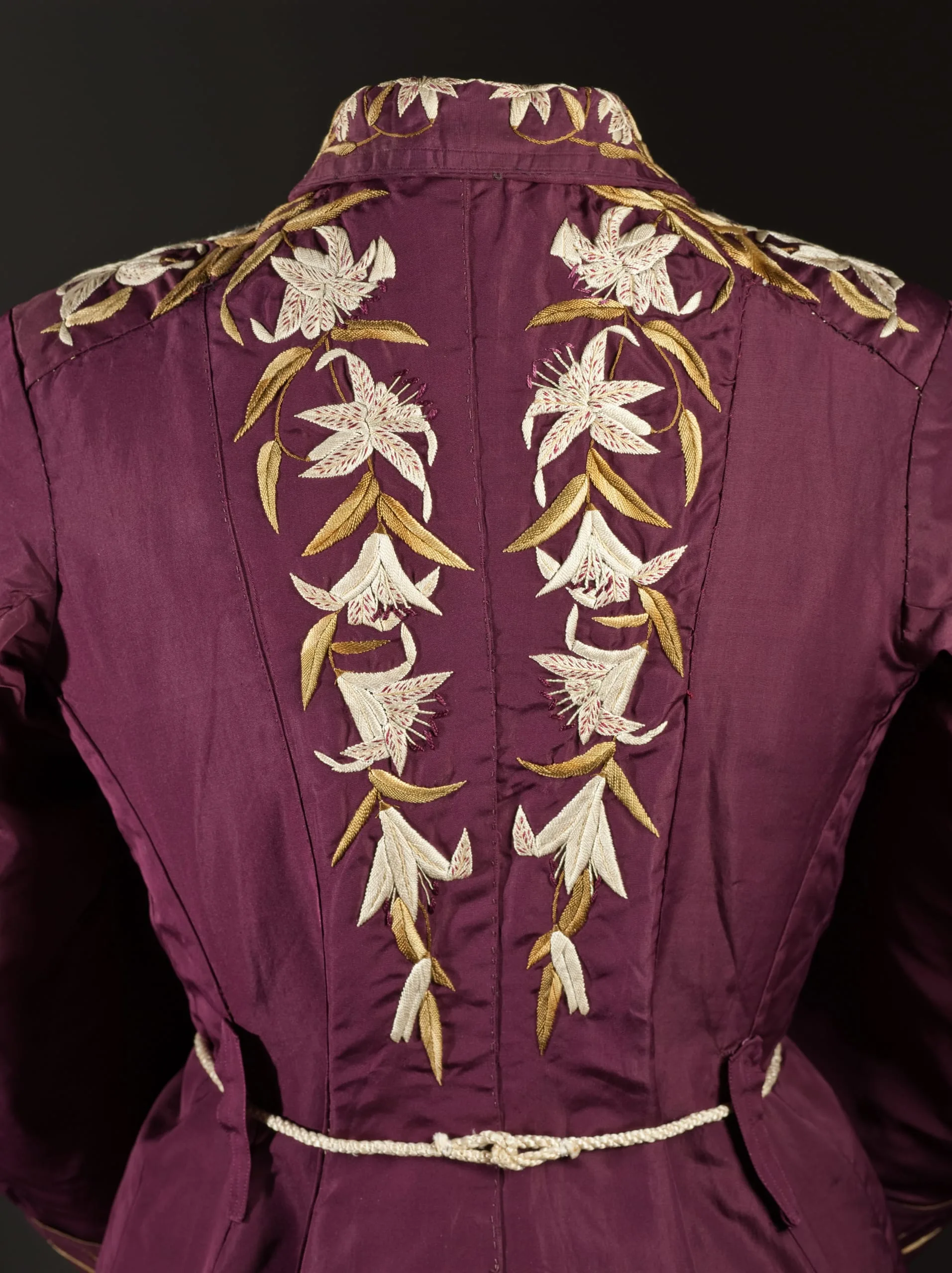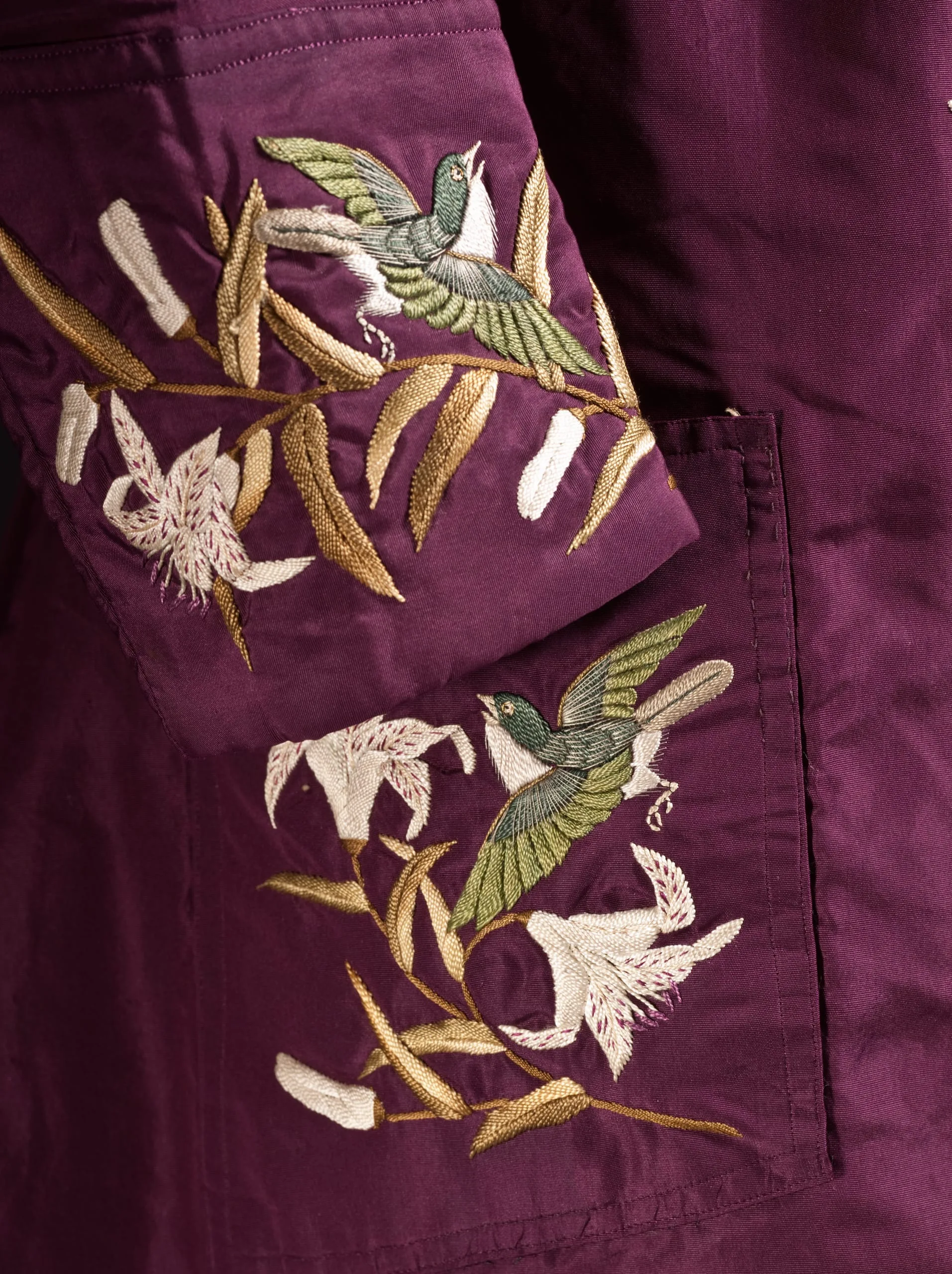 - Dressing gown: silk plain weave (faille) with silk and metallic thread embroidery; Belt: silk braided cord with tassels