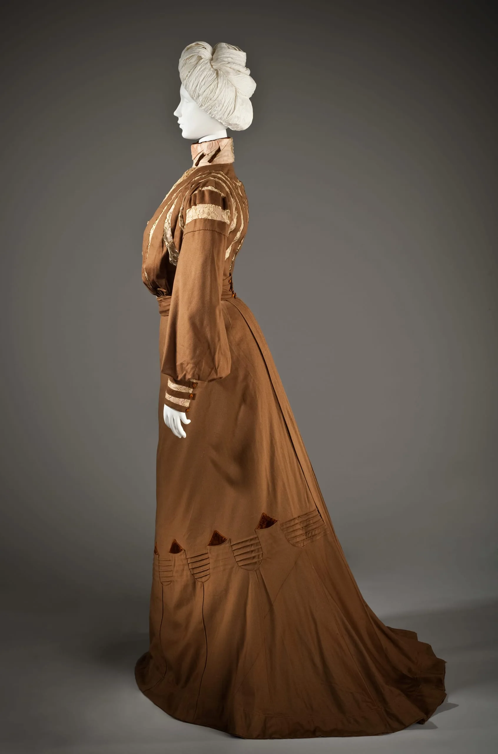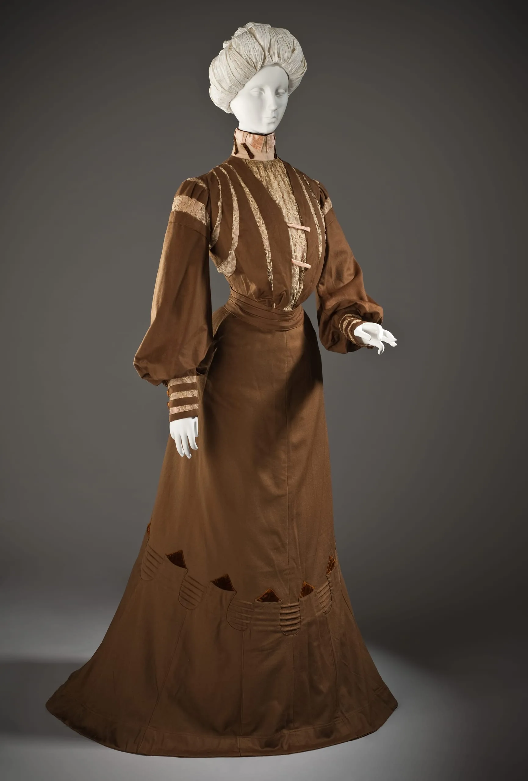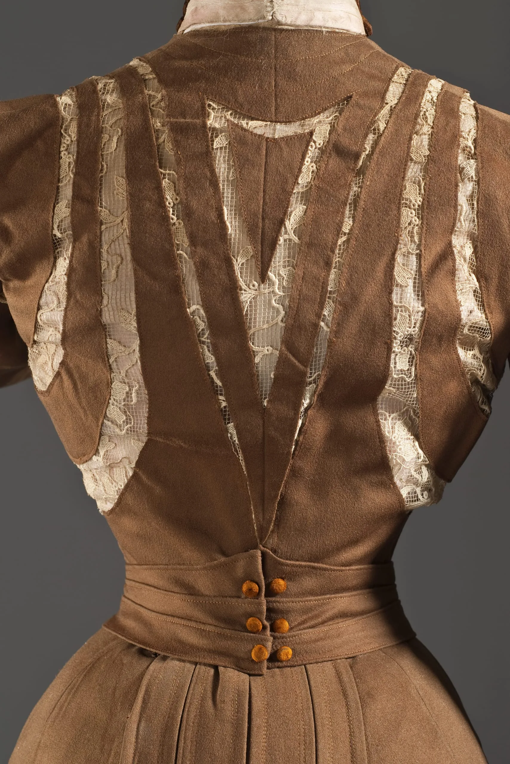 - Wool twill, full finish, with linen lace, silk crepe, silk velvet, and cotton plain-weave trim