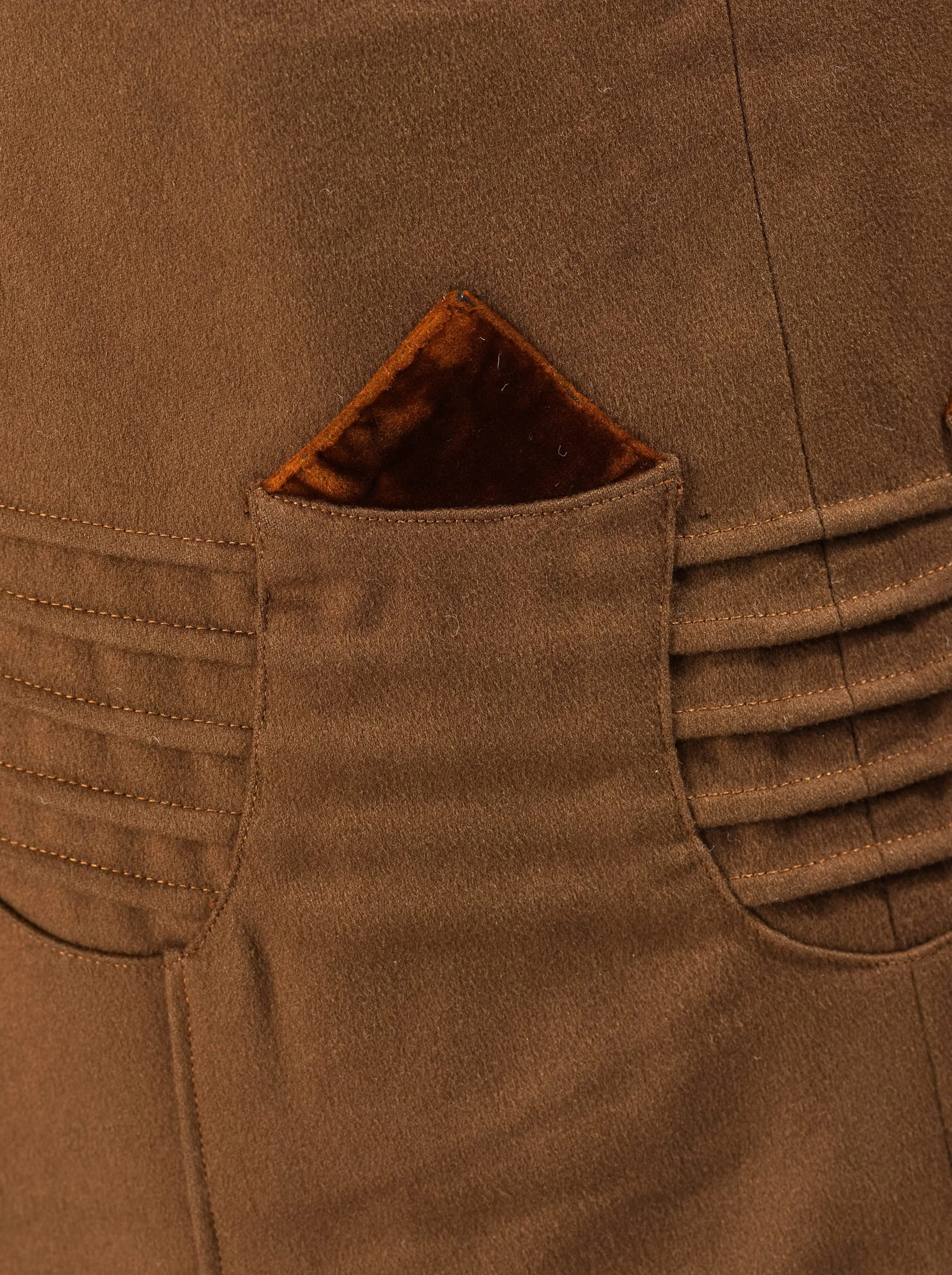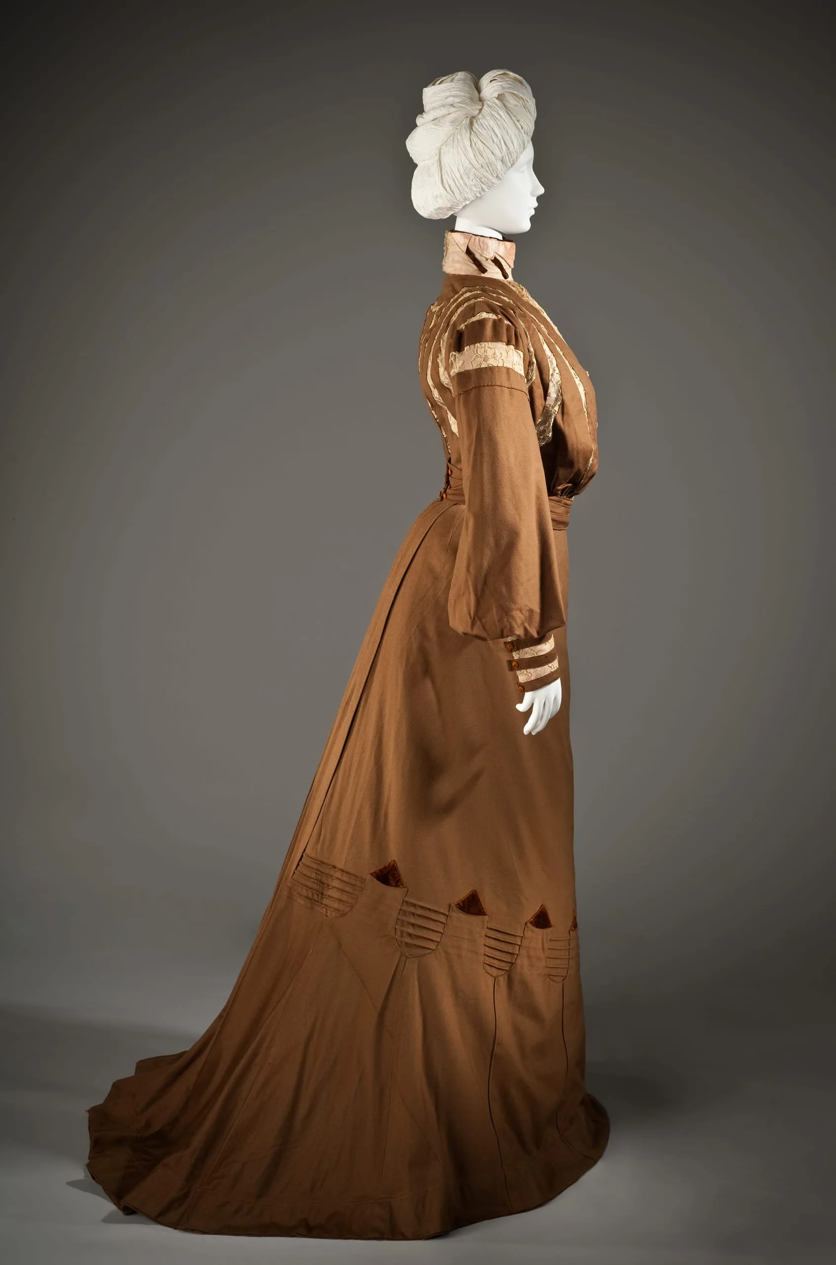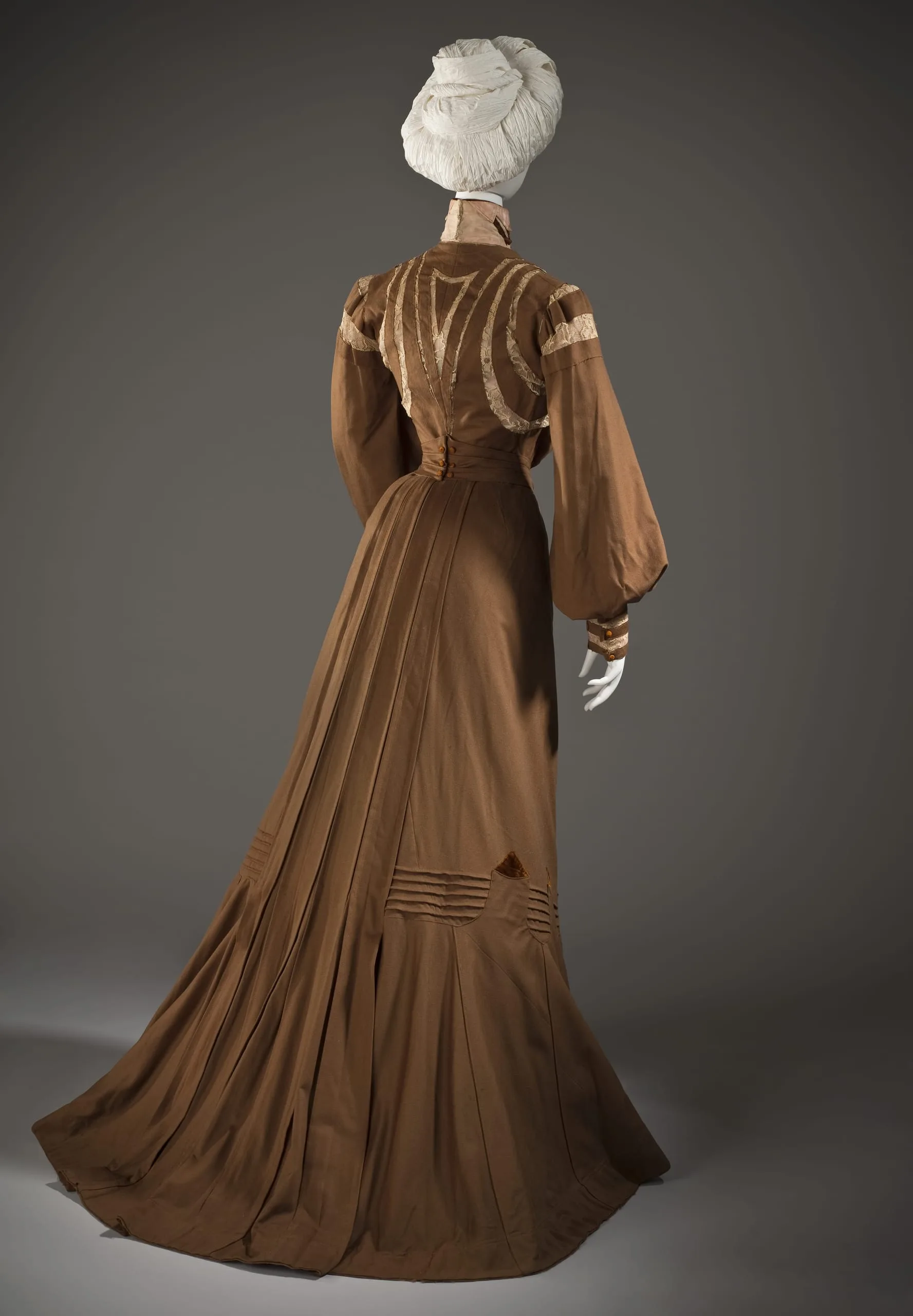 - Wool twill, full finish, with linen lace, silk crepe, silk velvet, and cotton plain-weave trim