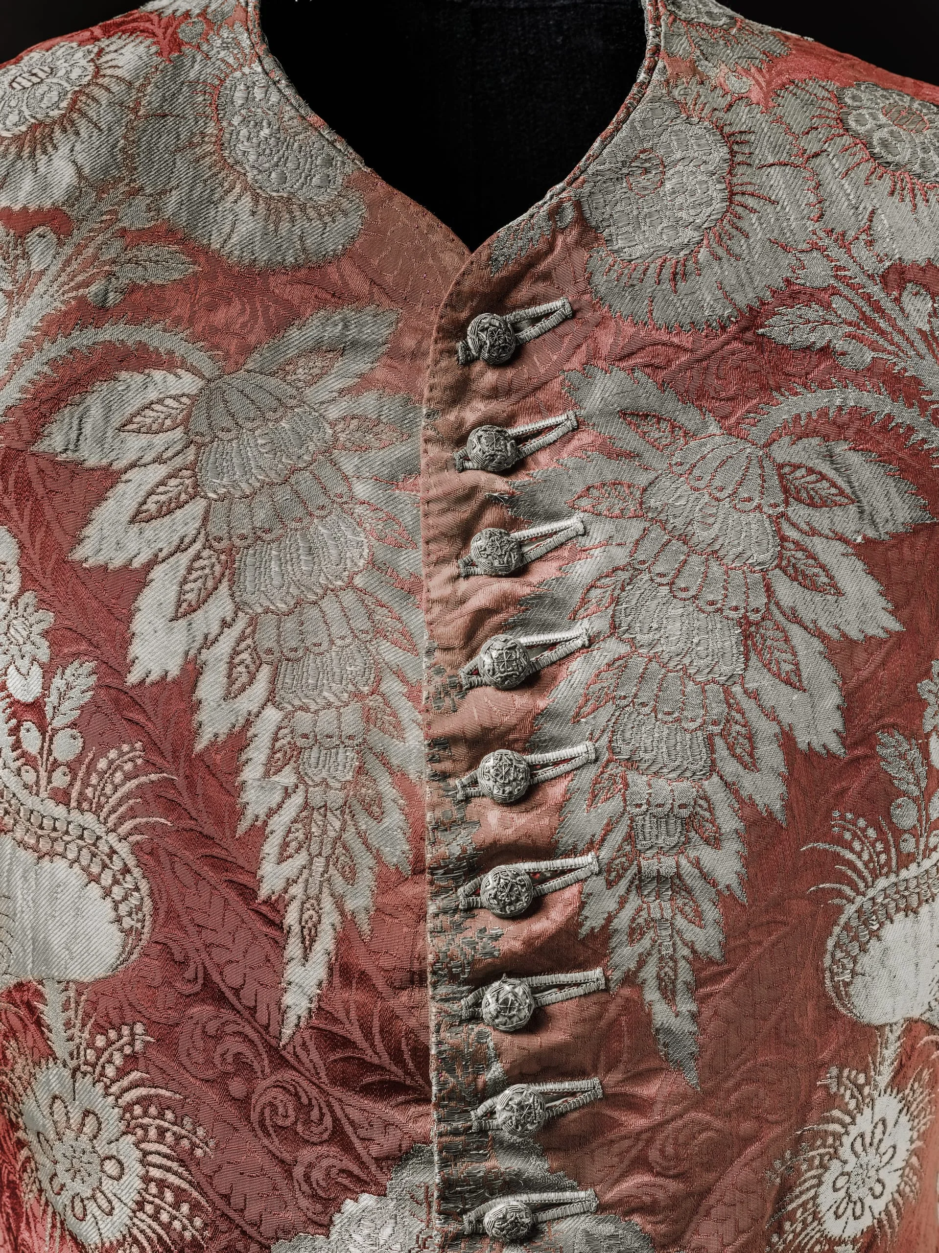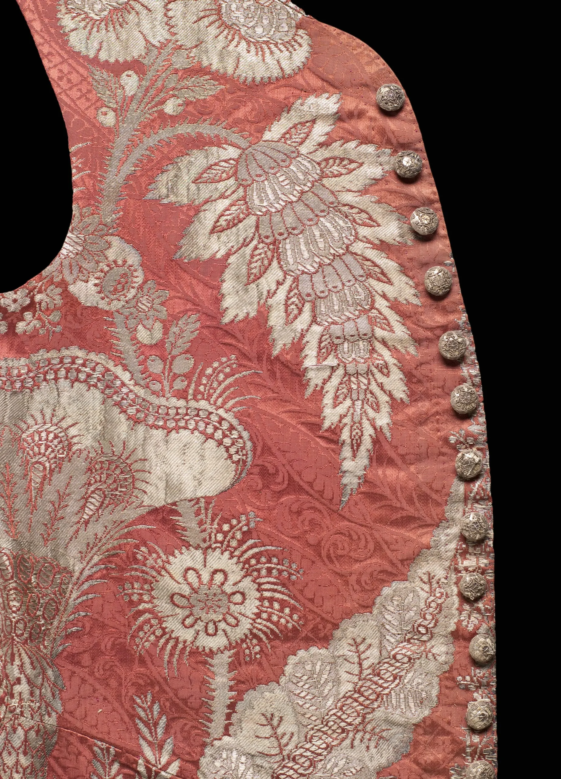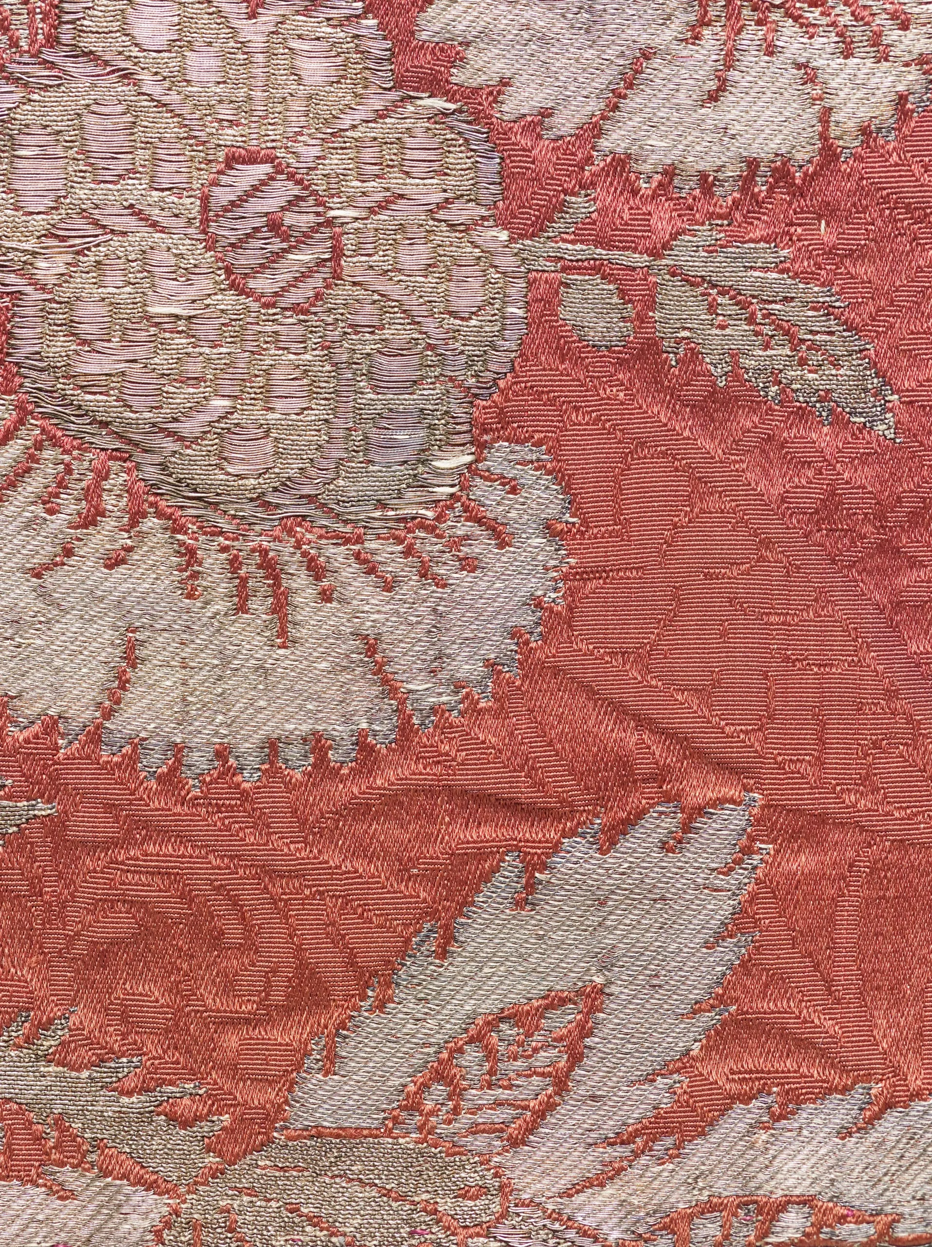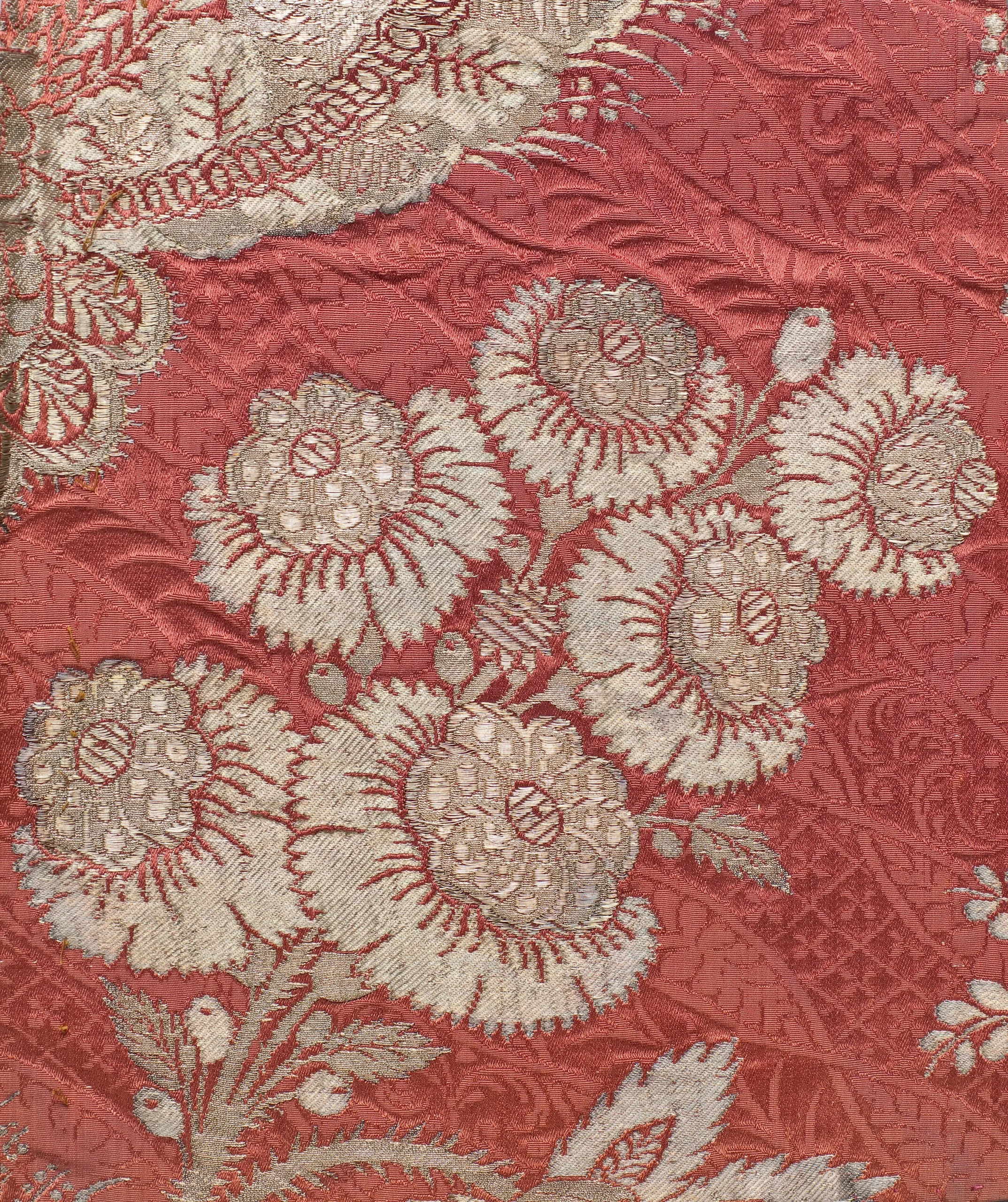 - Silk twill and plain weave (gros de tours) with silk- and metallic-thread discontinuous supplementary-weft patterning bound in twill (lampas)
