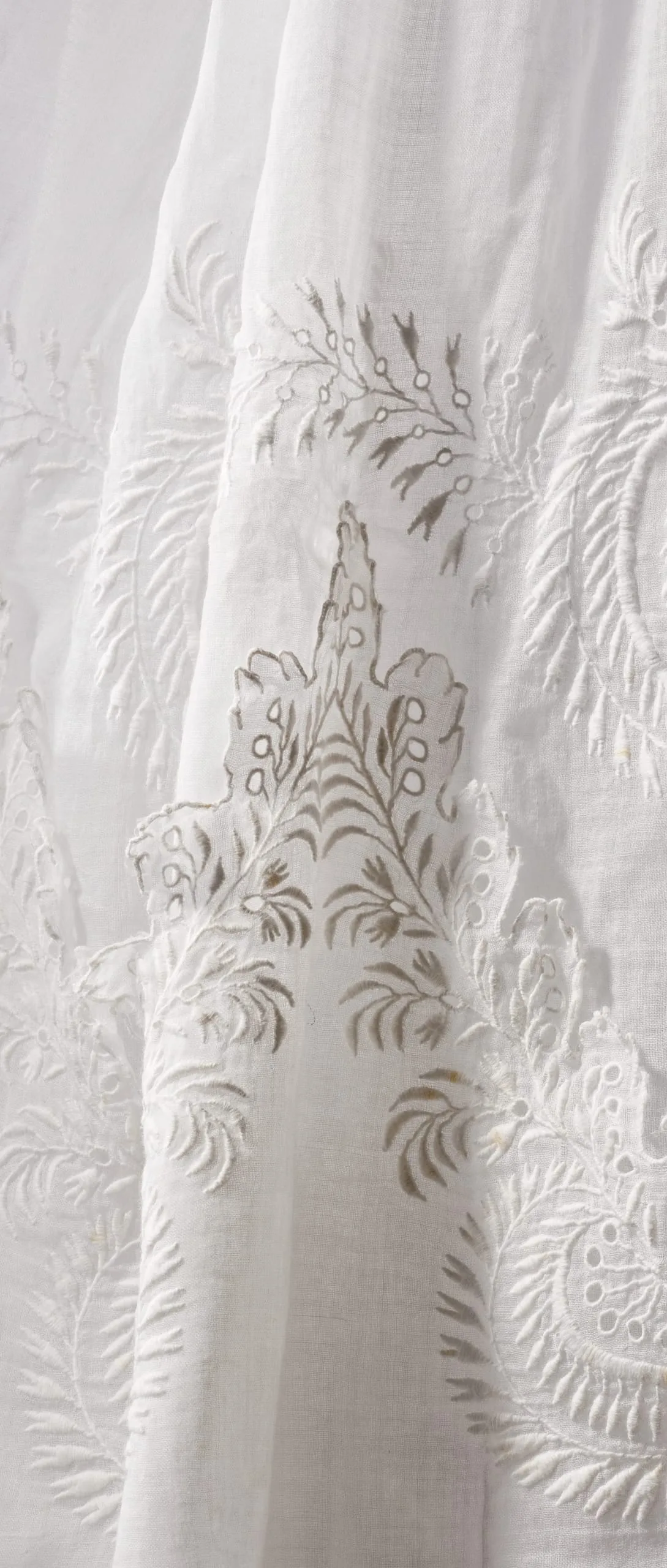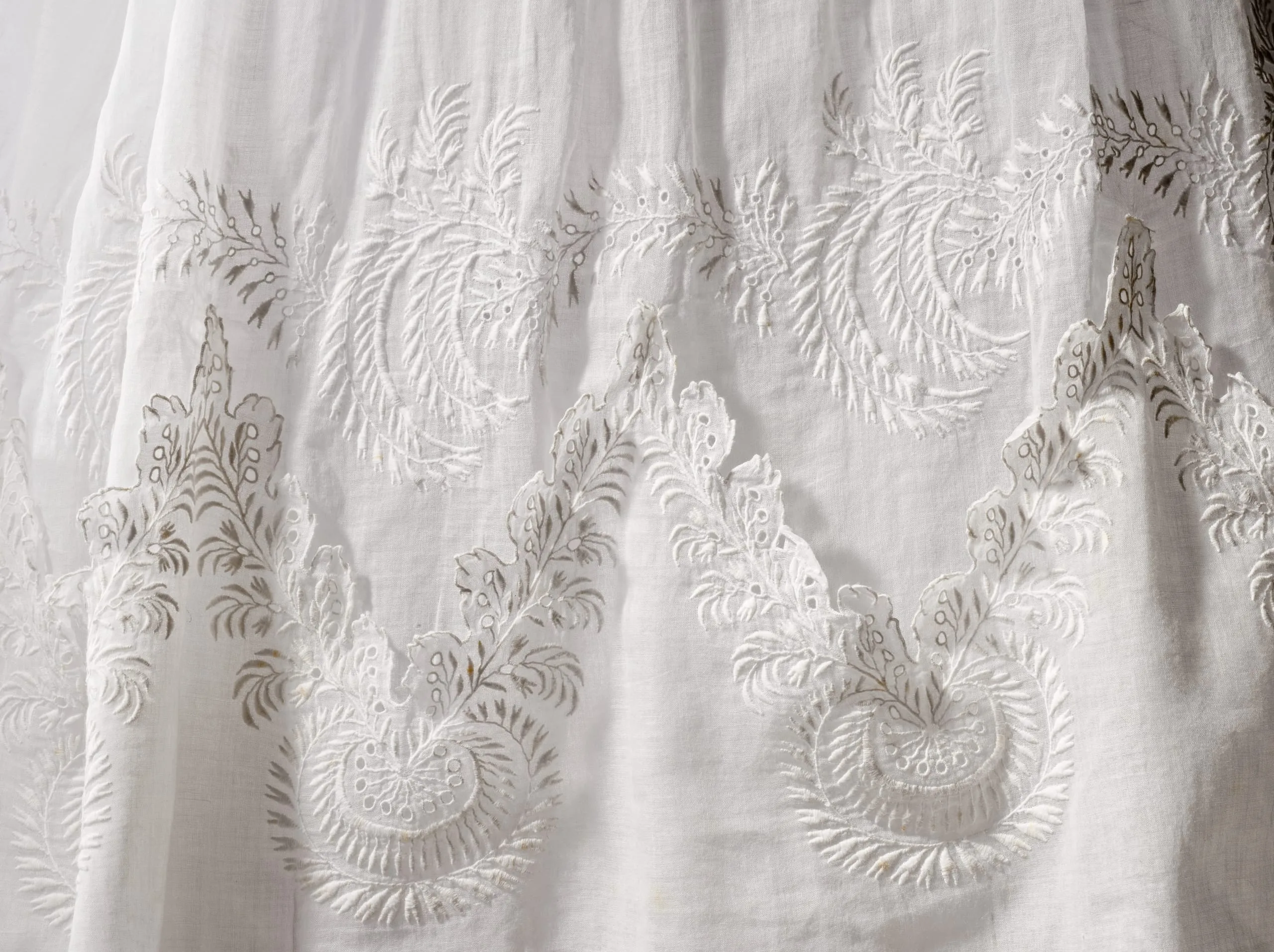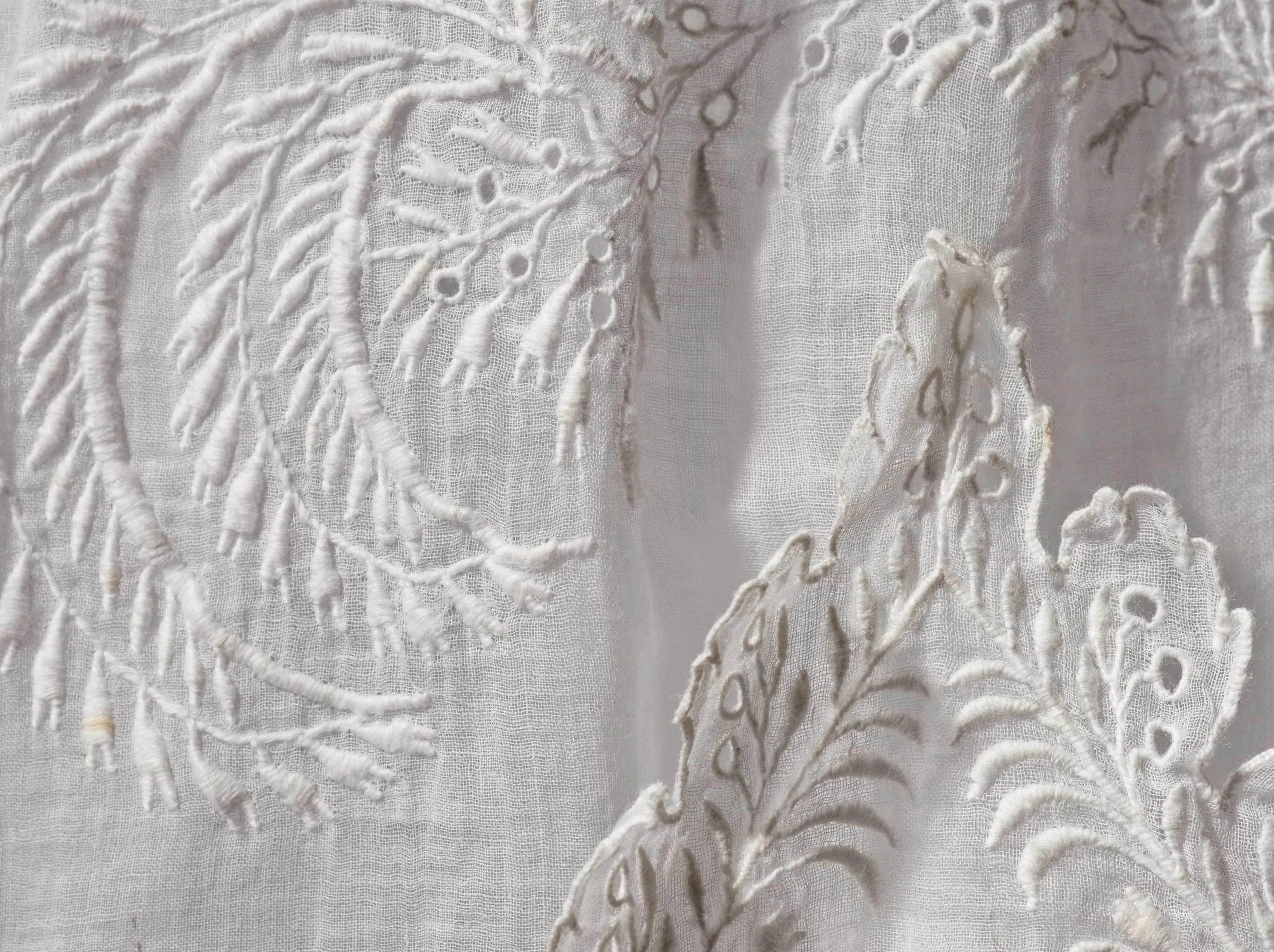 - Cotton plain weave (muslin) with cutwork and cotton embroidery