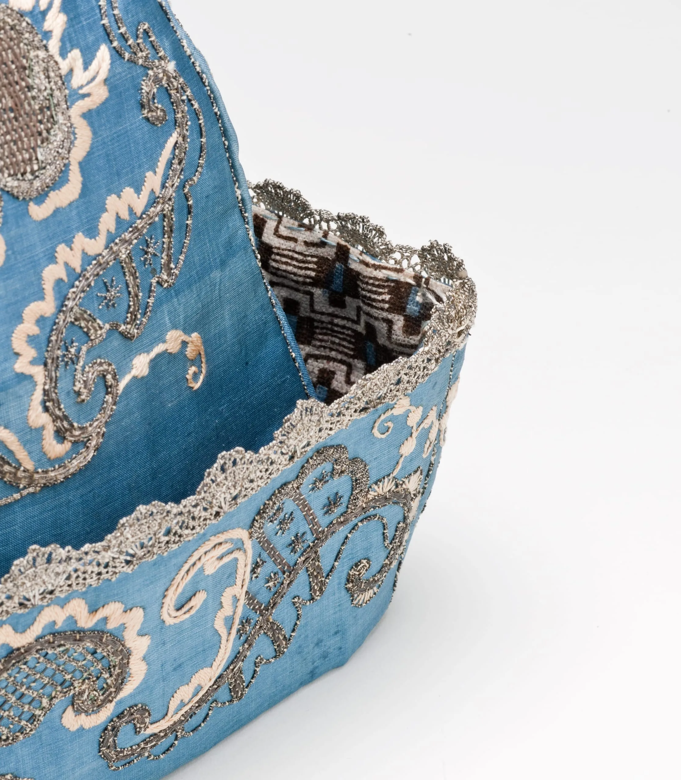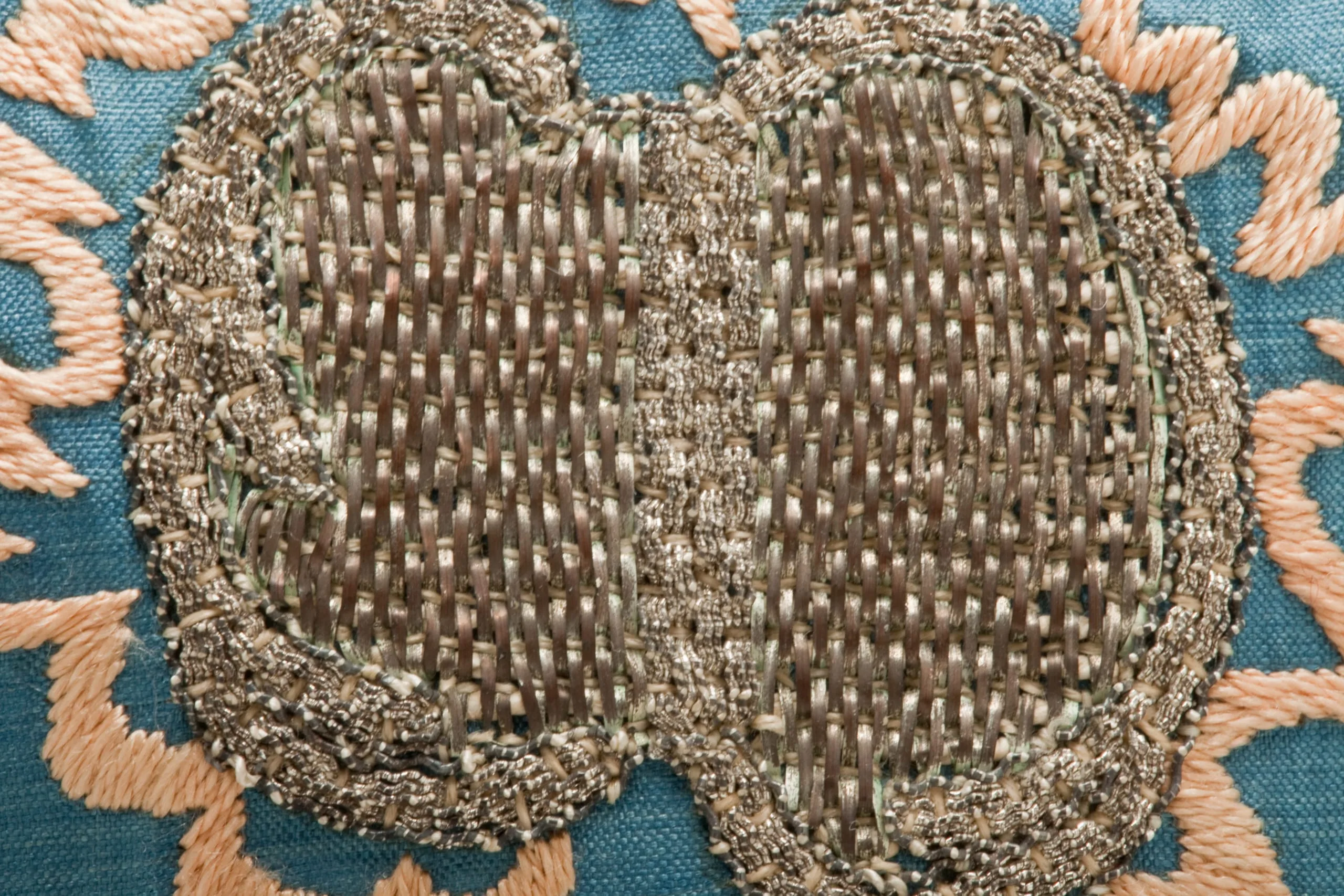 - Silk plain weave with silk and metallic-thread embroidery, and metallic-thread lace trim