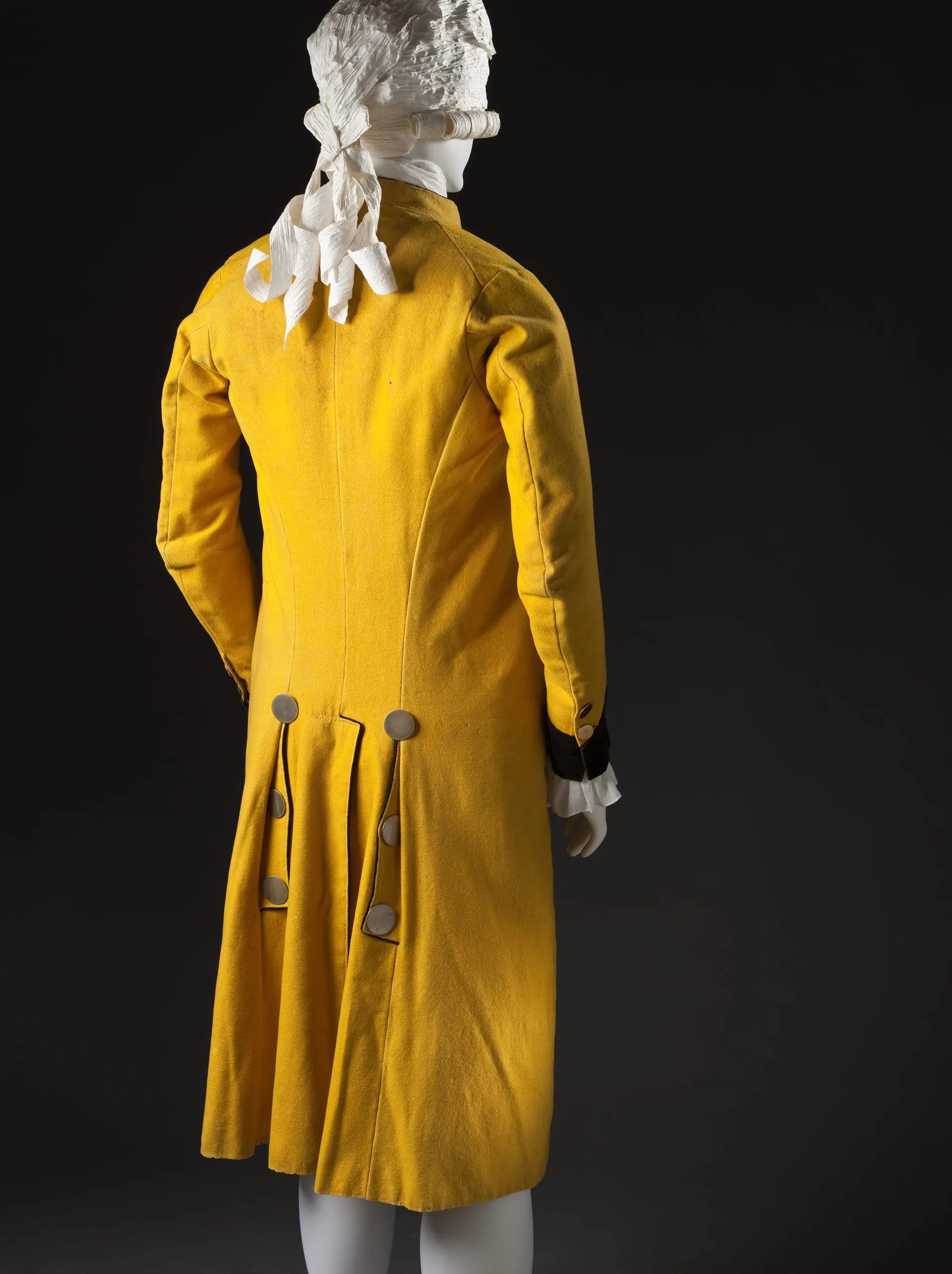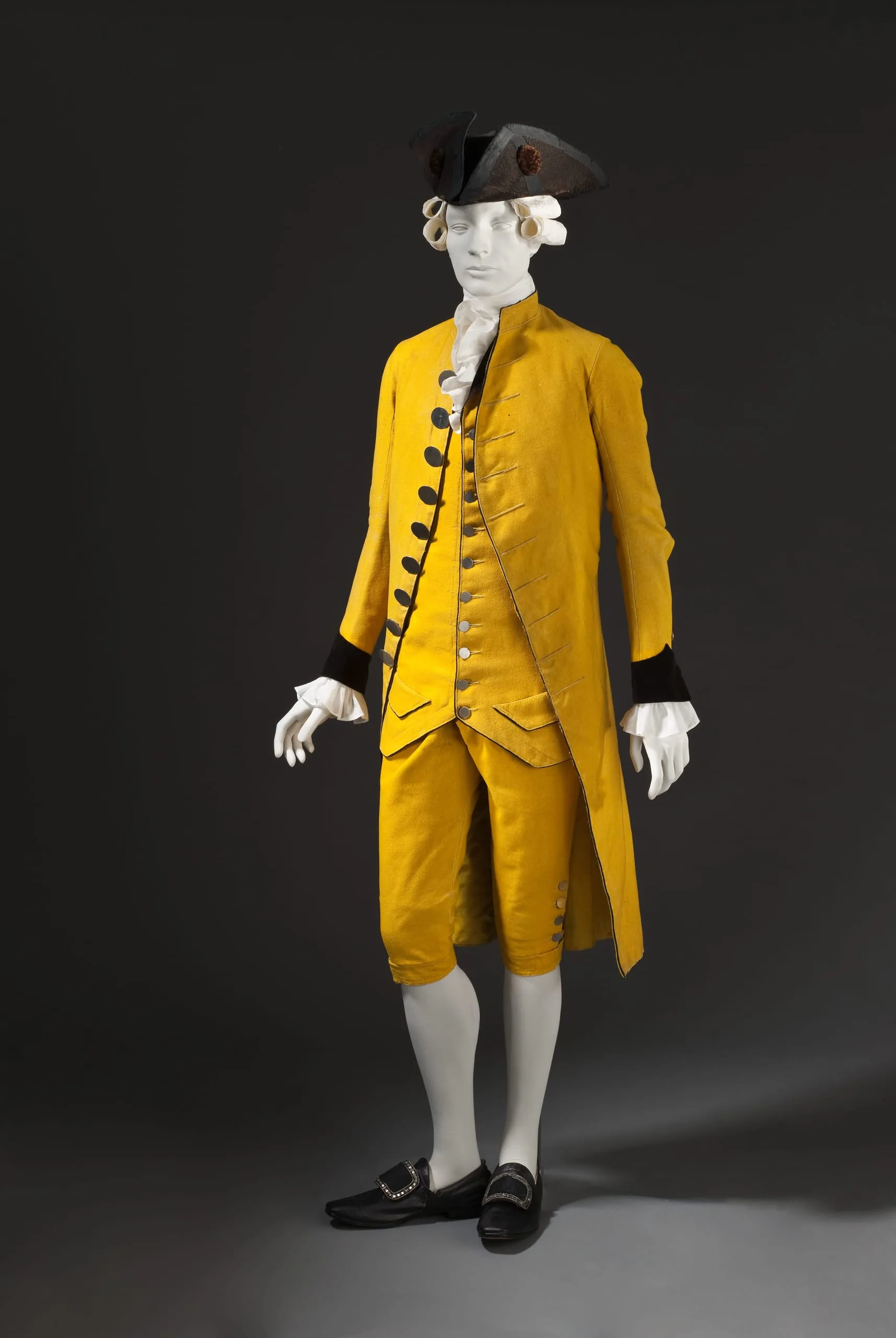 - Coat: Wool plain weave, full finish, with cotton velveteen, wool cord, and metal buttons; Waistcoat: Wool plain weave, full finish, with silk velvet, wool cord, and metal buttons; Breeches: Wool plain weave, full finish, with metal buttons