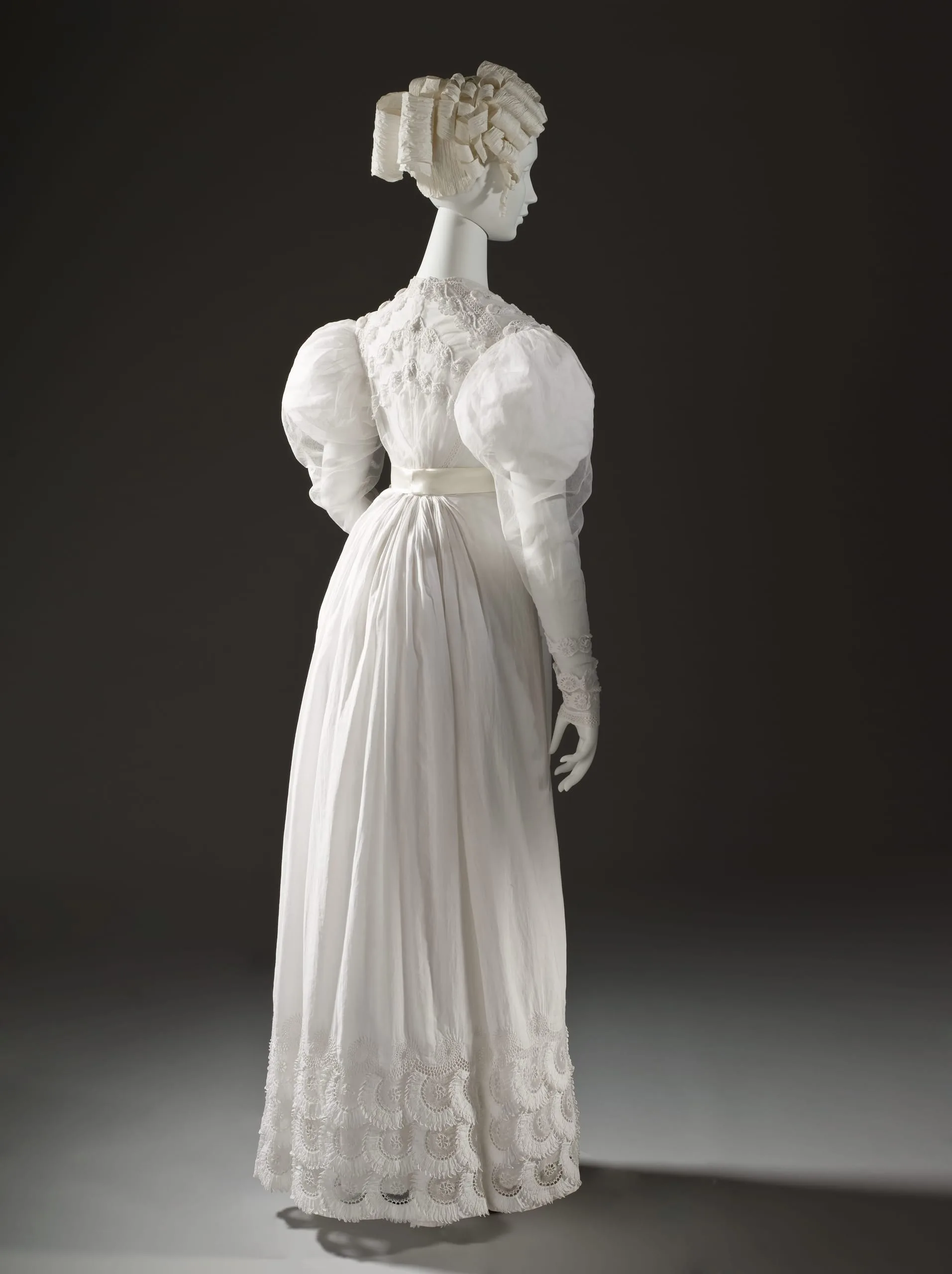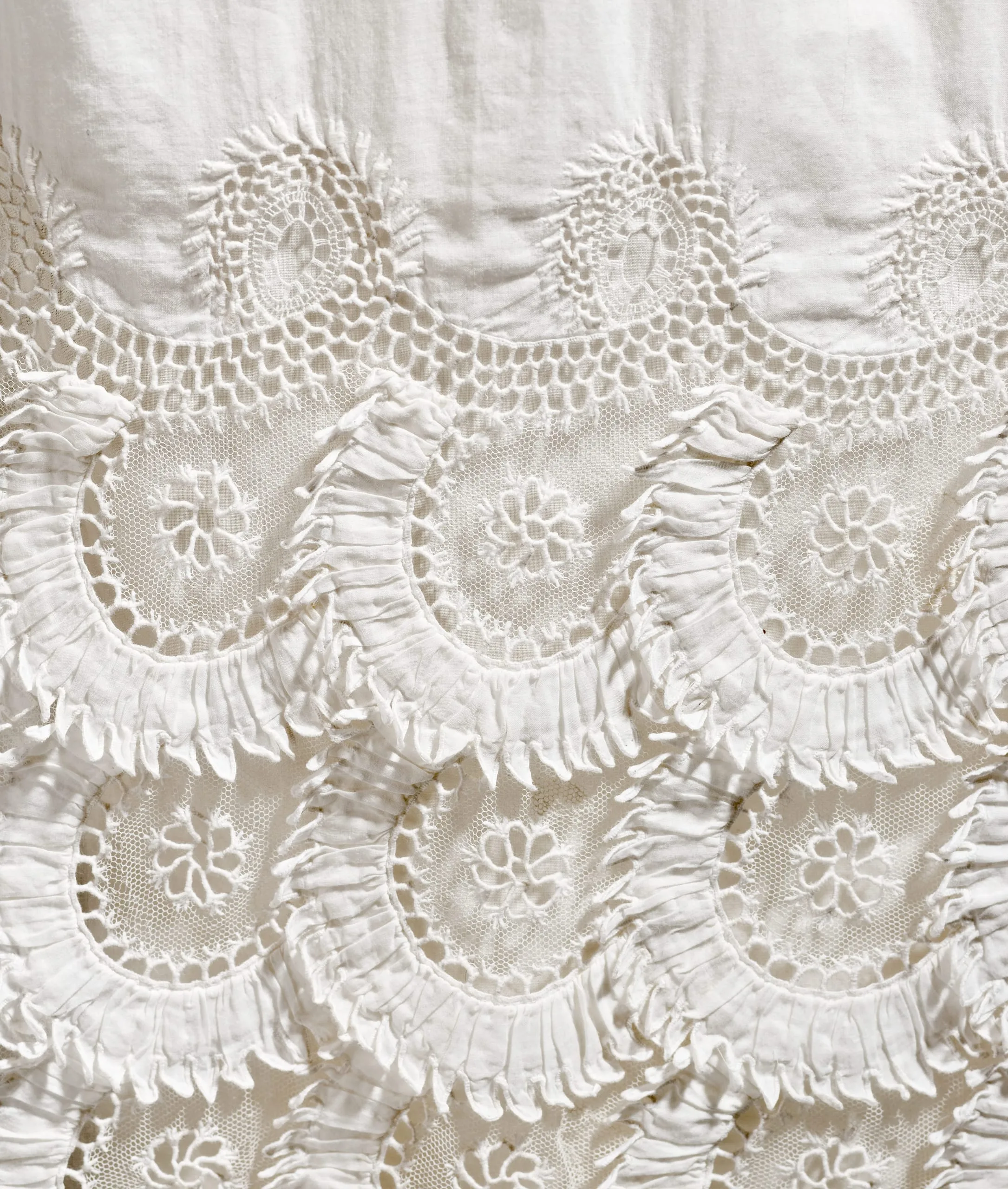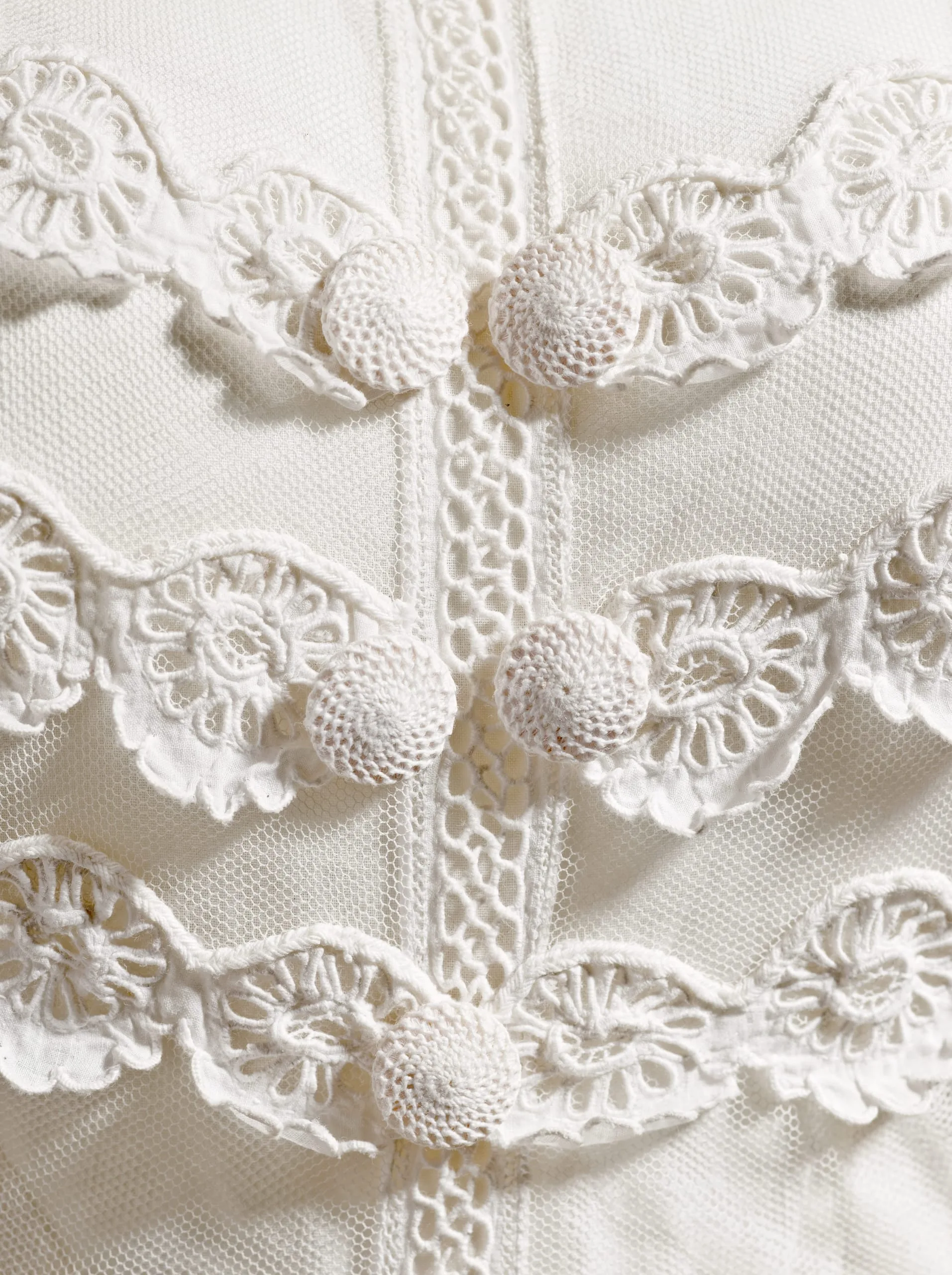 - Linen plain weave and silk net with cotton cutwork embroidery (broderie anglaise) and cotton crochet covered buttons