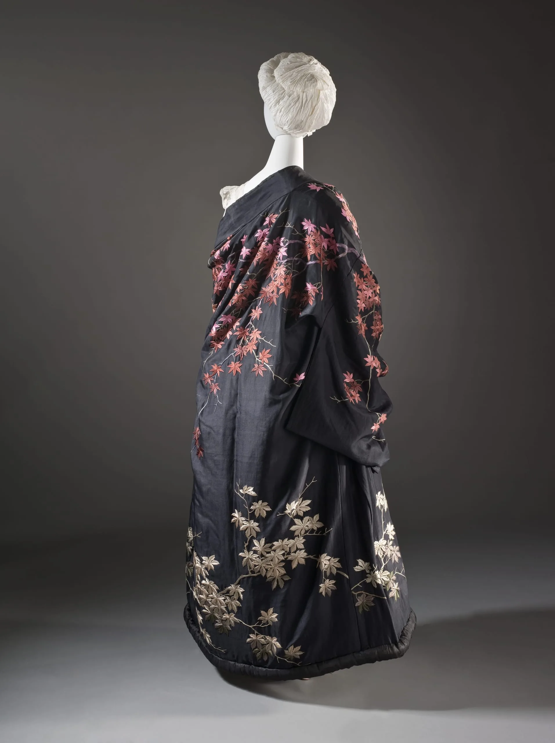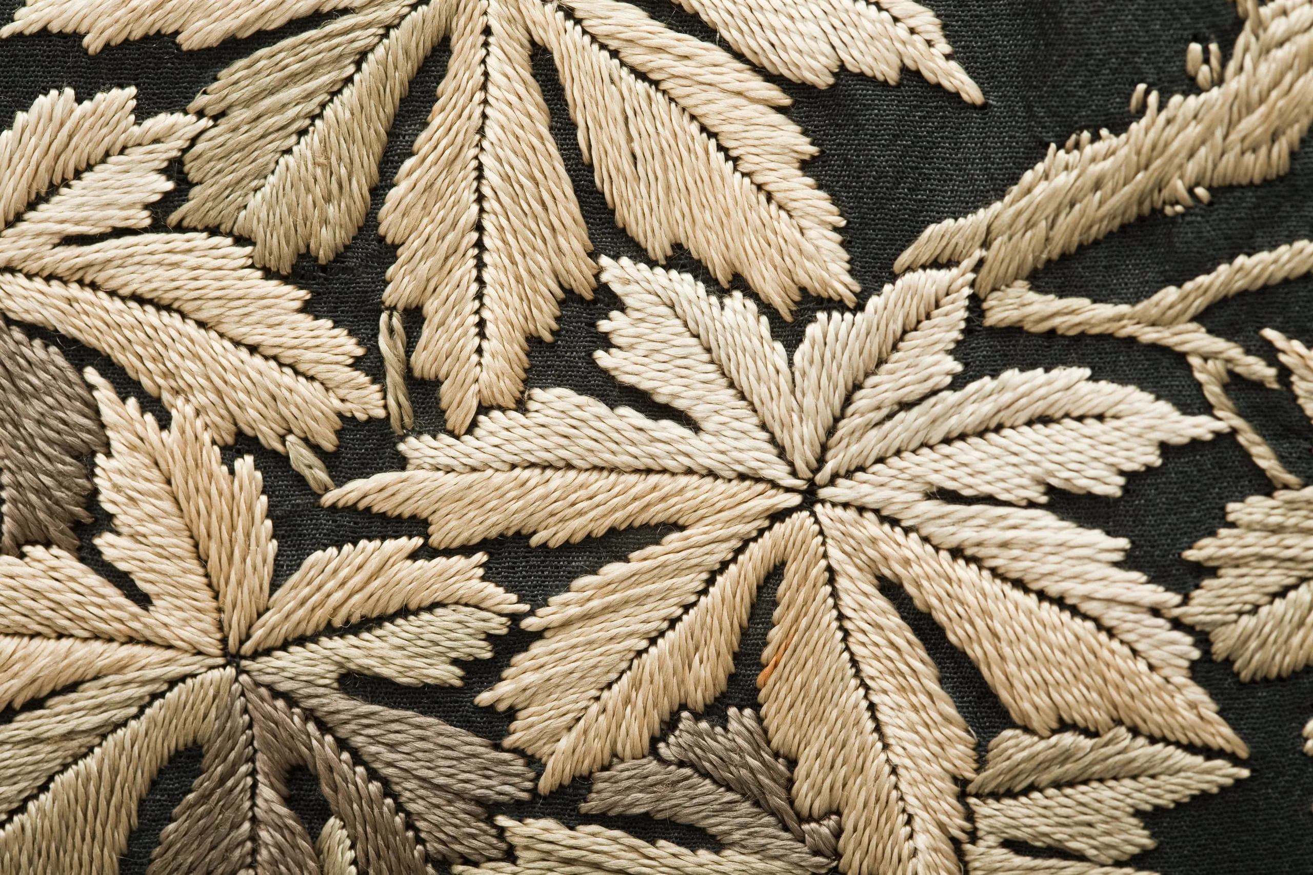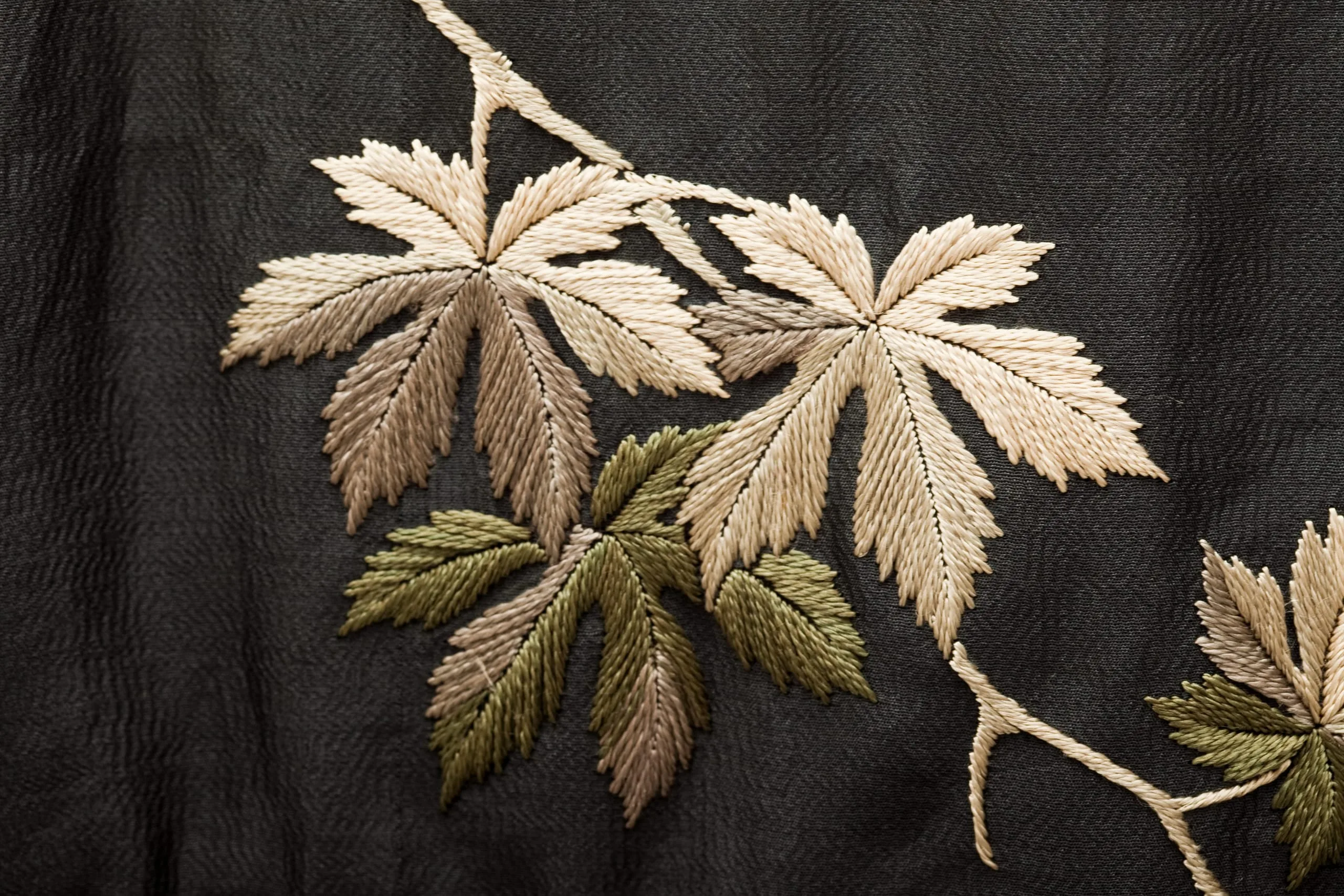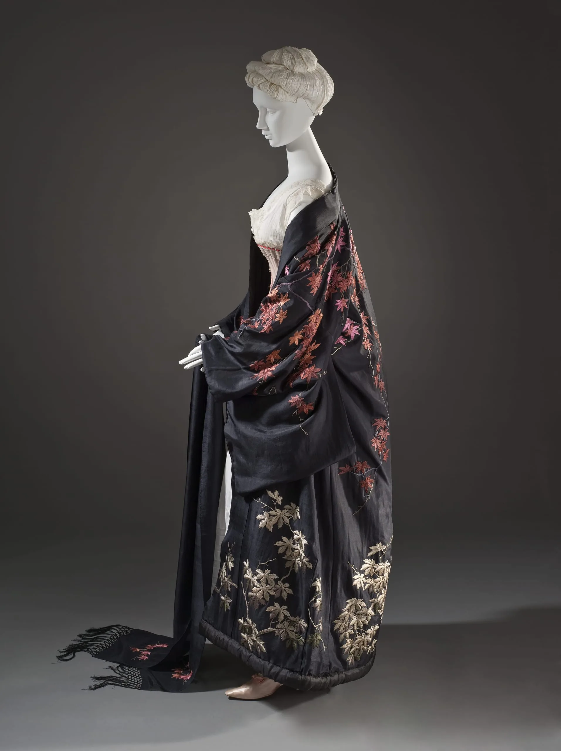- Gown: silk crepe with silk embroidery; sash: silk plain weave with silk embroidery and silk knotted fringe