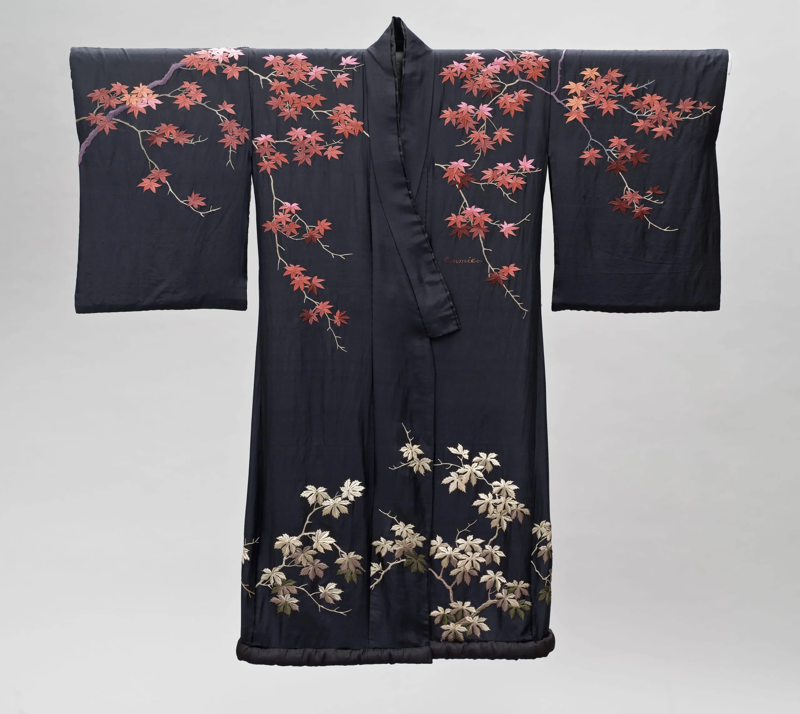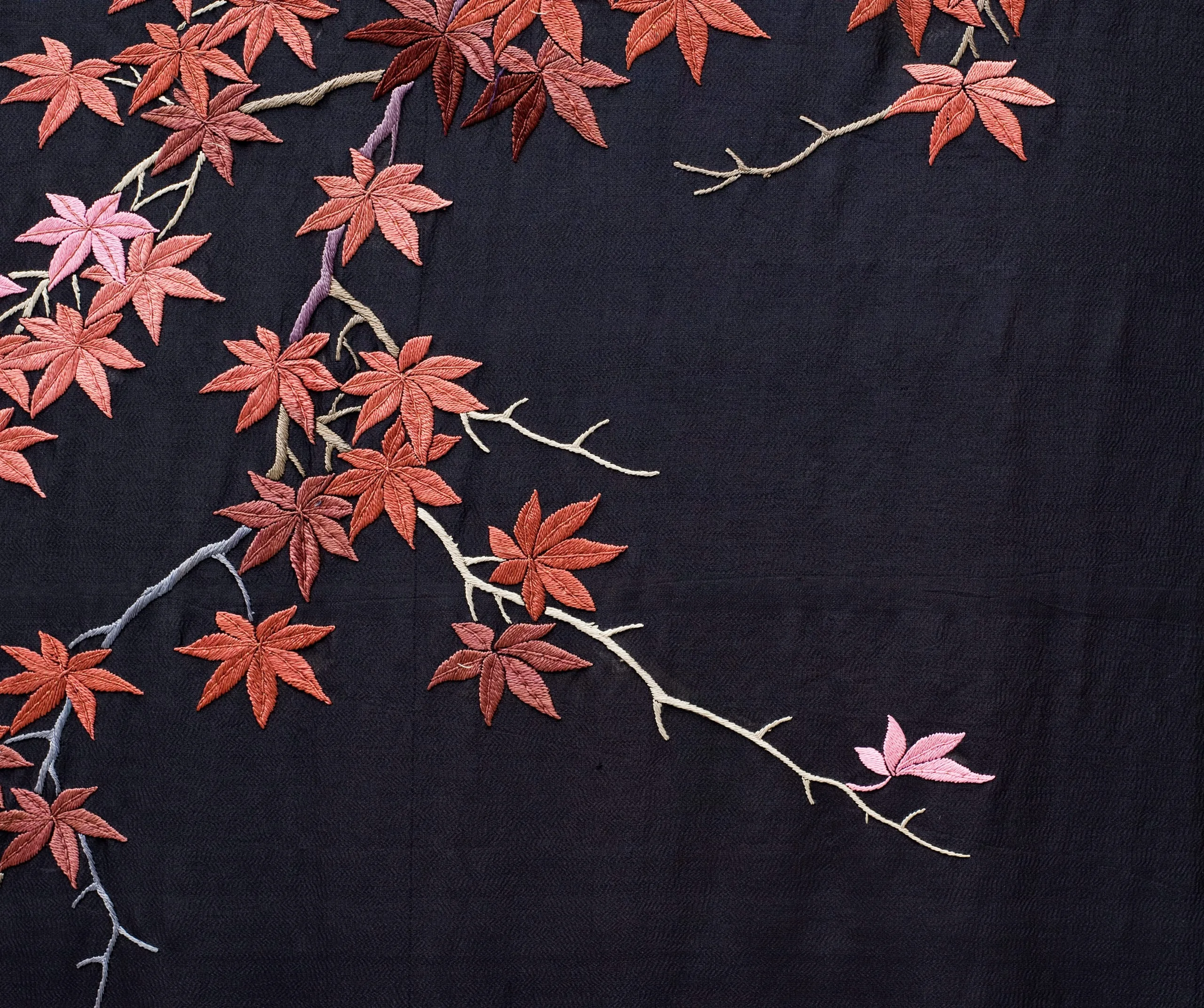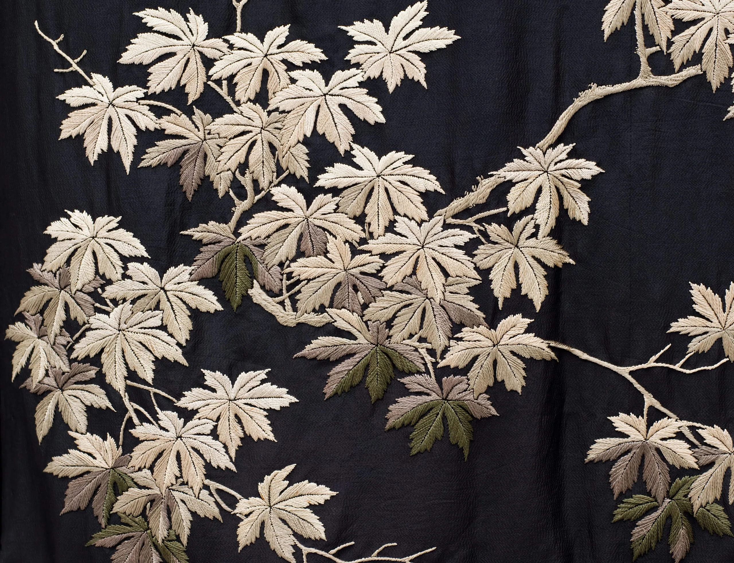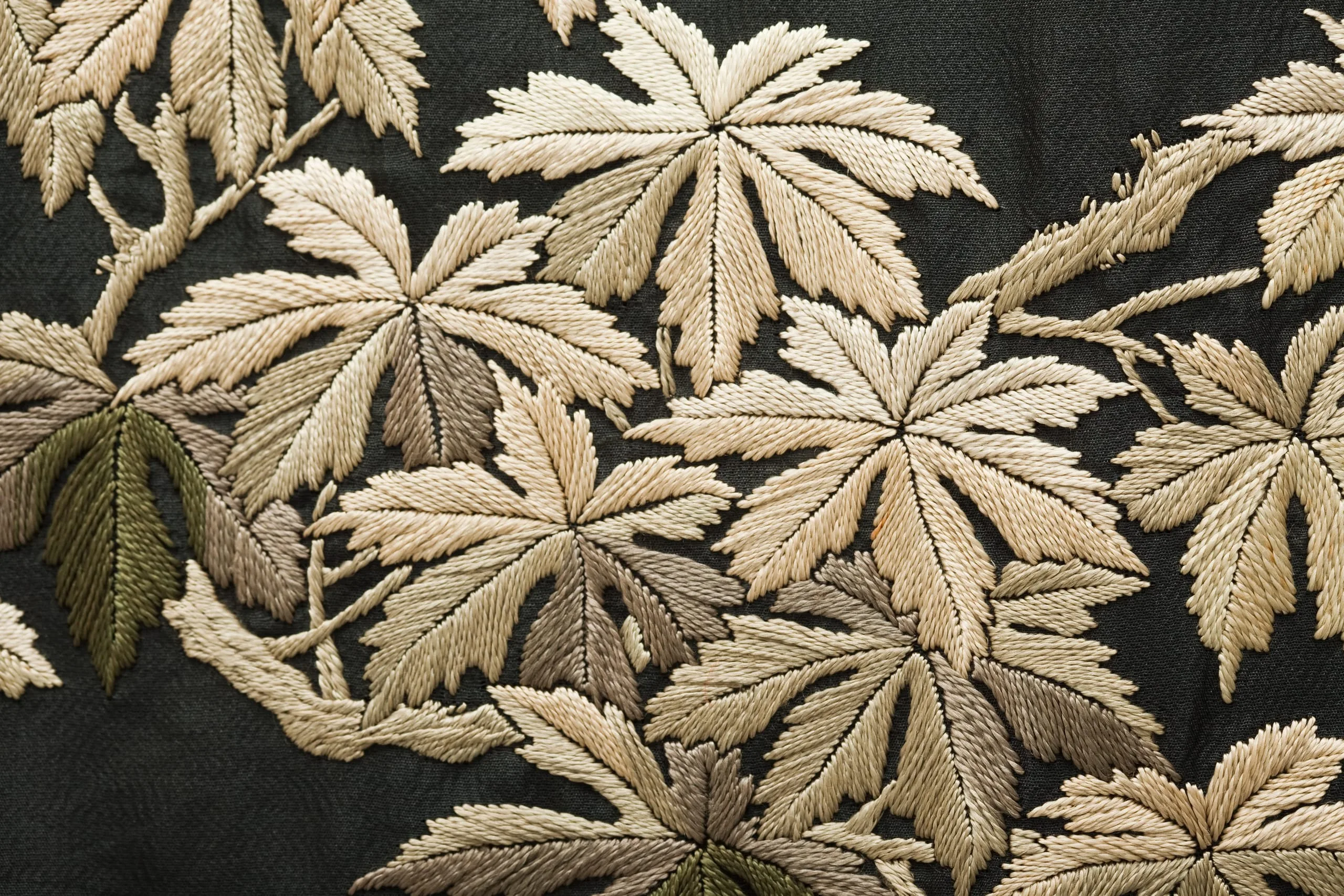 - Gown: silk crepe with silk embroidery; sash: silk plain weave with silk embroidery and silk knotted fringe