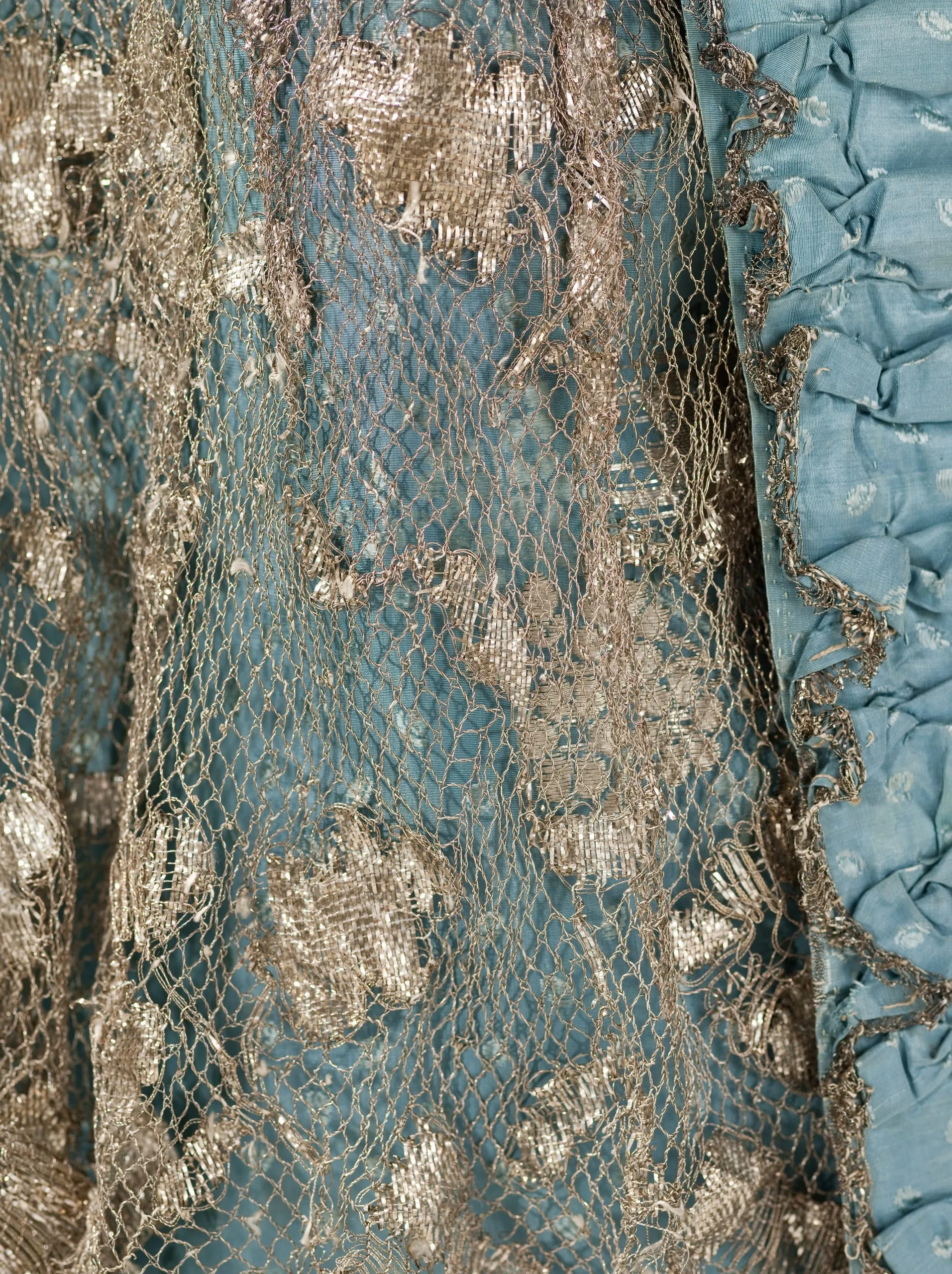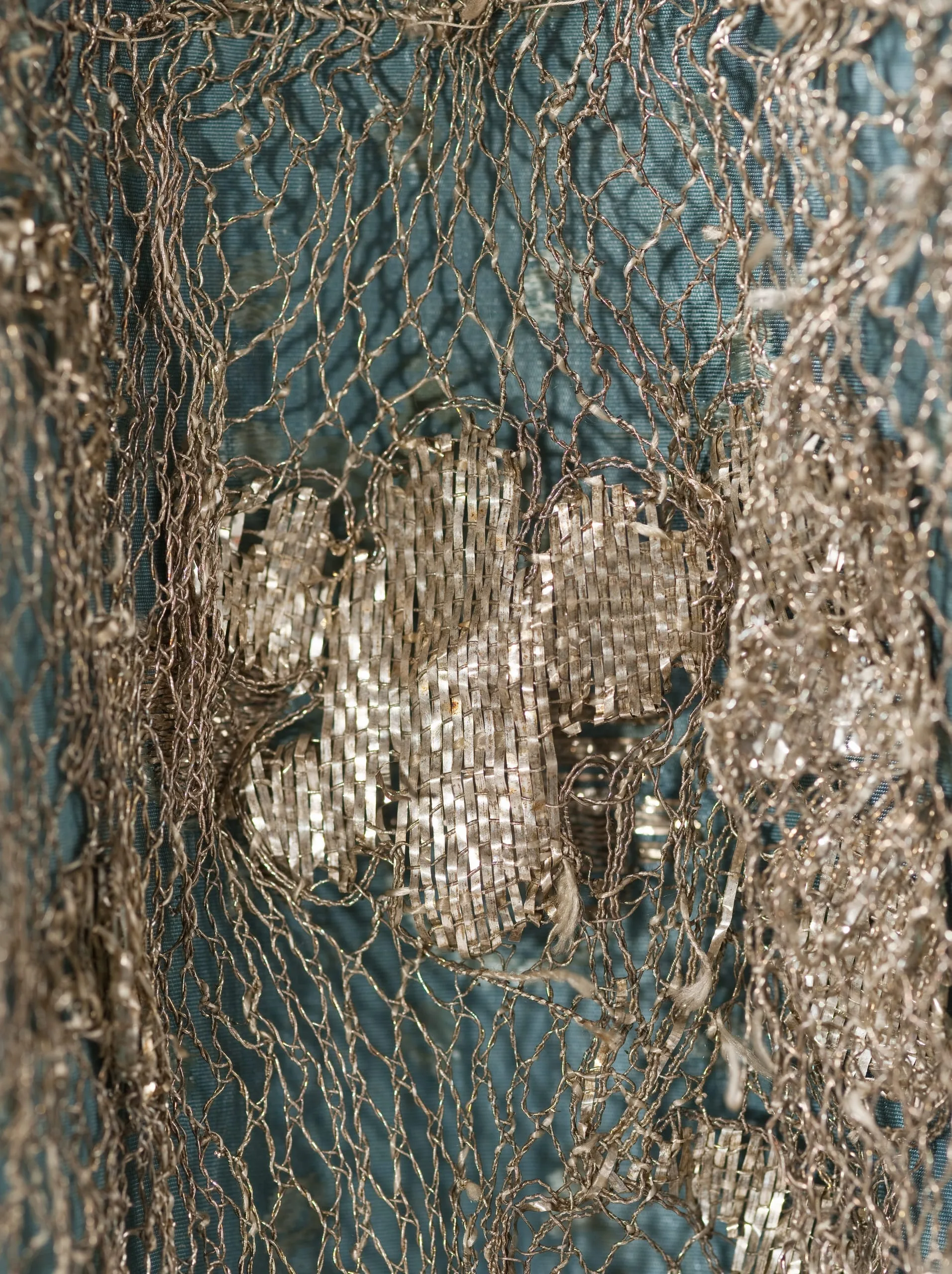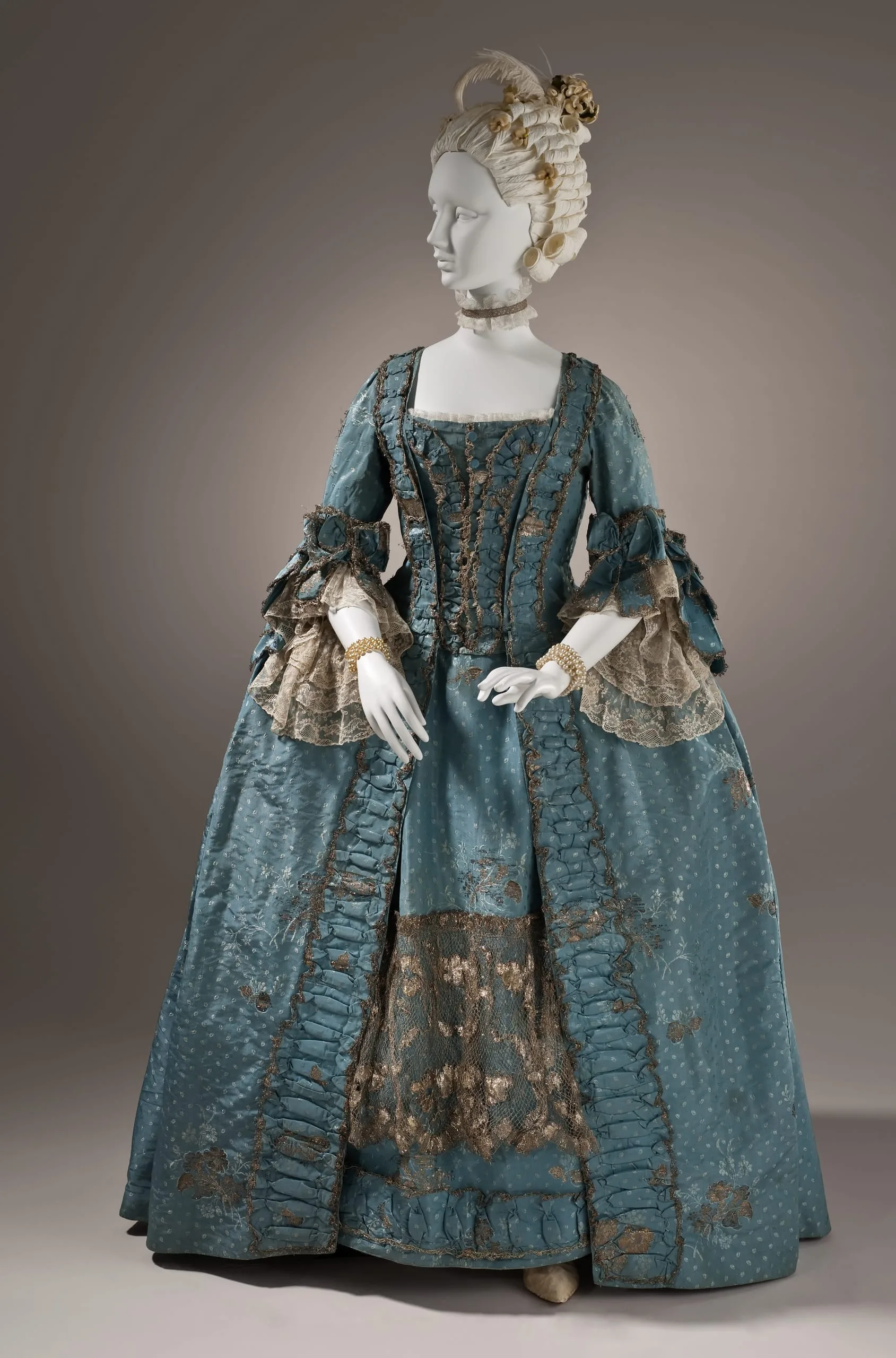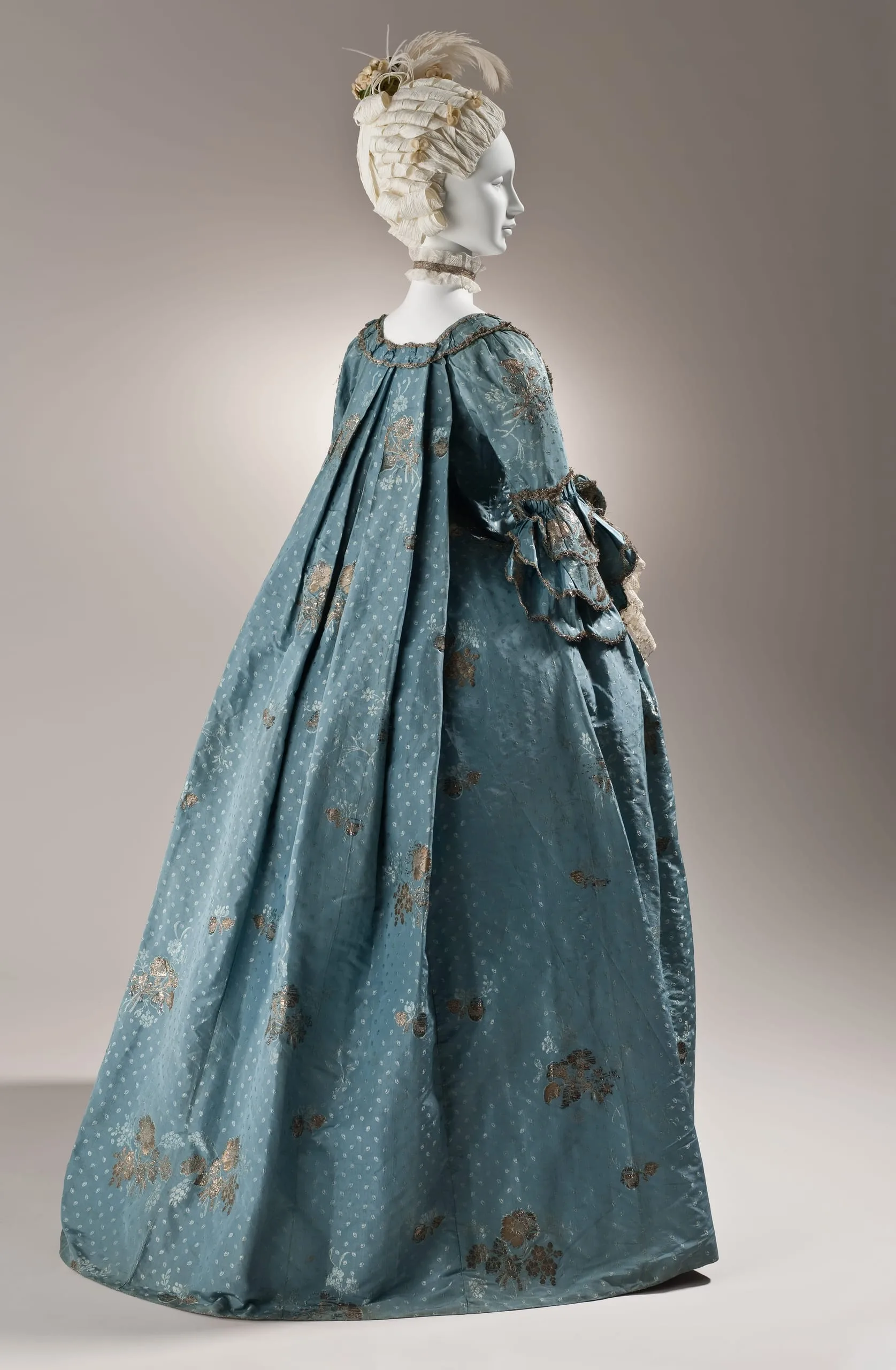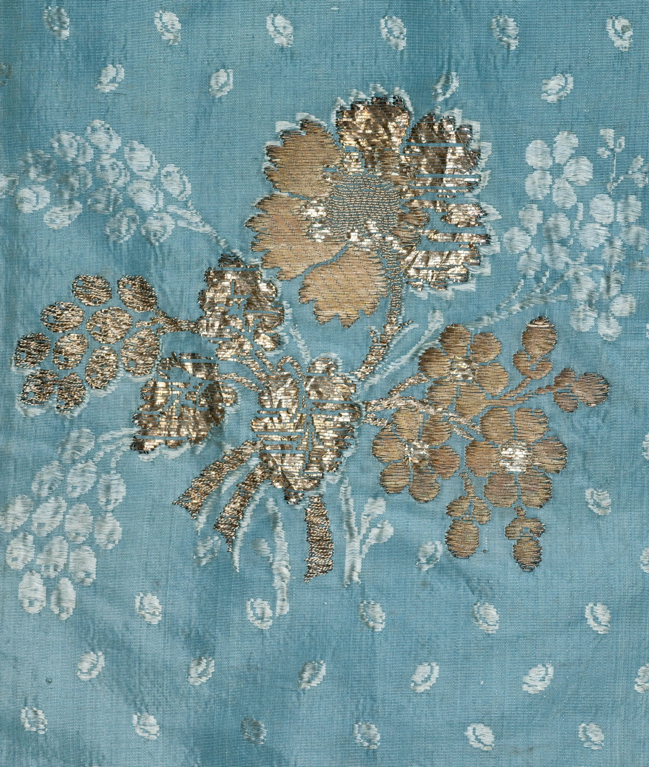 - Dress: Silk plain weave (faille) with silk and metallic-thread supplementary-weft patterning and metallic passementerie
