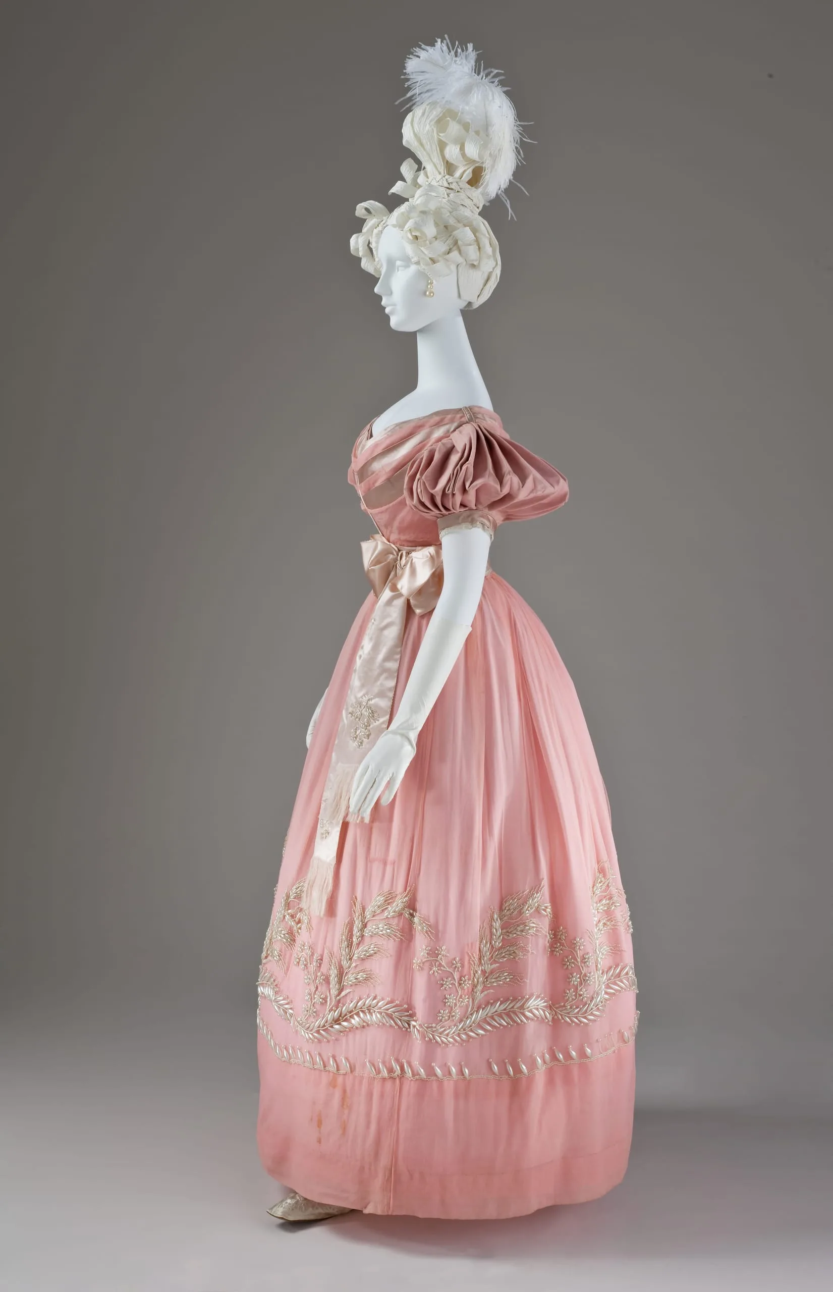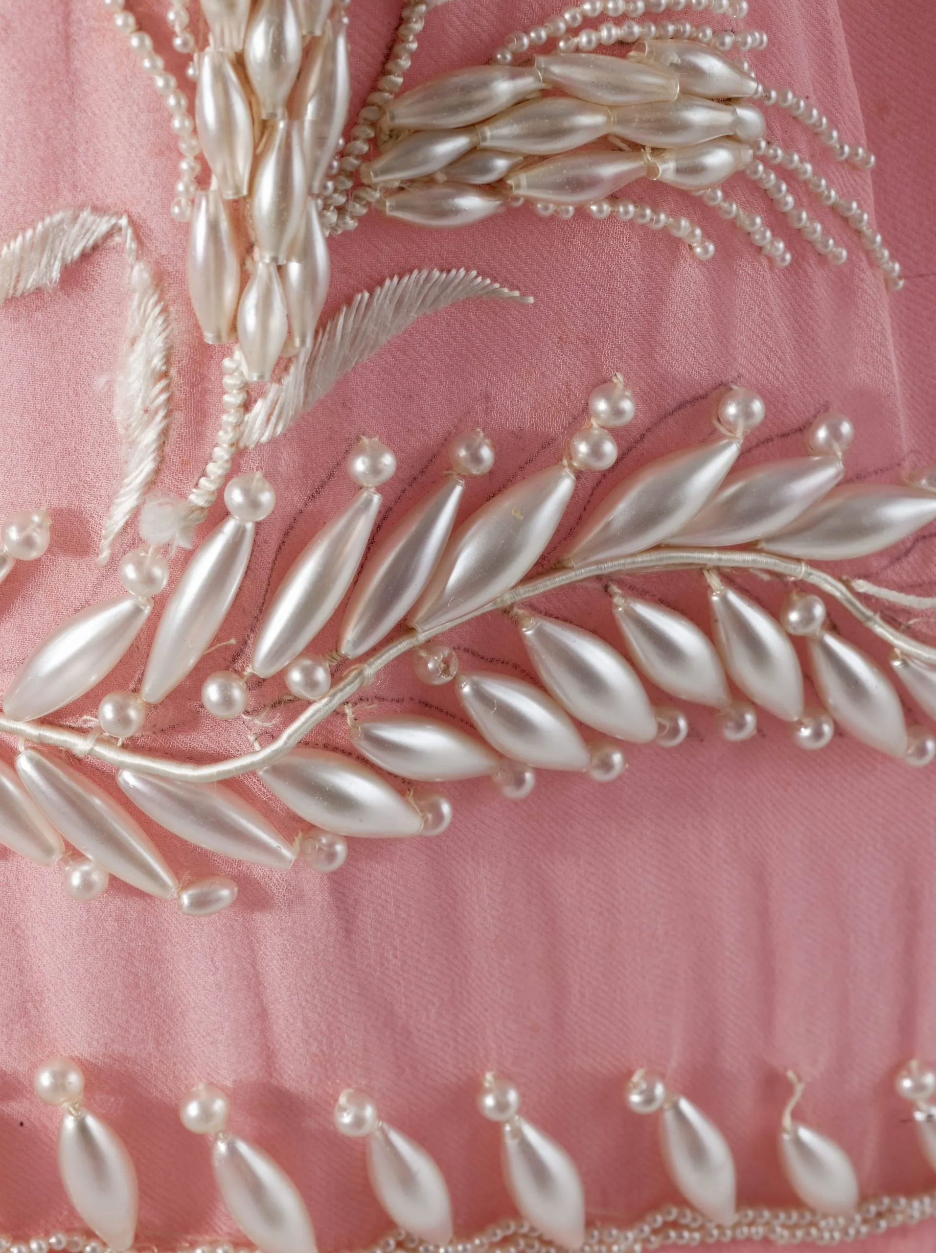- Silk plain weave (organza) and silk satin with imitation-pearl glass beads