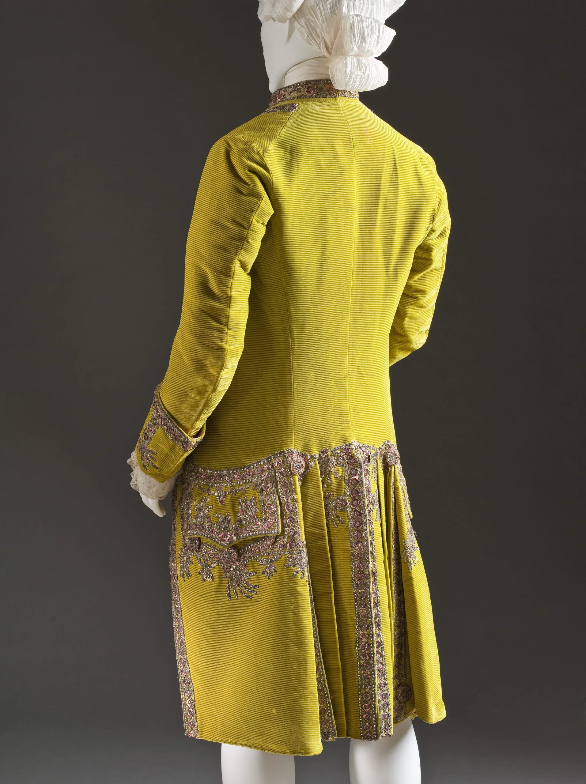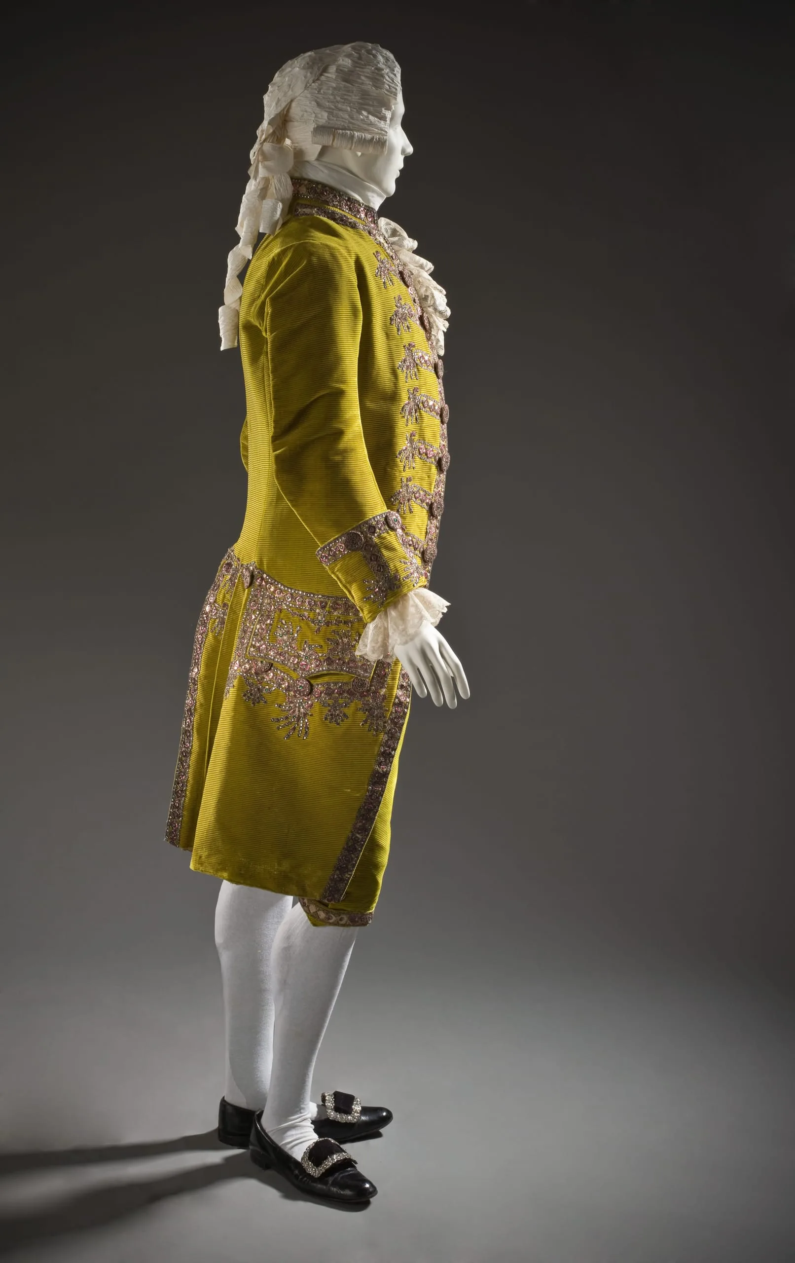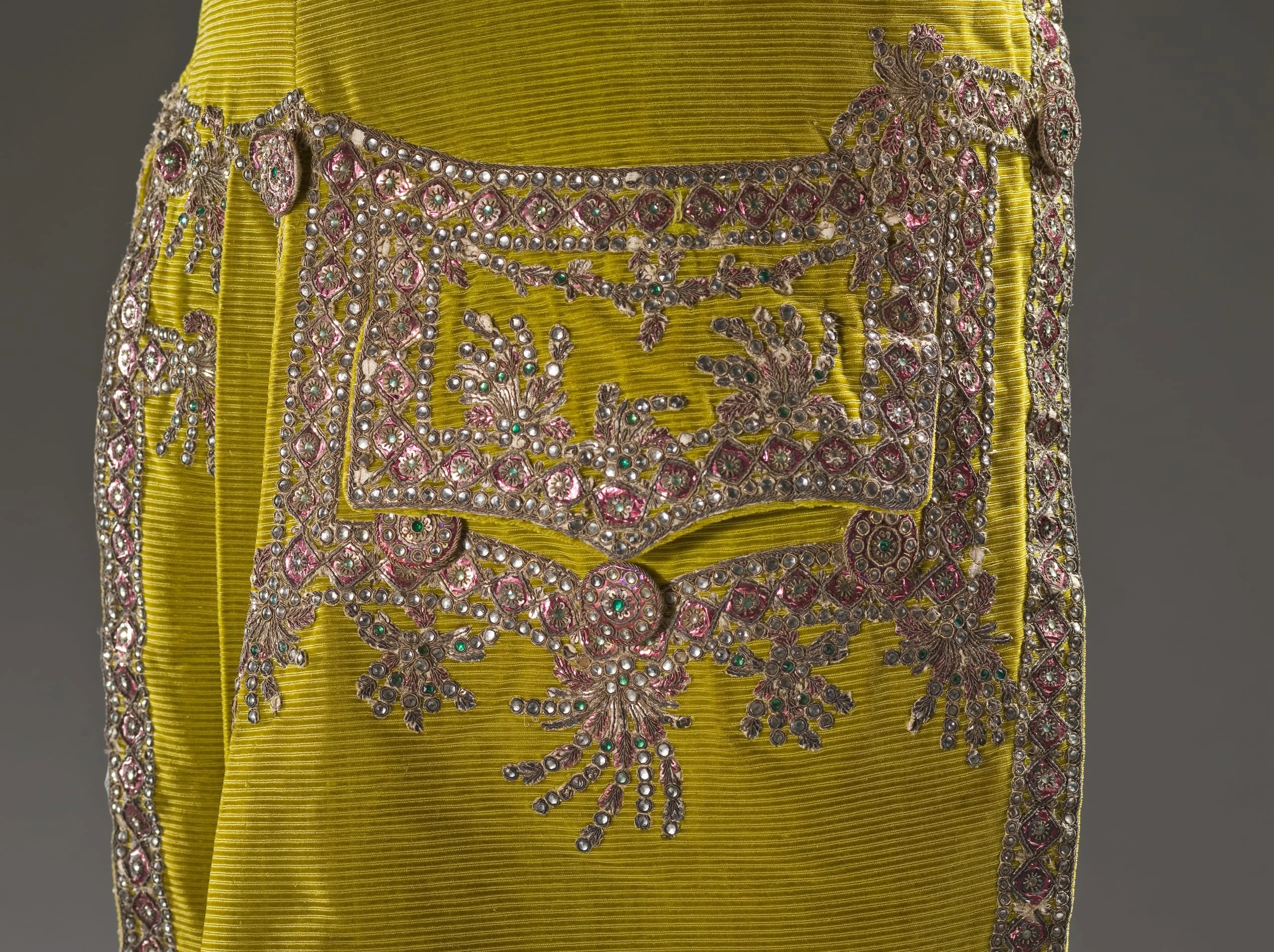 - Coat and breeches: silk cut and uncut velvet on twill foundation with paste stones, foil, sequins, and metallic-thread embroidered appliqués; waistcoat: silk satin with foil, sequins, and metallic-thread embroidery