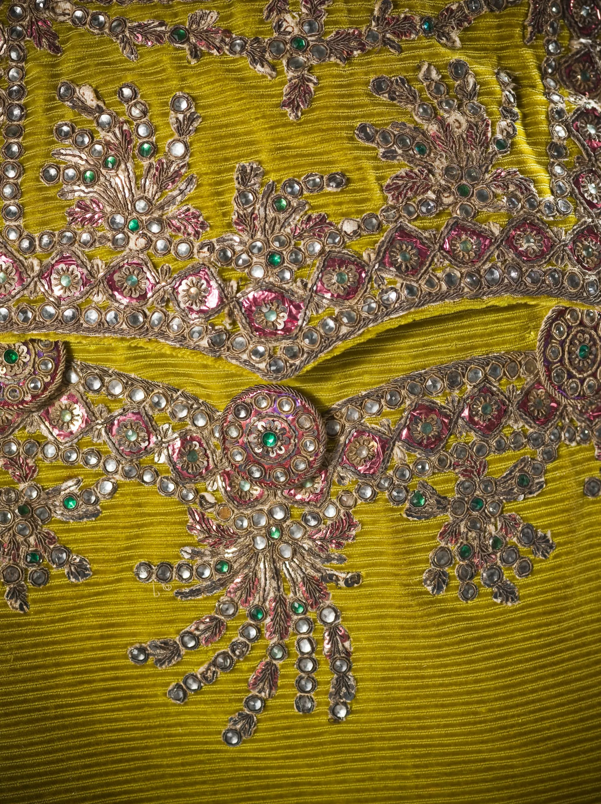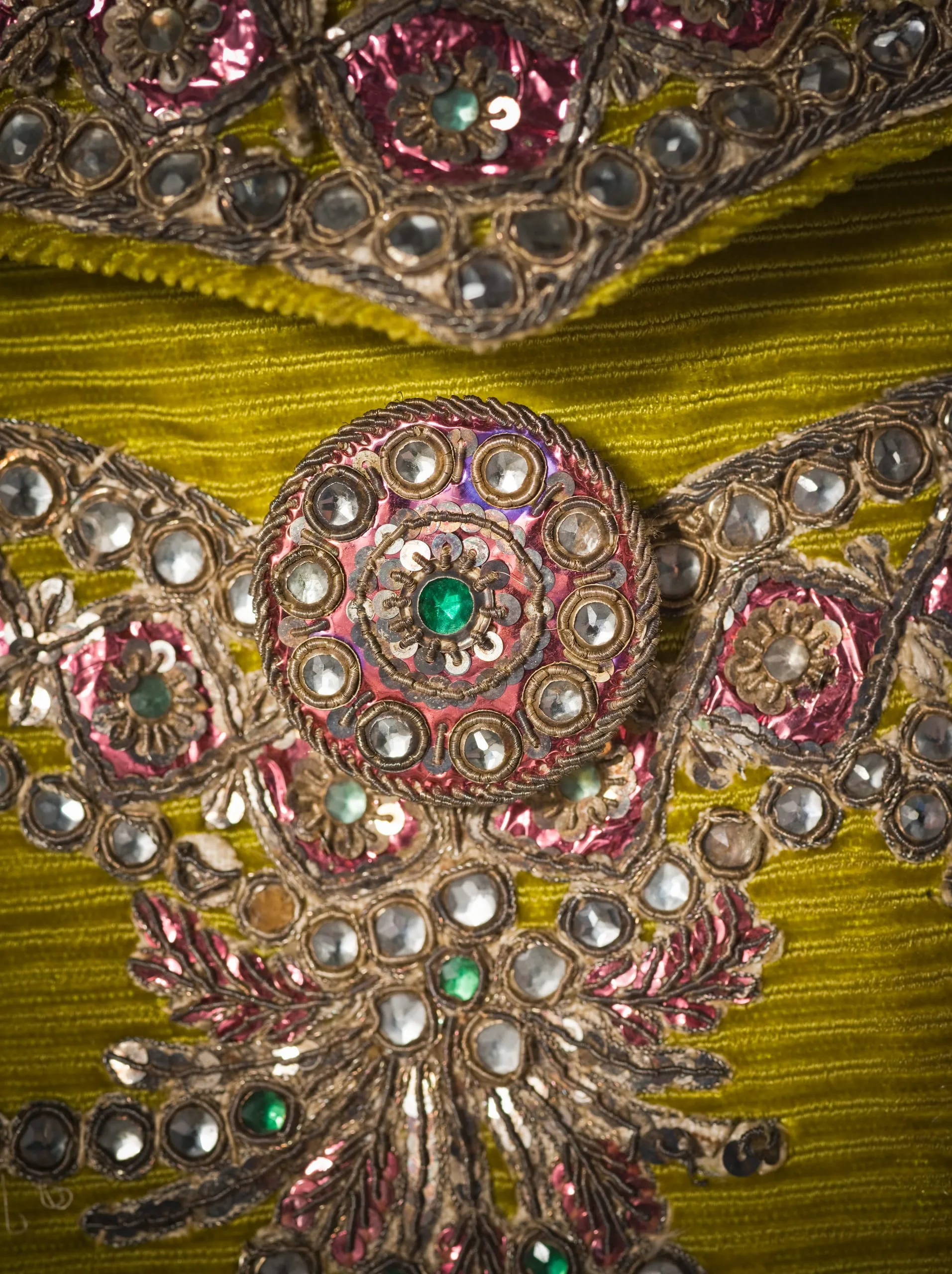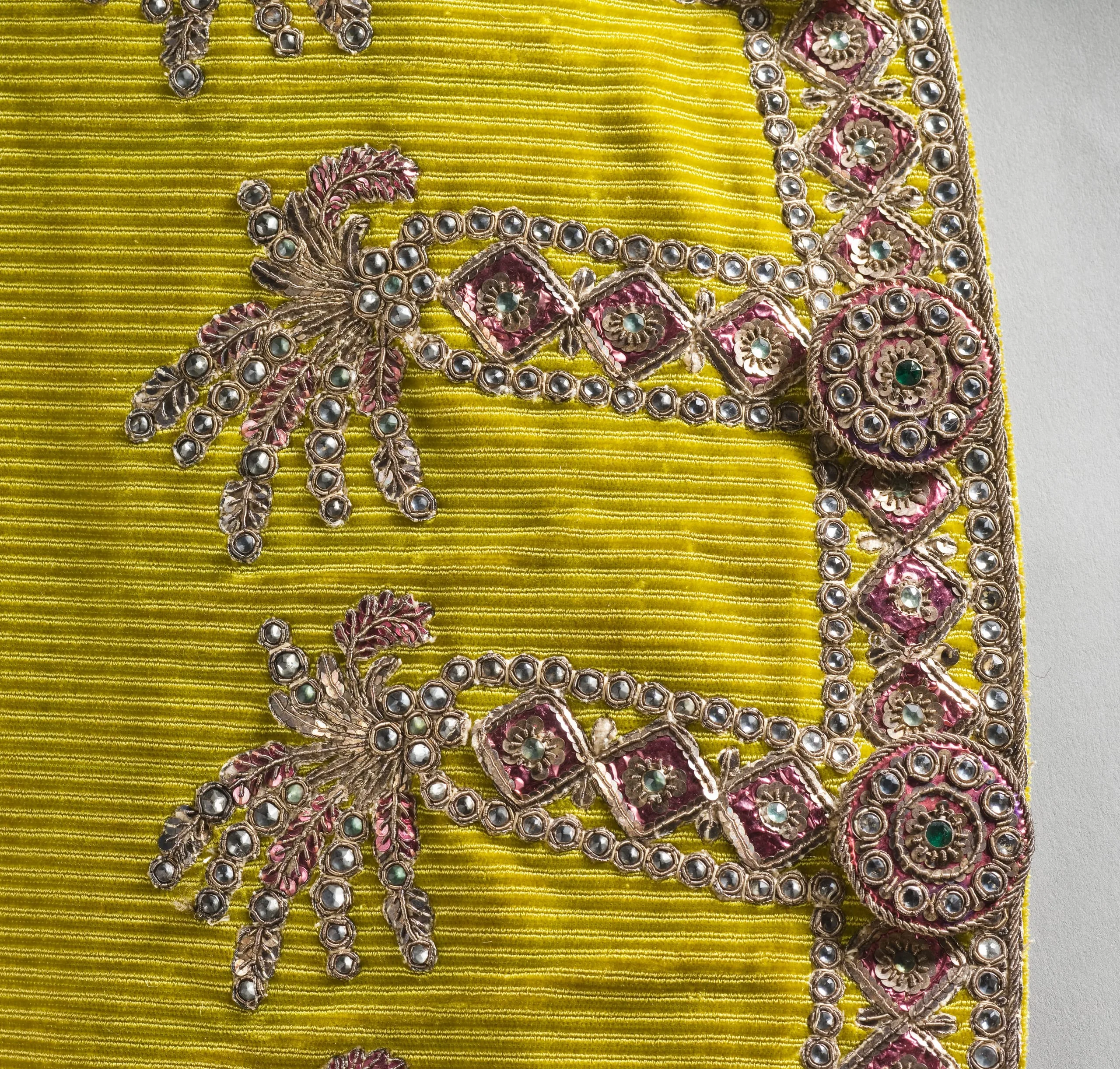 - Coat and breeches: silk cut and uncut velvet on twill foundation with paste stones, foil, sequins, and metallic-thread embroidered appliqués; waistcoat: silk satin with foil, sequins, and metallic-thread embroidery