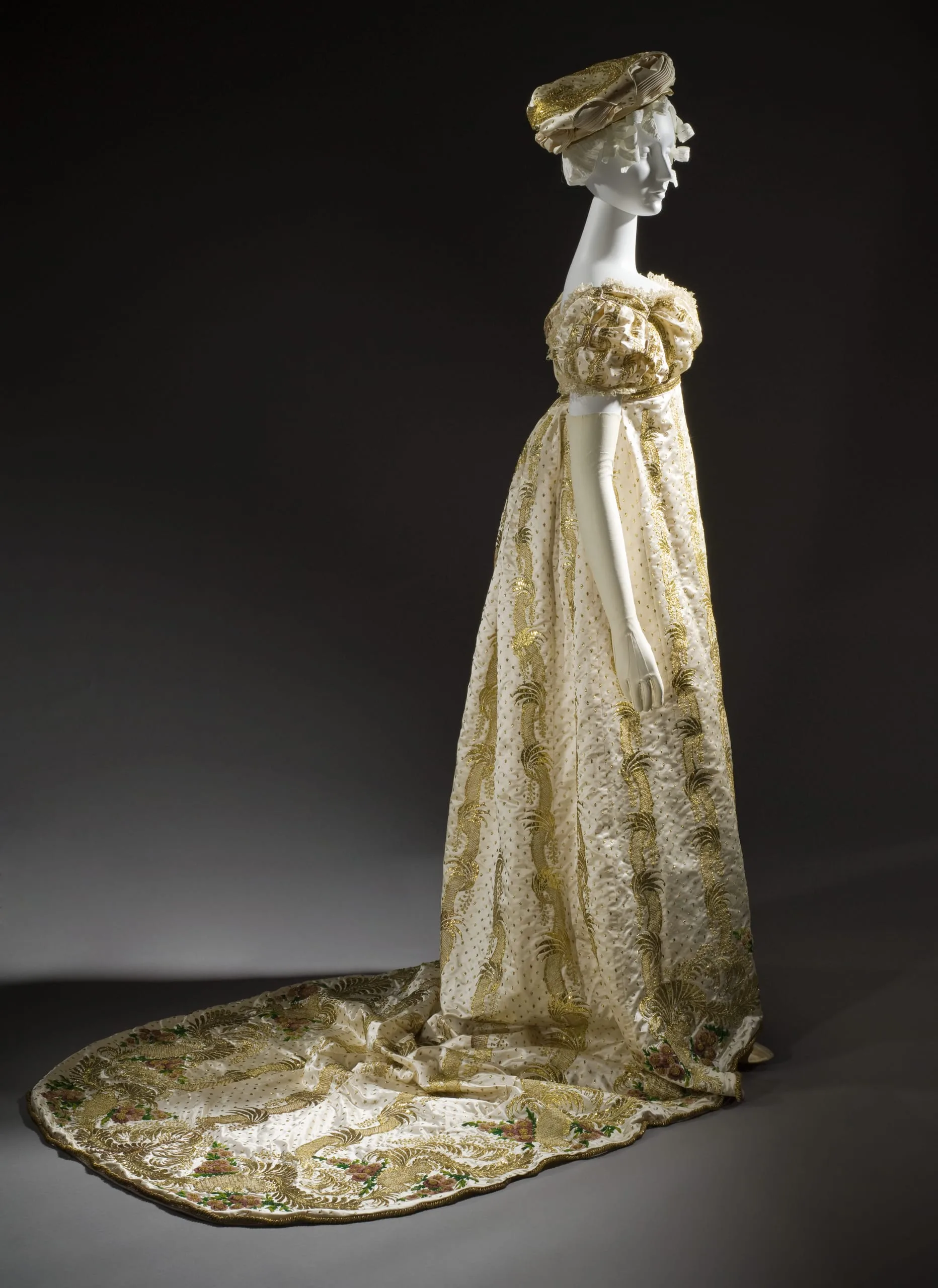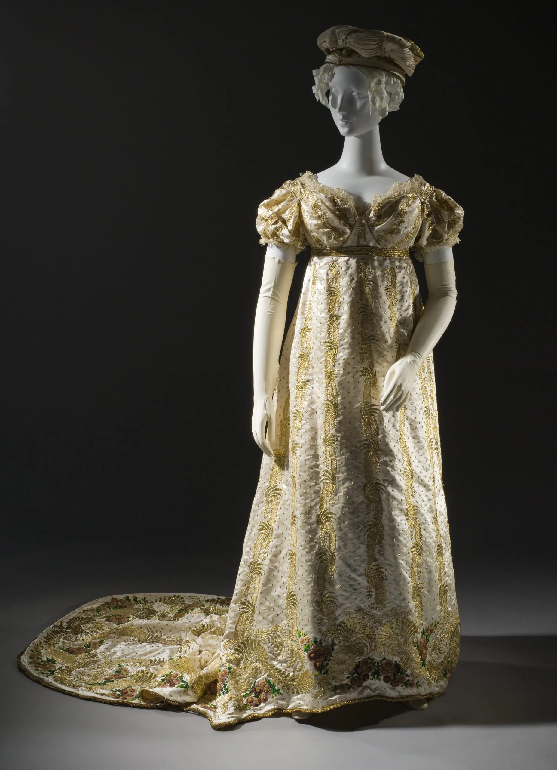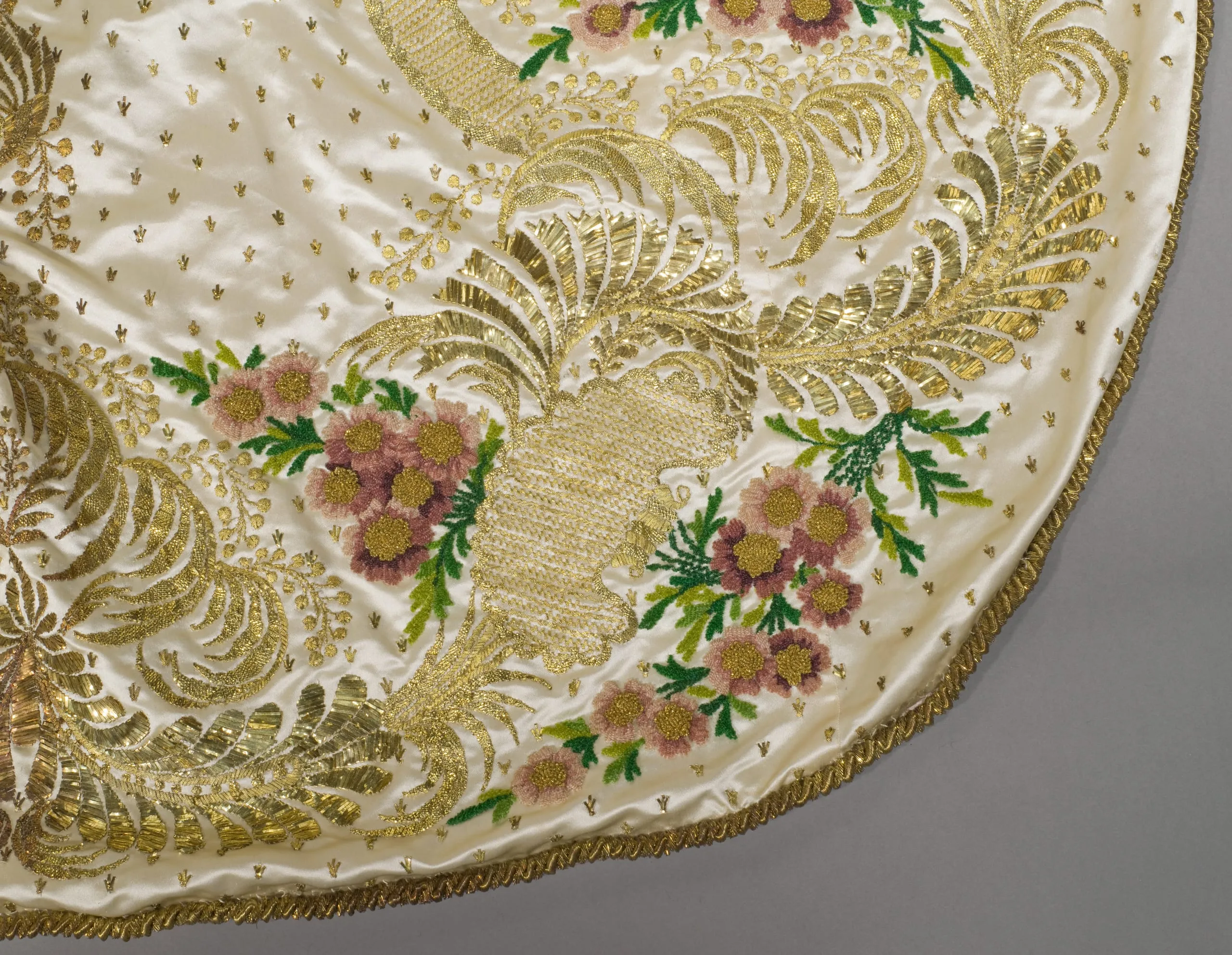 - Dress: silk satin with silk chenille, and metallic strip embroidery, metallic coil cord, and silk lace