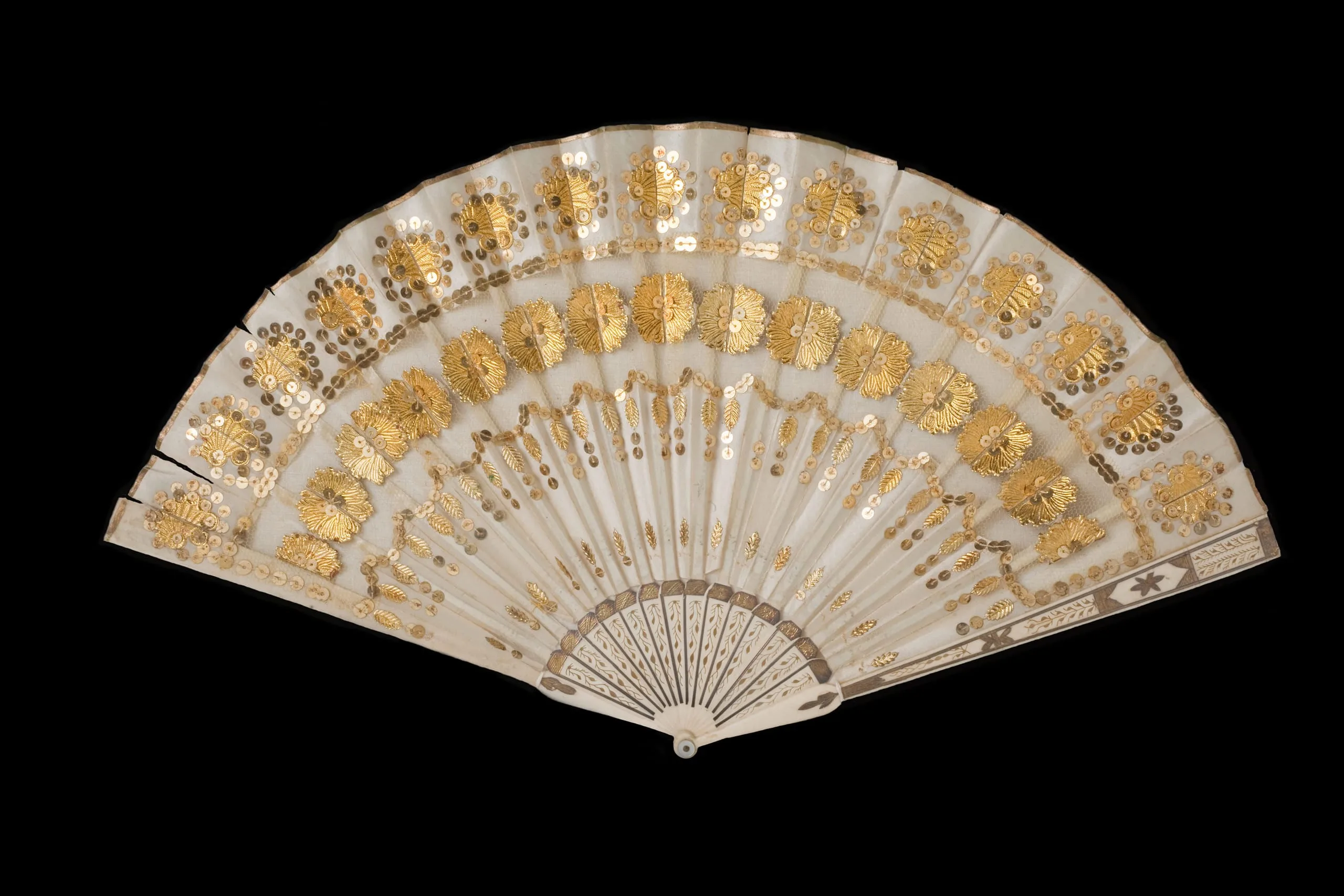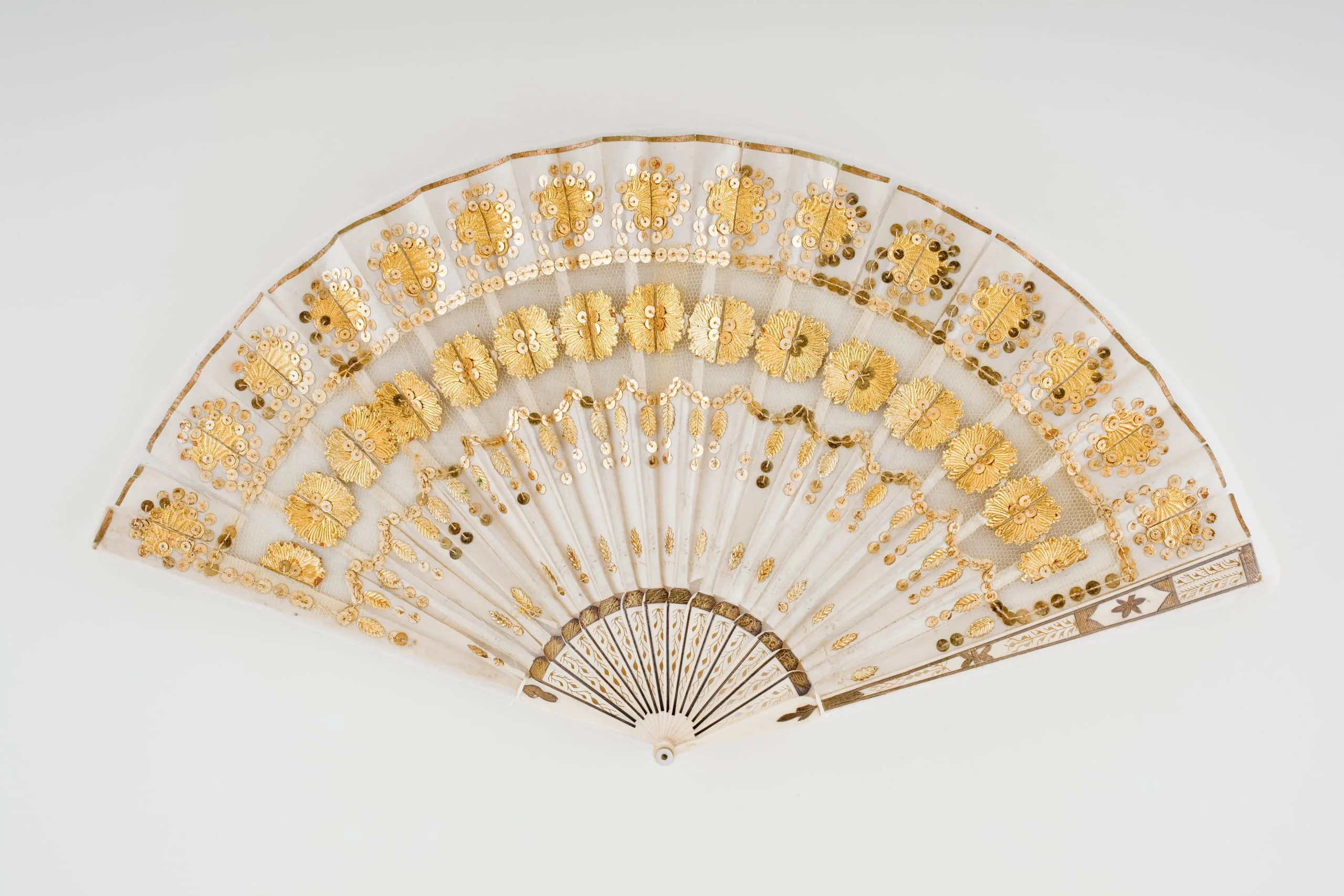 Fan: Silk satin and silk net with foil and sequins
