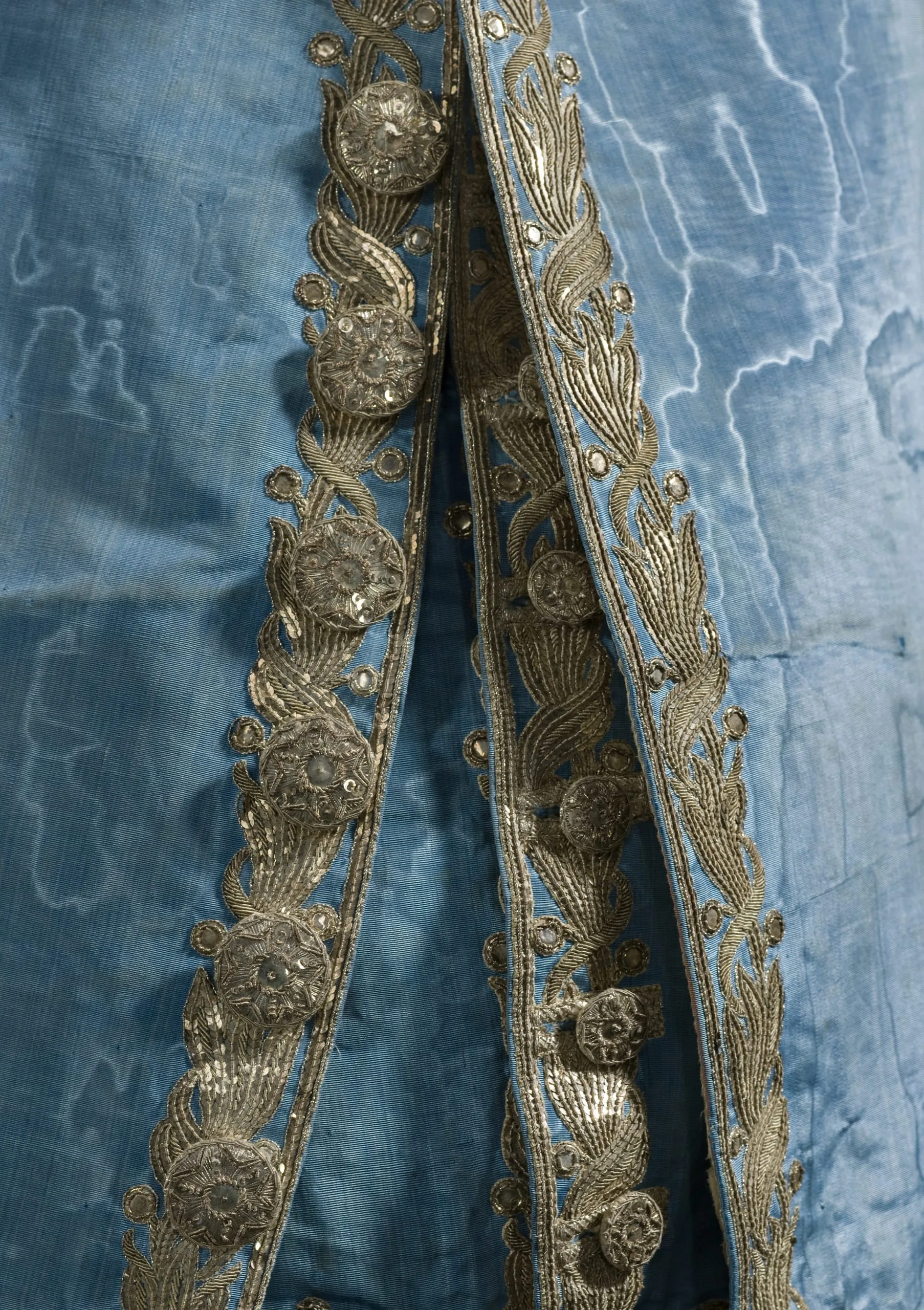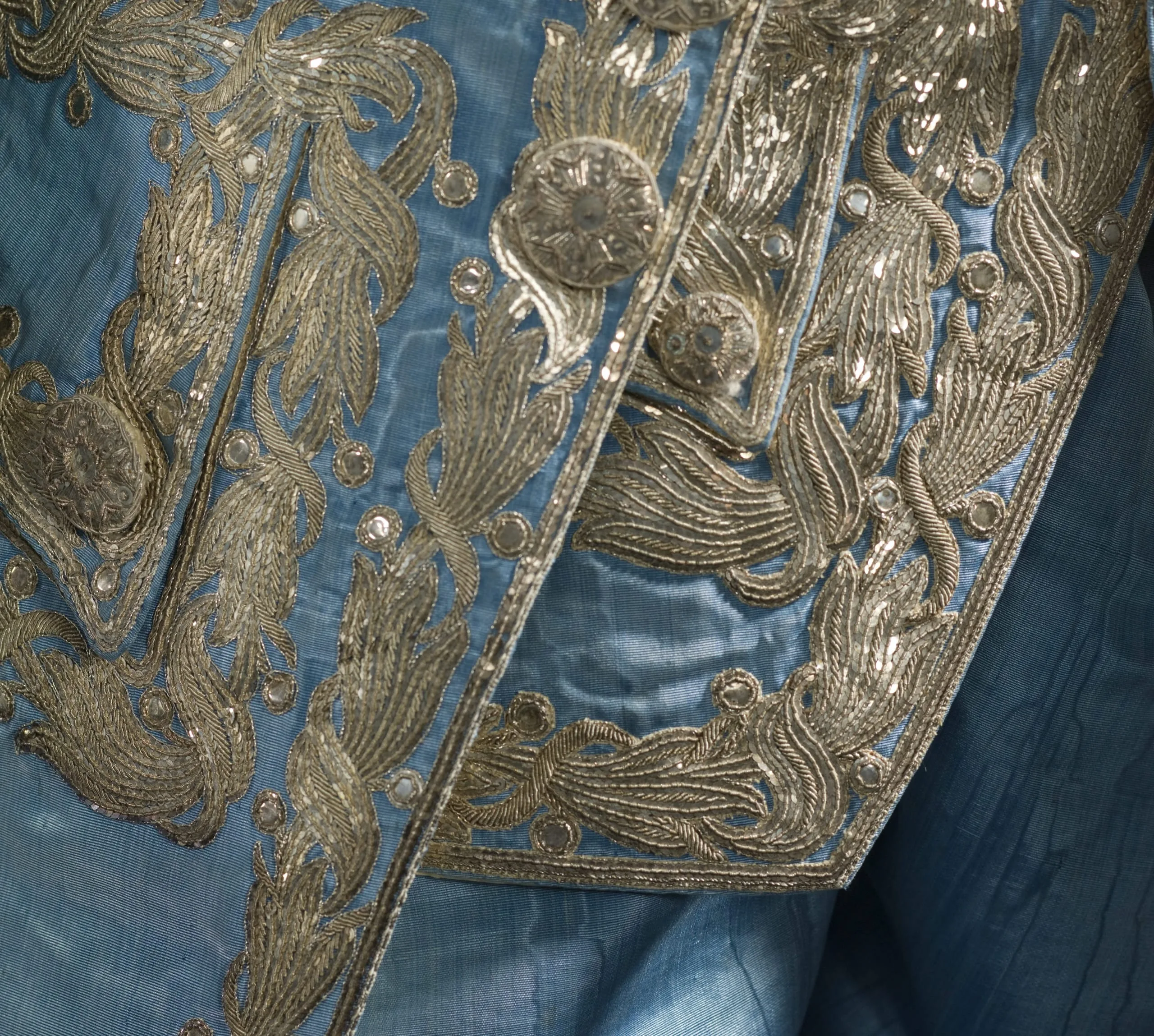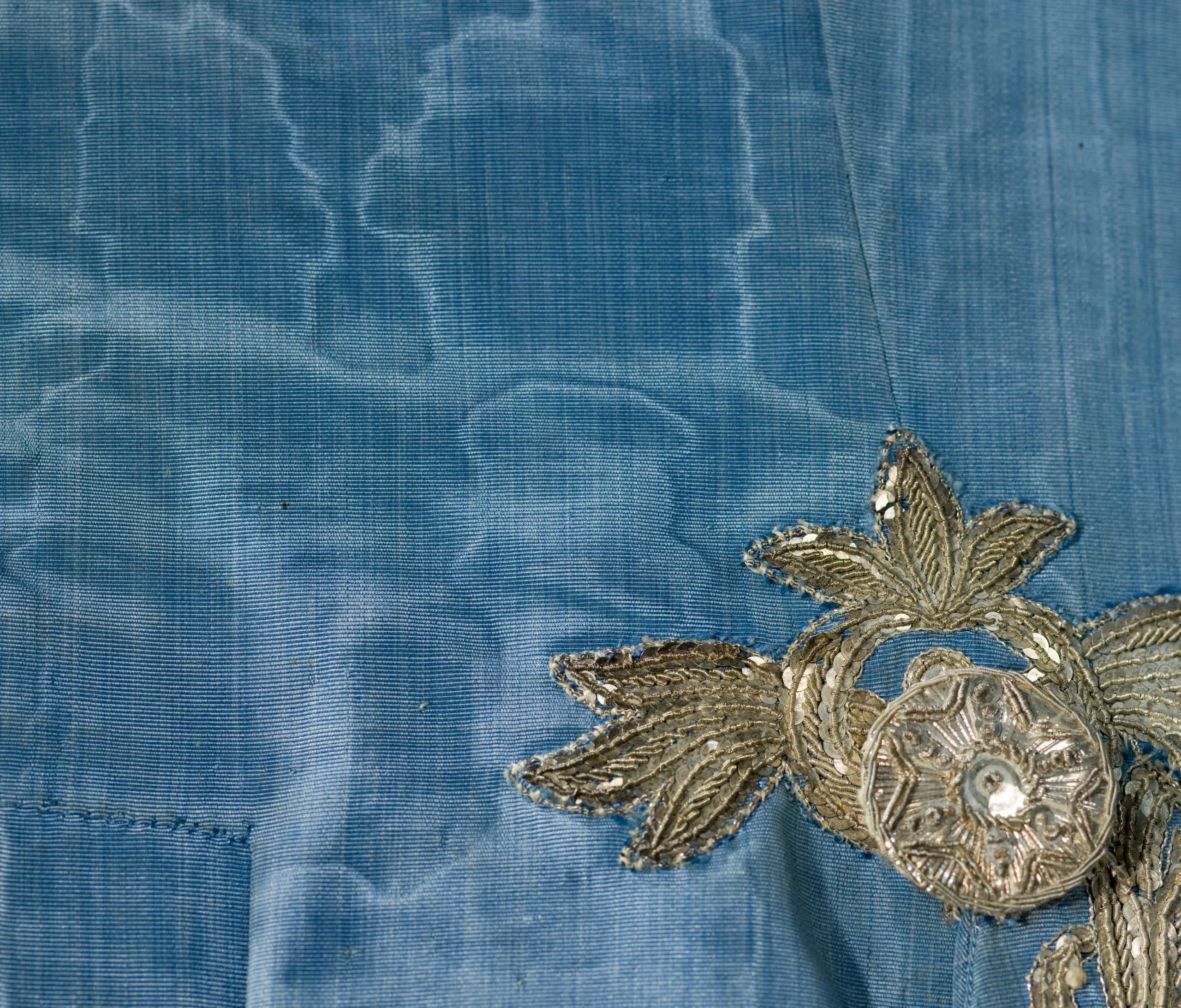 - Silk plain weave (faille), moiré finish, with sequins and metallic-thread embroidery