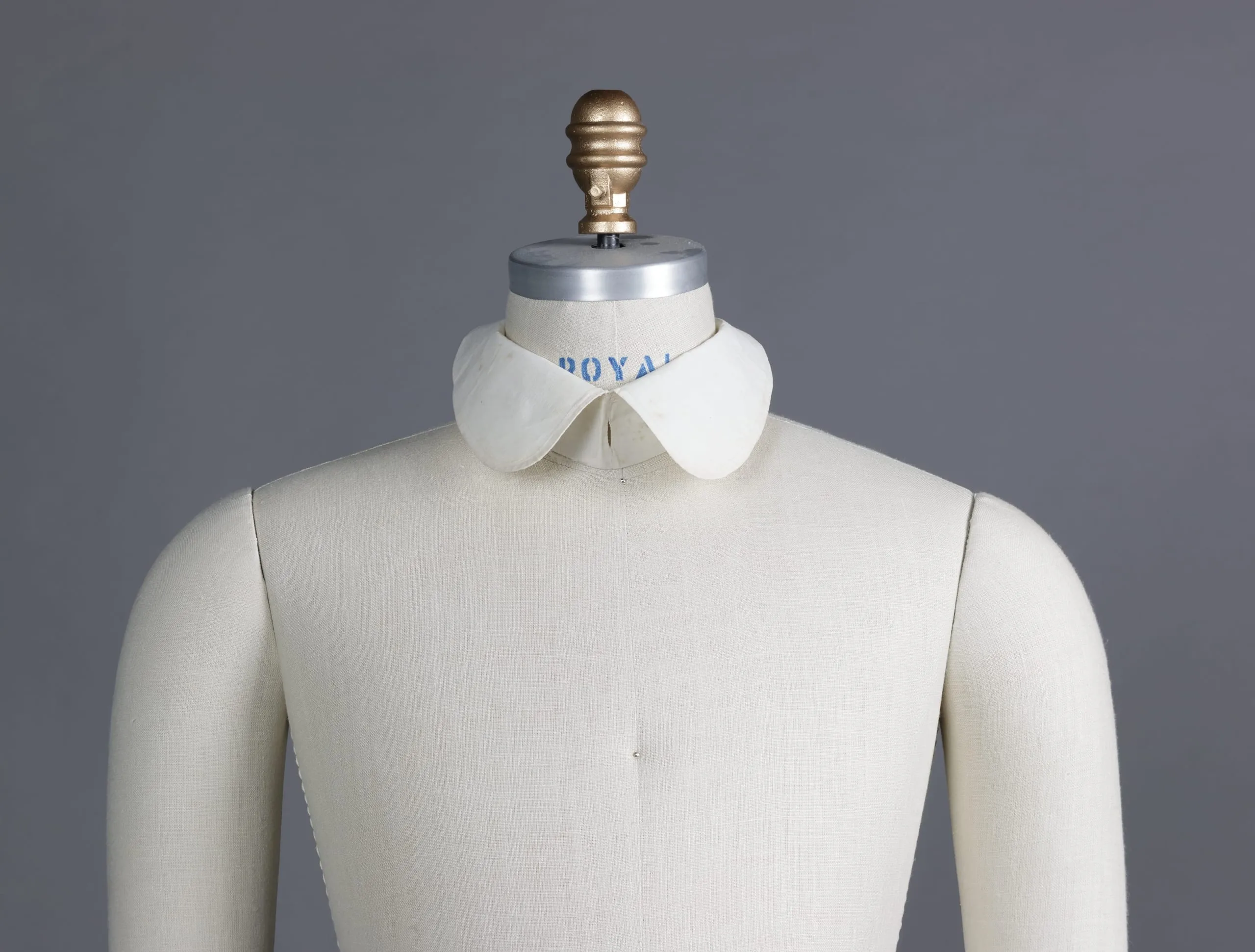 White fabric detached collar with wide rounded points displayed on a linen dressmaker's mannequin, with blue stenciled text reading "ROYAL" across the neckline