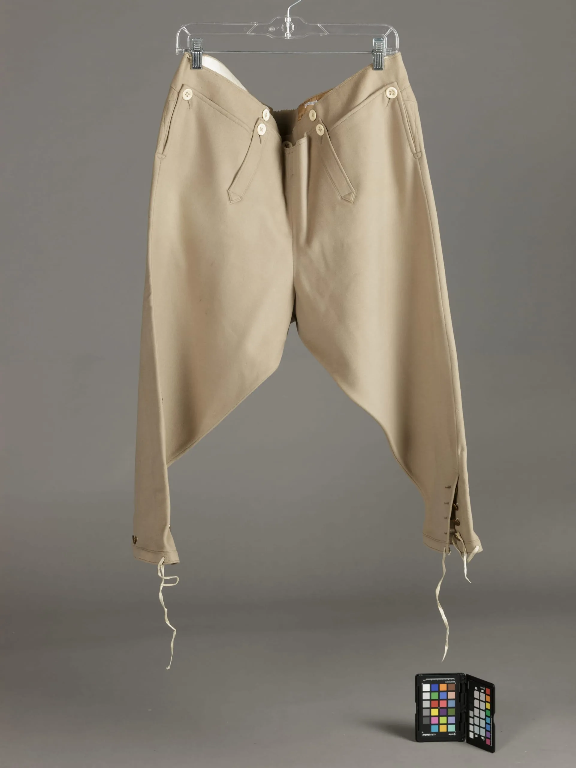 Khaki-beige fall-front breeches hanging on a clear hanger, with cream button closures at the waist and fabric ties at the knee hems